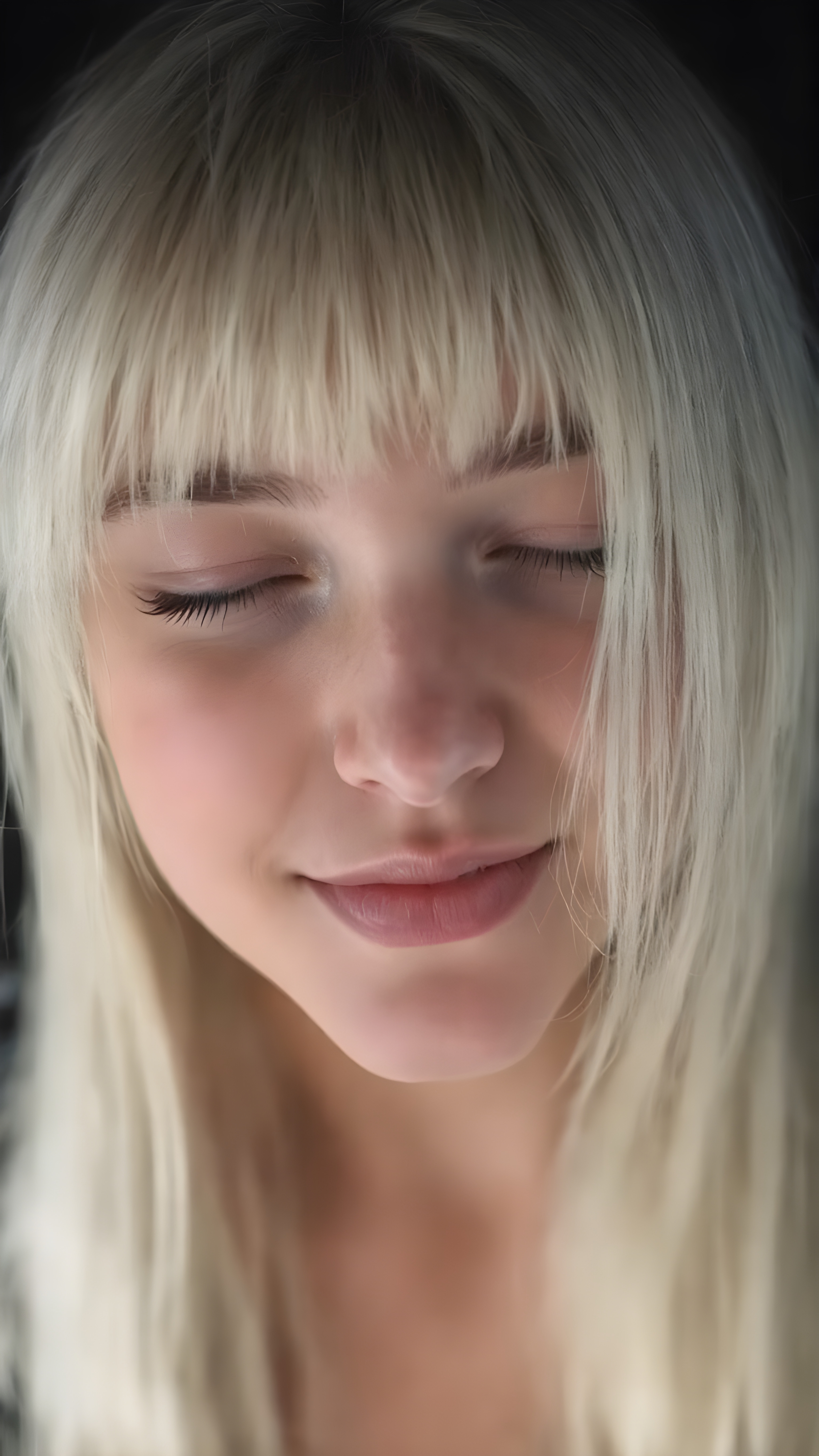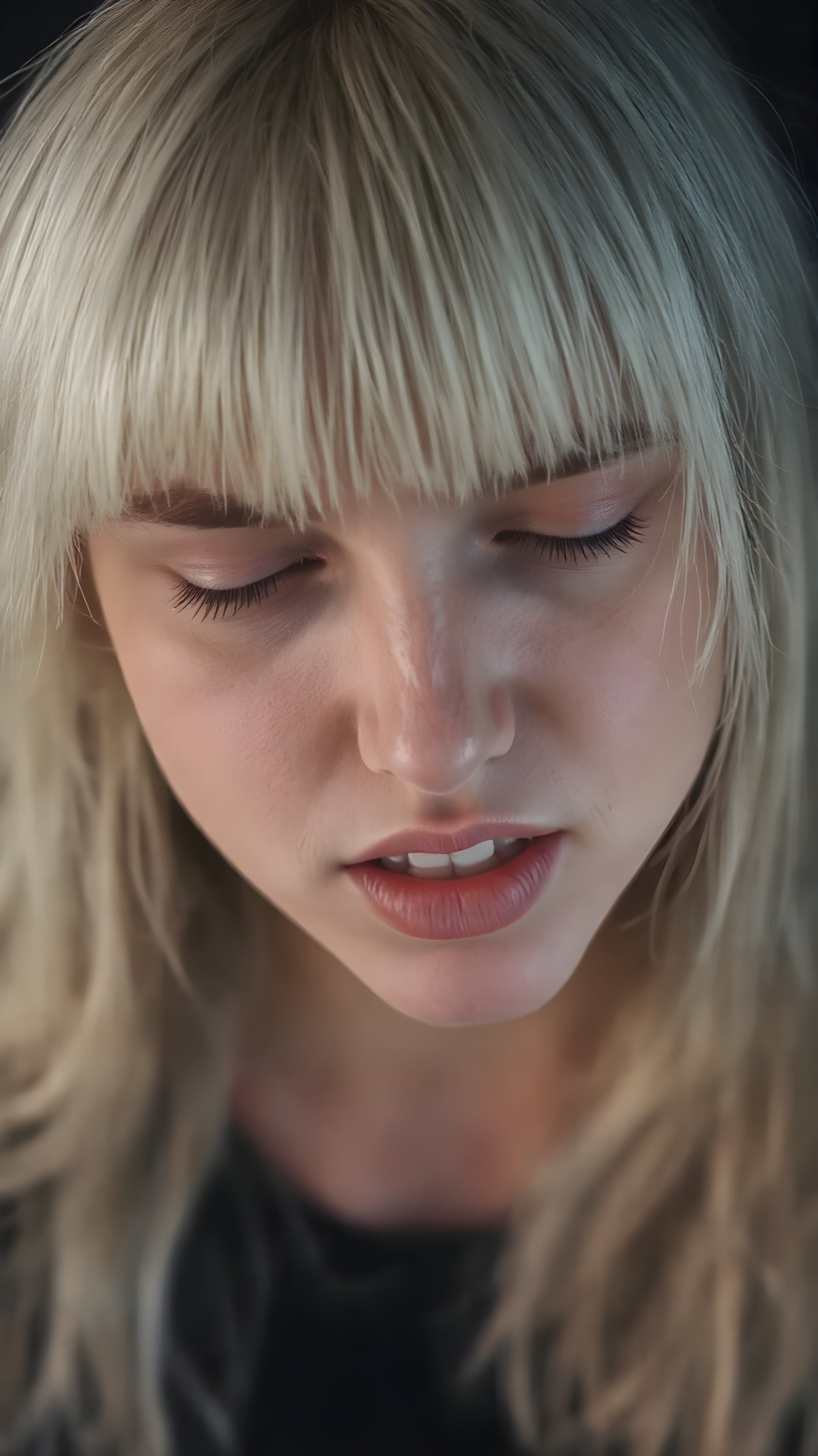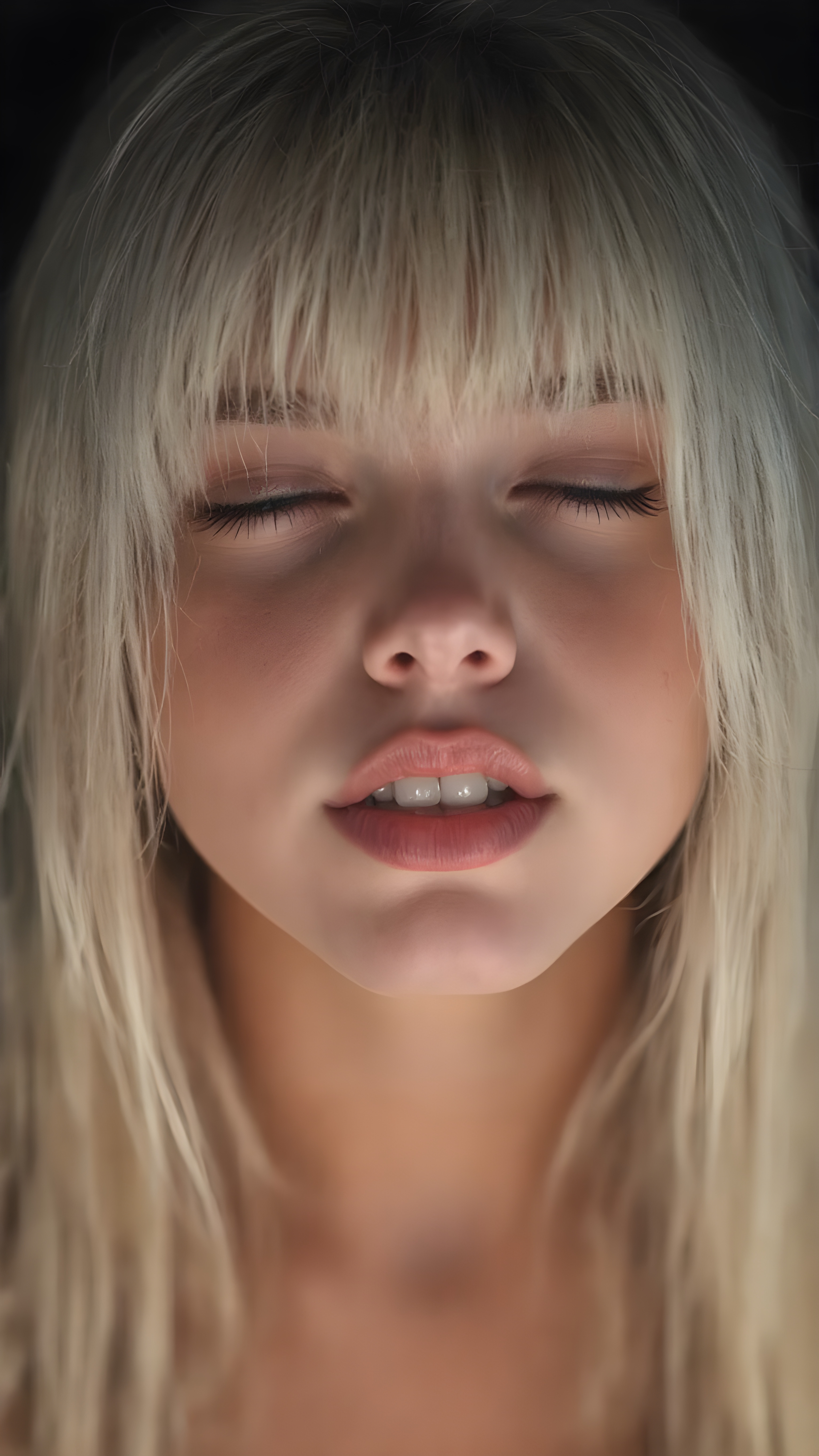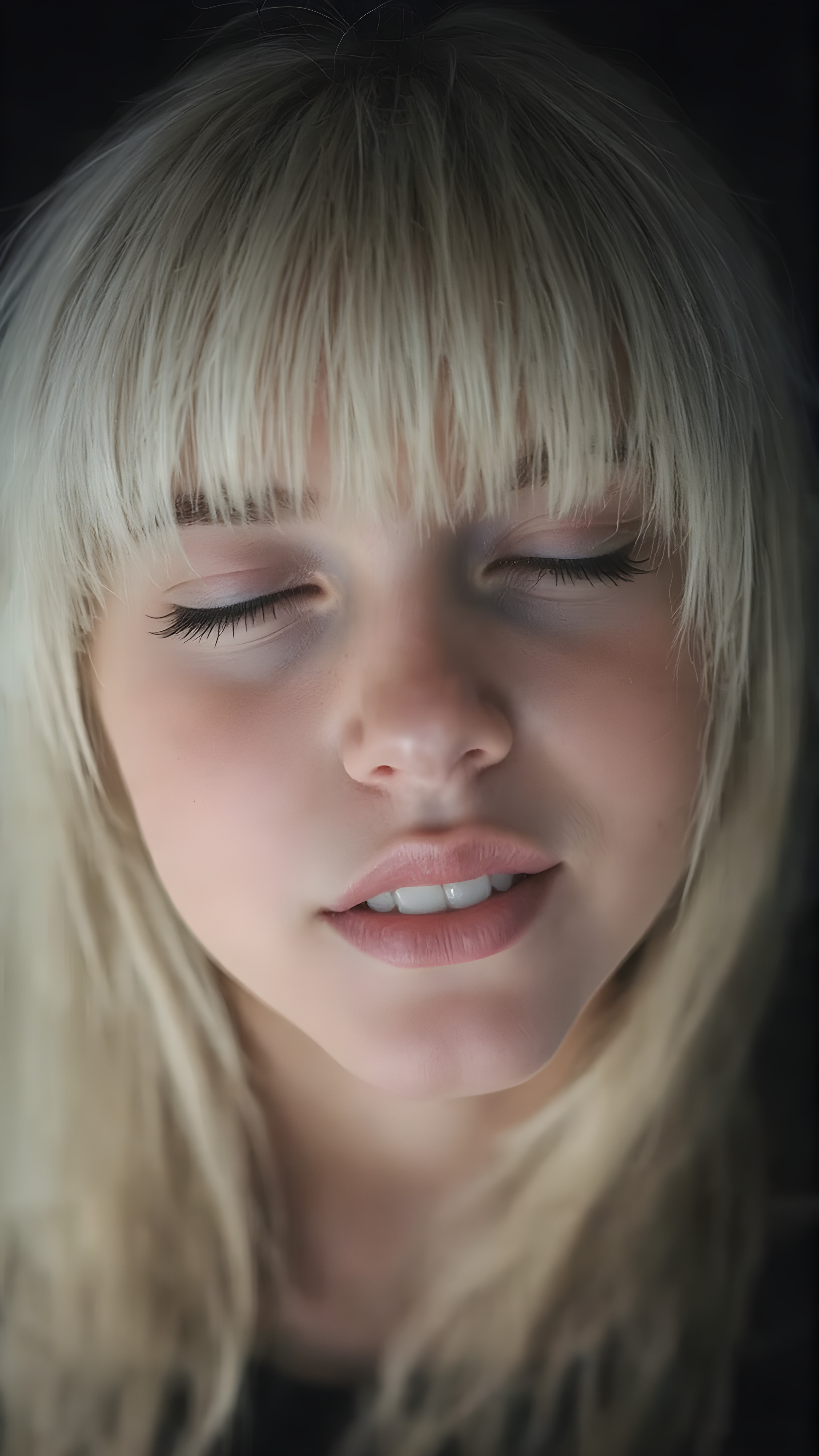 a fantastic stunning gorgeous teen girl, long straight soft white hair, bangs, view from above, she looks seductive up to the viewer, white teeth, closed eyes, black backdrop, perfect light and shadows
