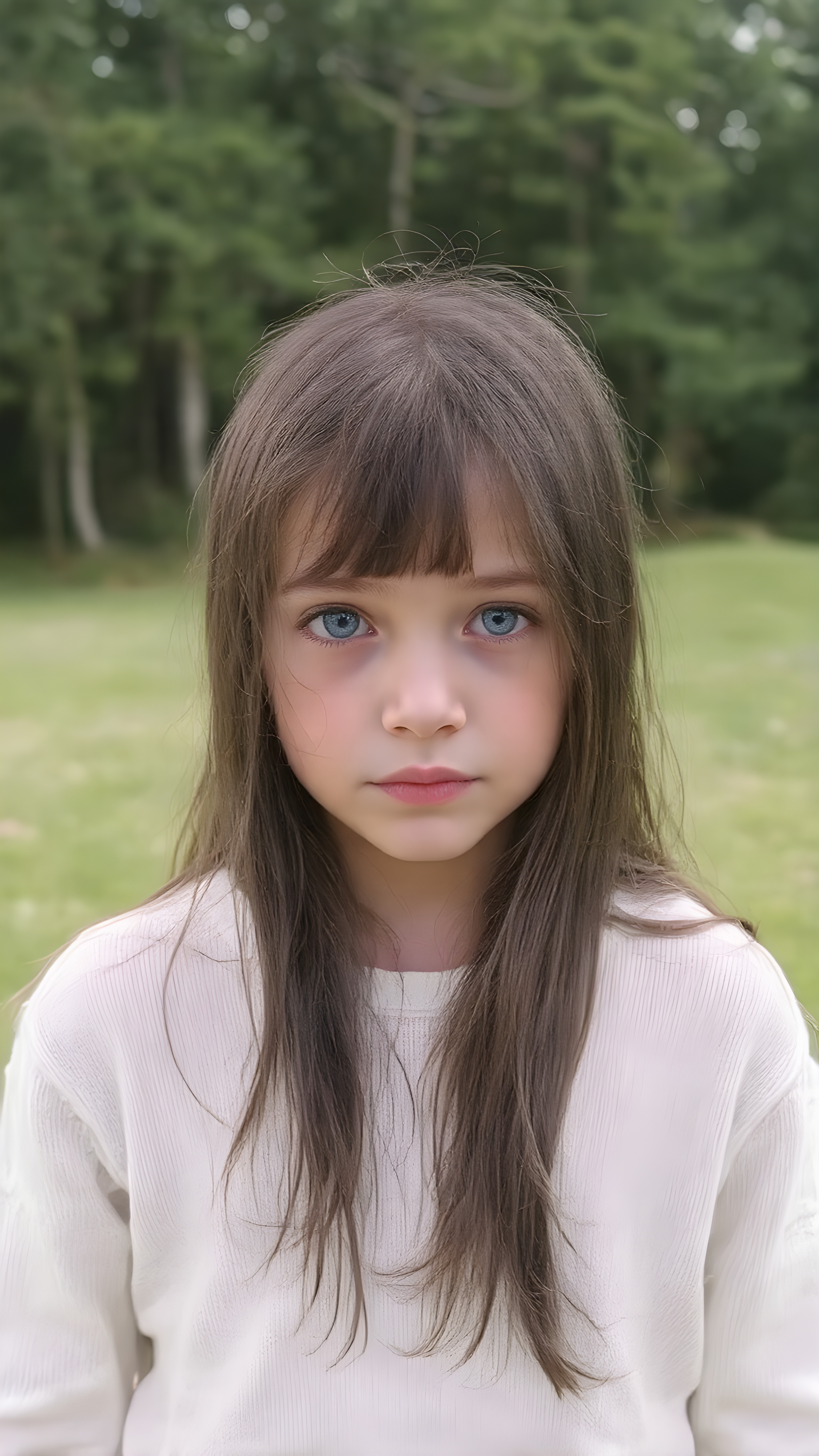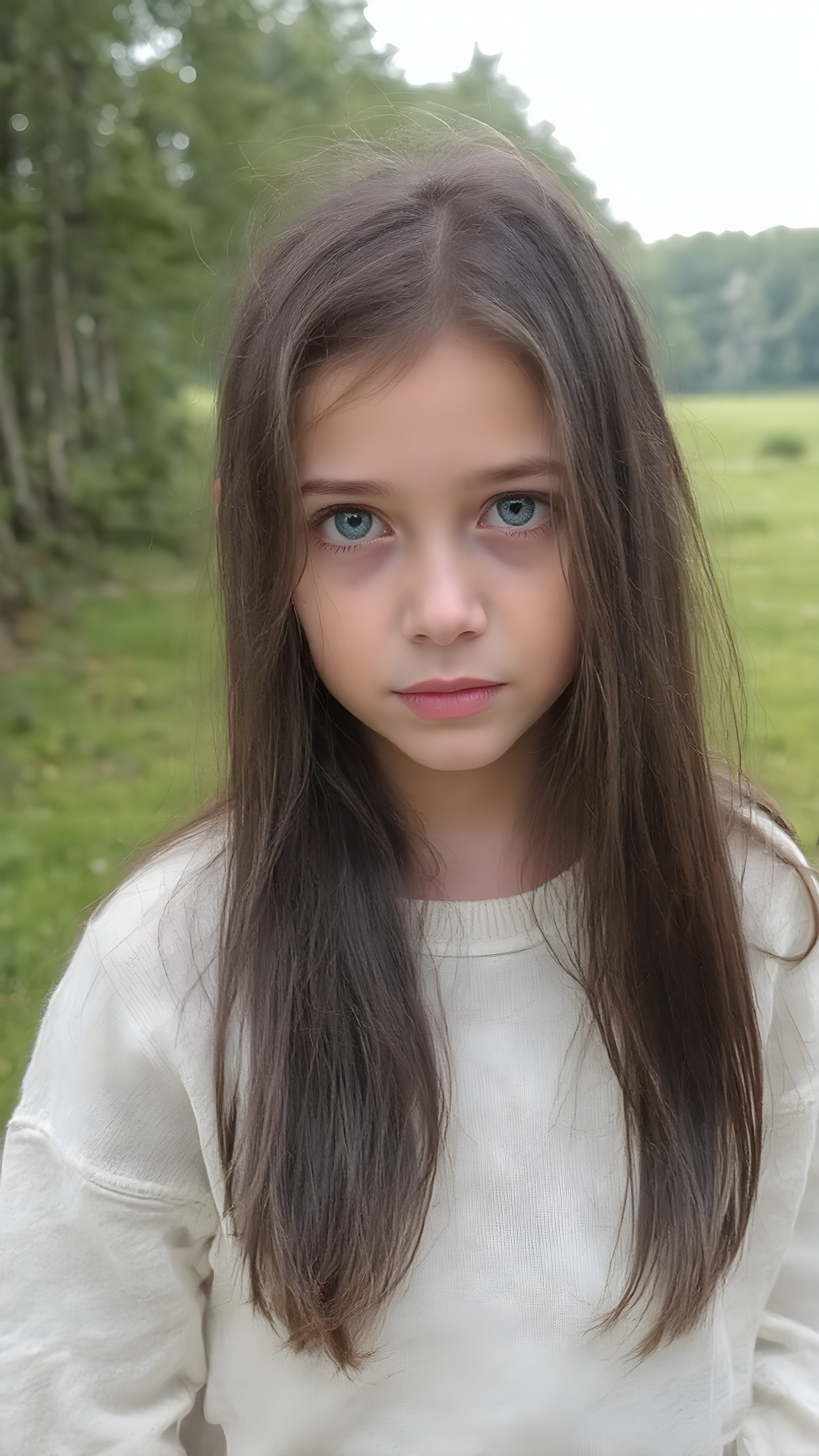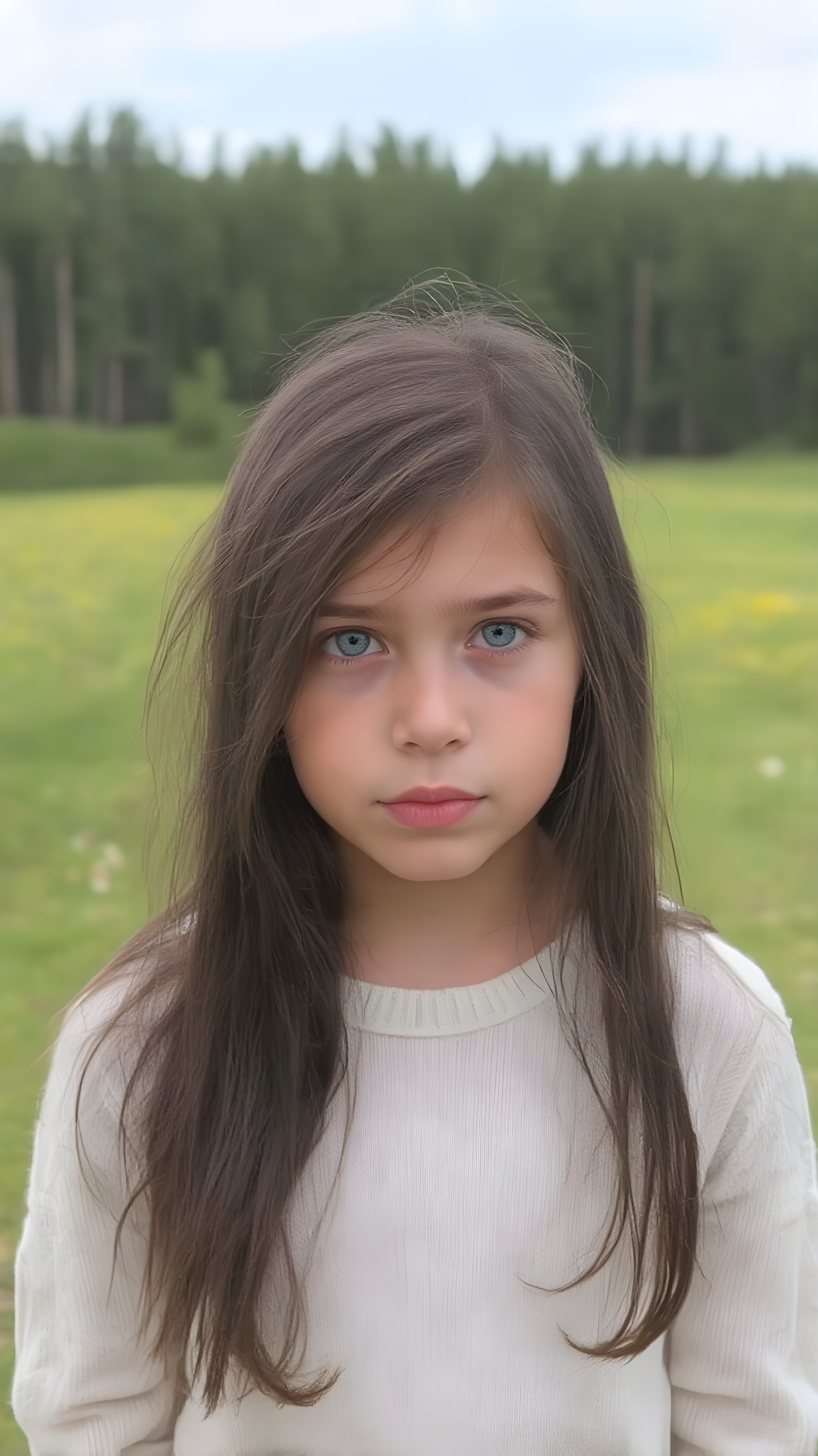 a young cute teenage girl with long, straight and smooth soft and detailed black hair, a soft and round face, deep blue, large and round eyes, she looks shy and astonished into the camera. She is wearing a thin white fine sweater and is standing at the edge of a green forest with a beautiful meadow. The photo is perfectly exposed and focuses on the young girl in the center.