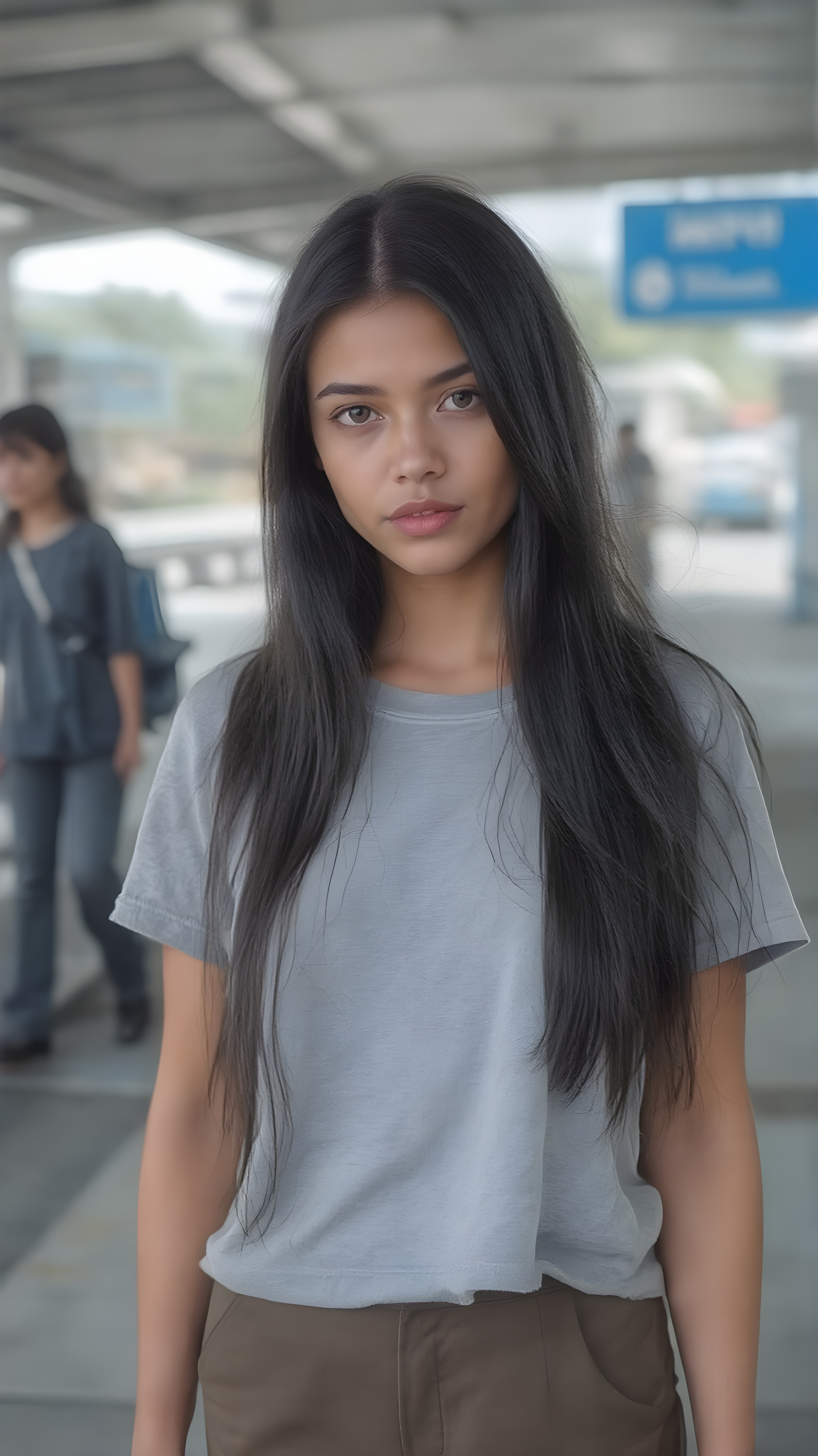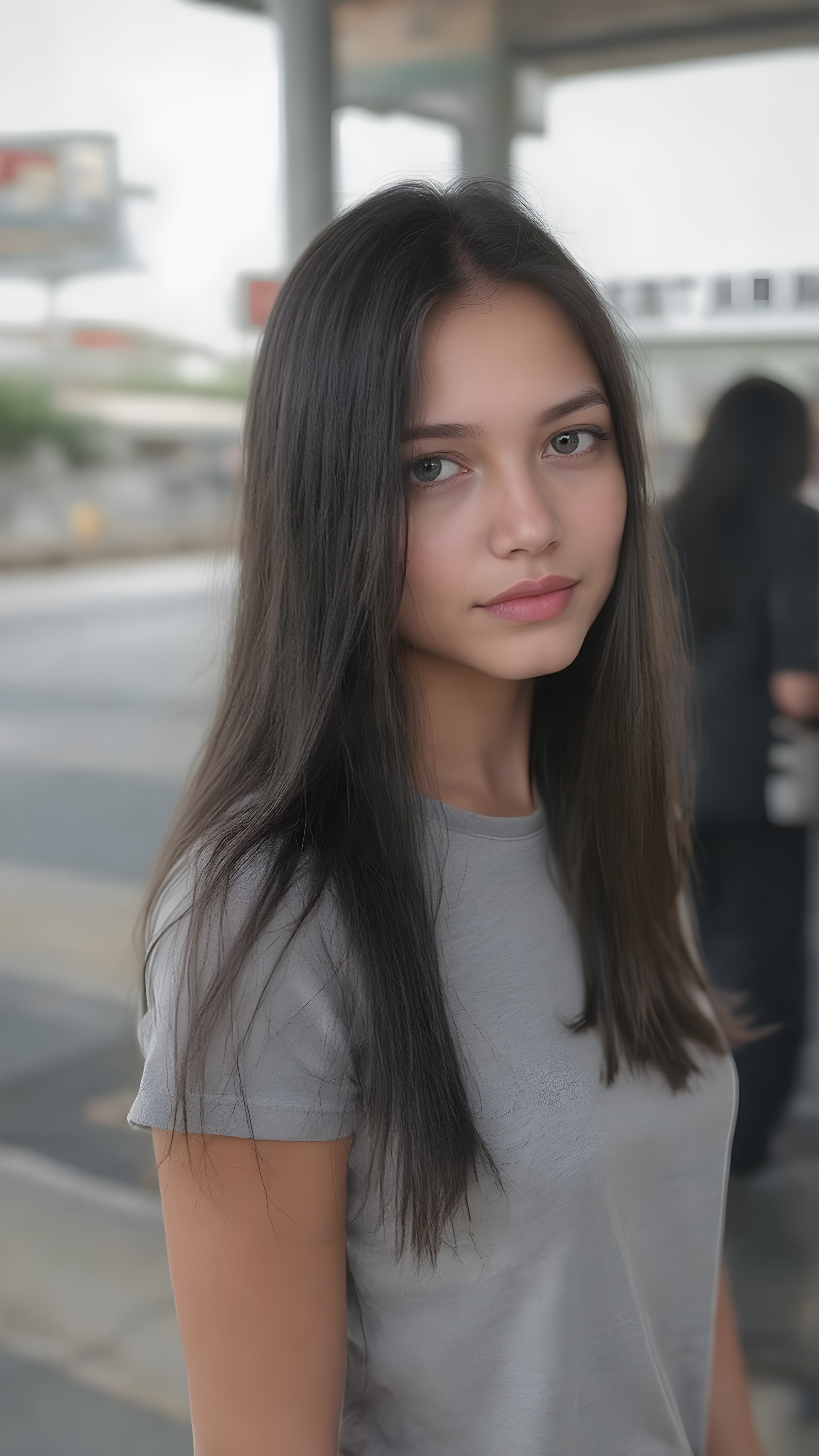 A (((adult girl))) with (((silver skin))), (((sleek straight super long black hair))), dressed in a (((light grey plain short t-shirt))), exuding an air of (mature sophistication) as she waits confidently at a (bus station), she looks direct to the viewer