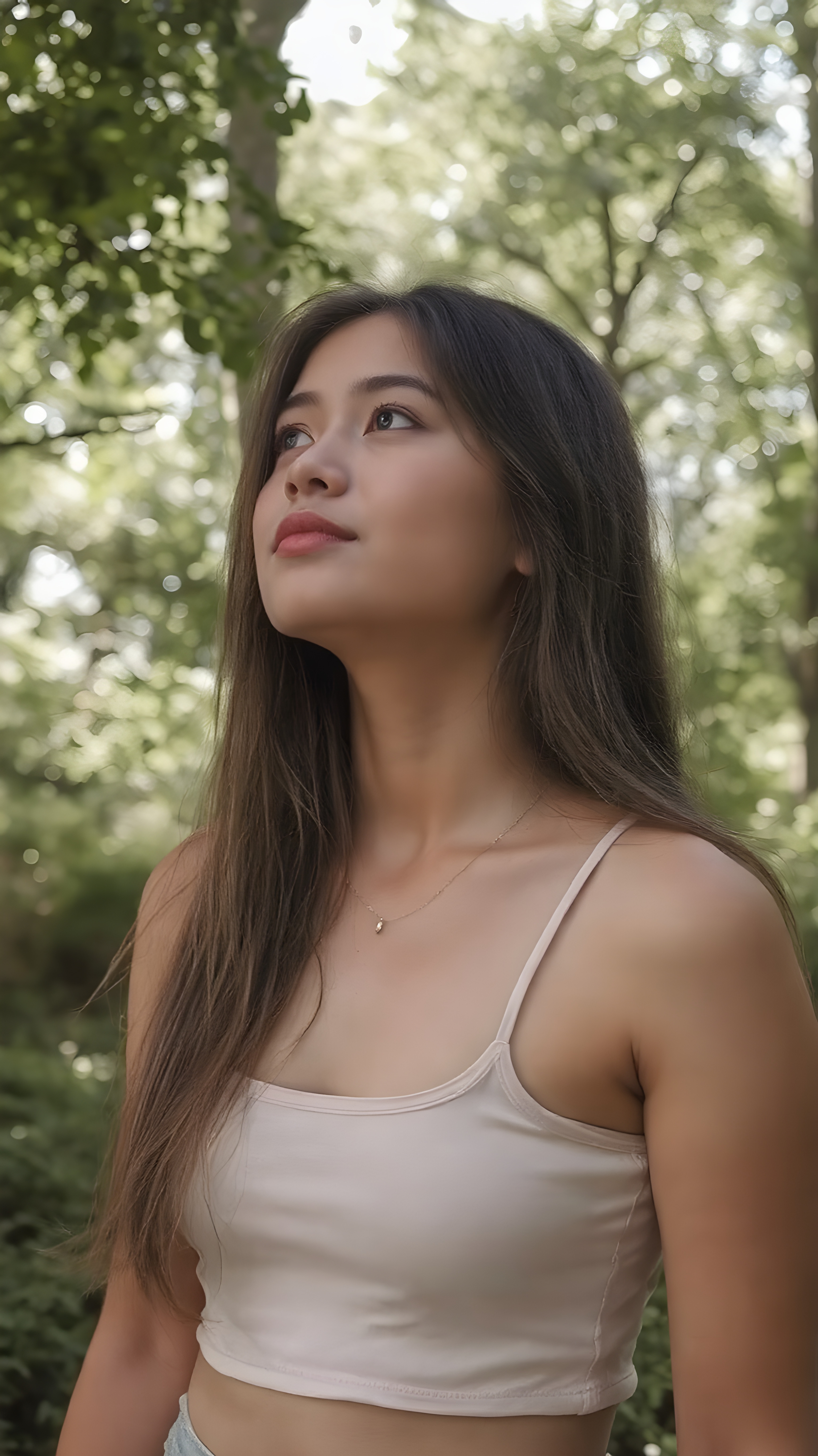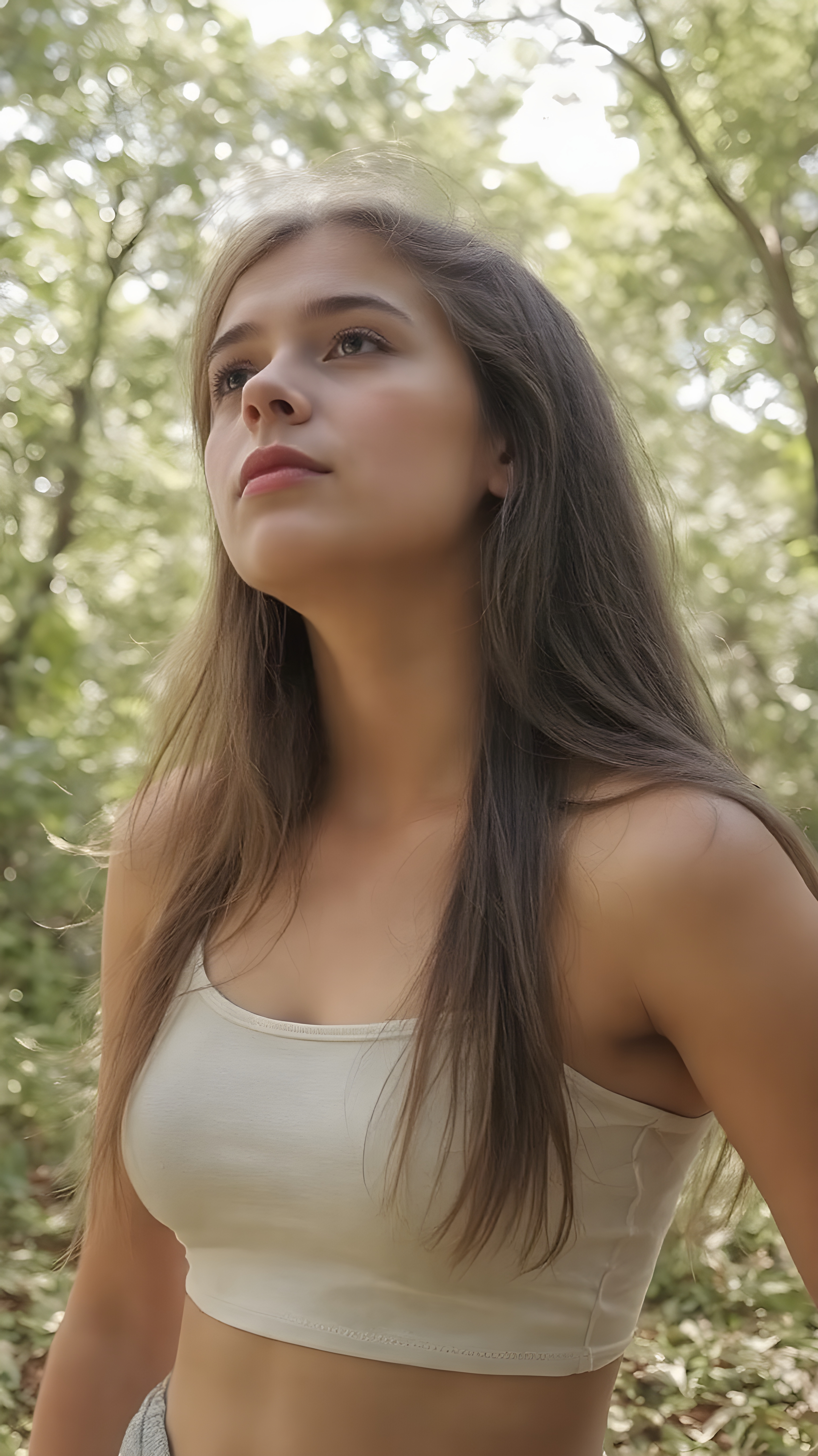 upper body, a young adult teen girl in a green, sunny park, wearing a light, thin cropped tank top. She is looking up at the sky. Her long, straight hair falls down her back, side, she has a perfect curved body