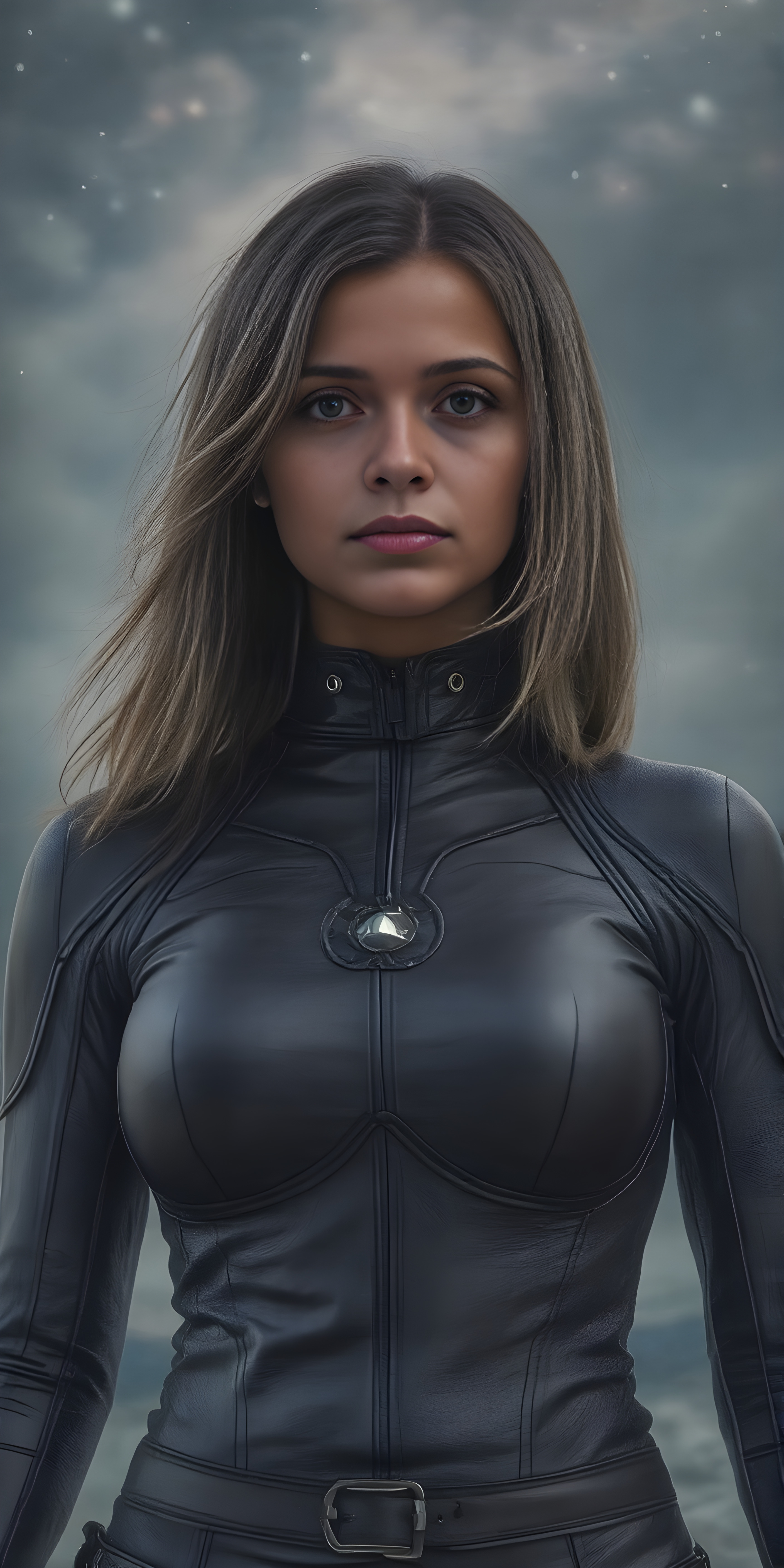 A (((fantastic space girl))) with a sleek, ((leather armor)), adorned with intricate, interwoven patterns that give off a glow, blending seamlessly with her (very futuristic silhouettes), in a (super detailed, high-resolution, full-body shot), under a (softly glowing starry night sky) backdrop, illustrating a sense of (extreme detail and advanced technology) that captures the essence of a (realistic, space fantasy) visual masterpiece
