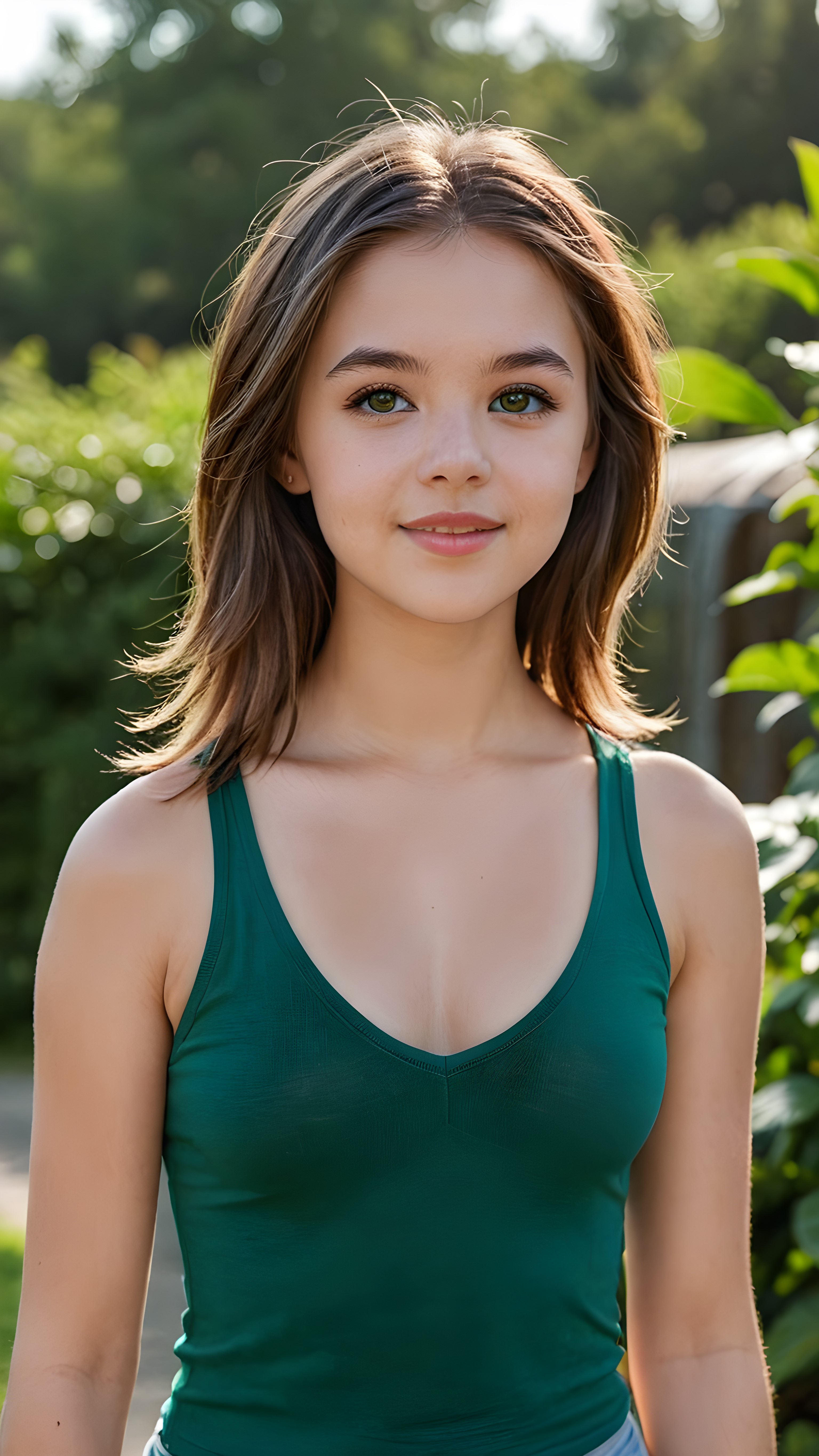 a beautifully realistic (((photo of a young teen girl))) with a round face and perfectly straight soft brown hair, wearing a ((cute short tight tank top (deep v-neck) with an open front)), and matching briefs. She’s posed seductively in a sunny green natural backdrop, looking directly into the camera with a warm smile. Her features are exceptionally well drawn and include perfectly shaped lips and bright green eyes that match her flawless complexion. The image exudes an air of youthful confidence and sensual charm.