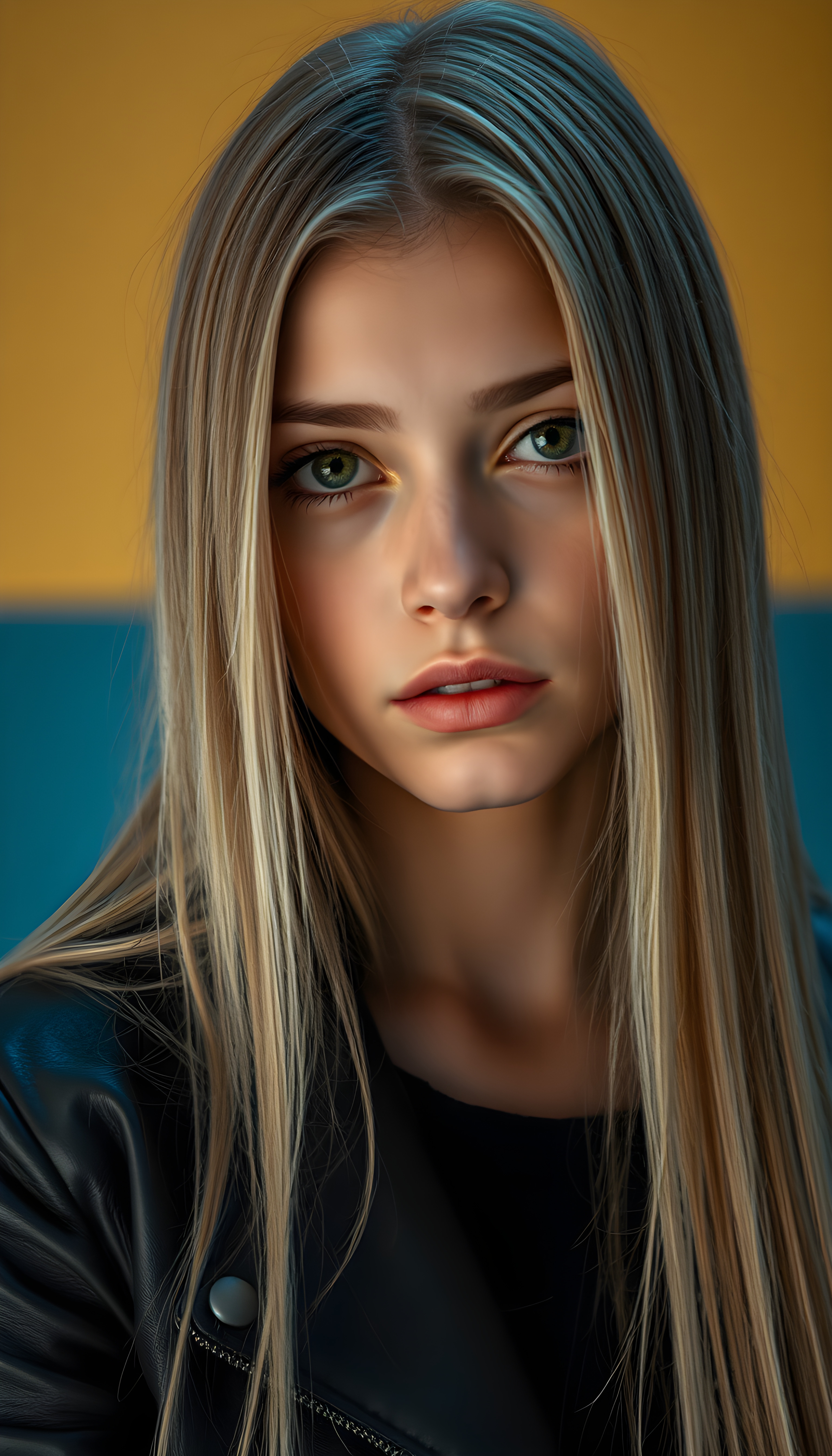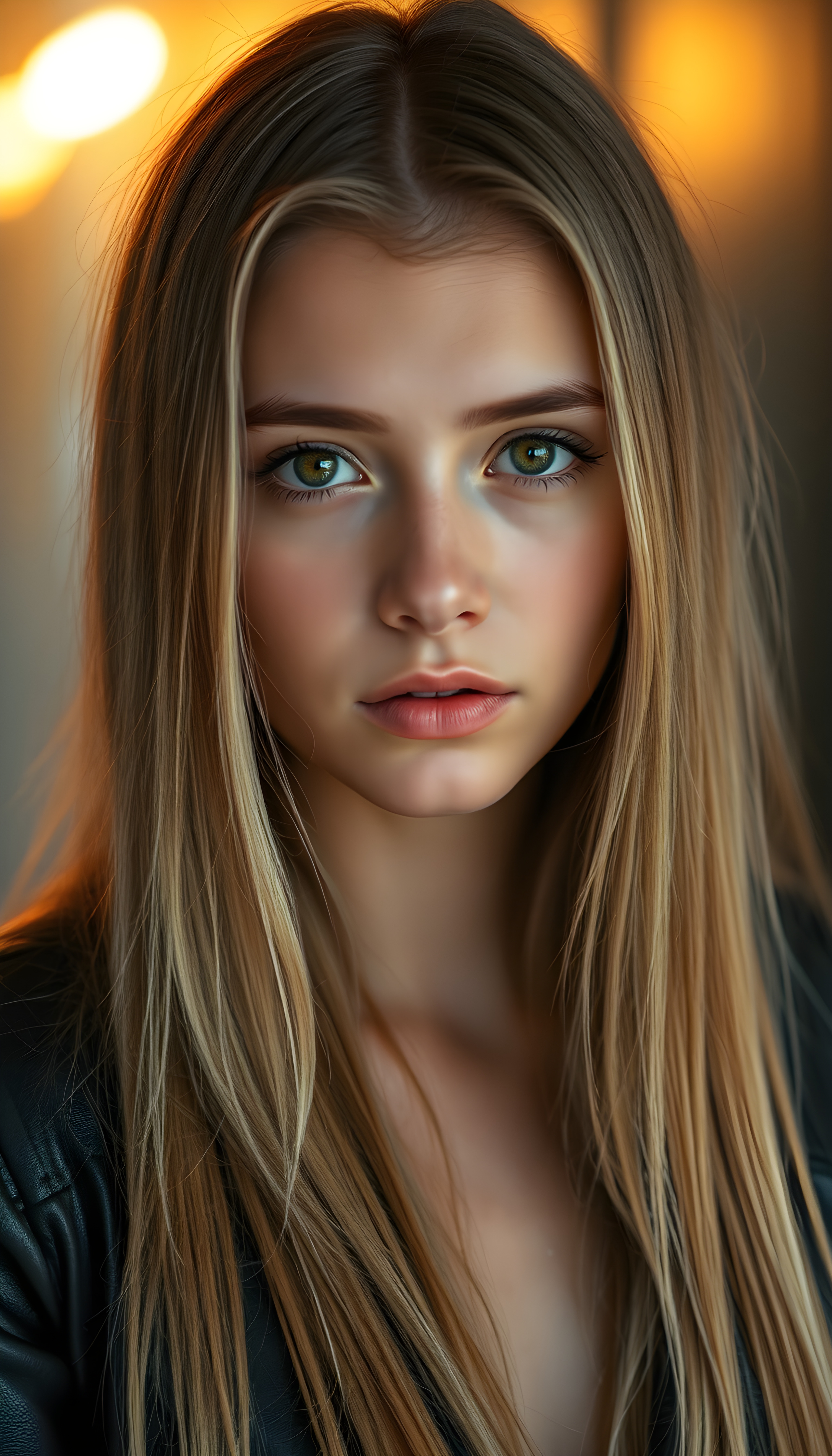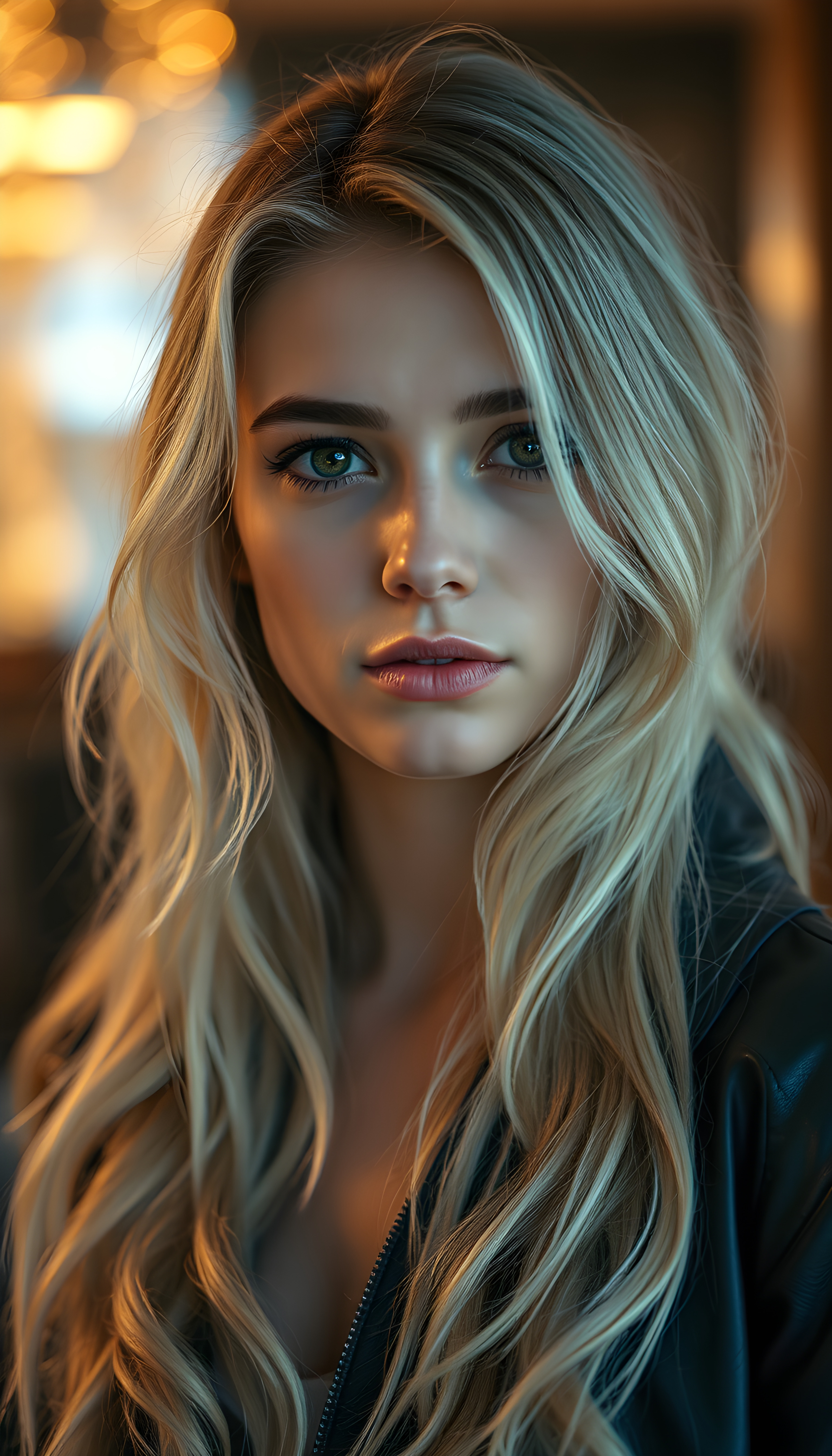 A captivating portrait of a young woman with long, wavy platinum blonde hair, cascading in a soft, layered manner. Her eyes are a deep, enchanting brown, framed by meticulously groomed, arched eyebrows. She wears a sleek, black leather jacket that adds an air of modern sophistication. The background is a dynamic interplay of warm golden lights and cool blue tones, creating a striking contrast that draws the eye. Soft, diffused lighting accentuates her features, casting subtle shadows that enhance the depth and texture of her hair. The atmosphere is serene yet vibrant, blending elegance with a touch of mystery, evoking a sense of timeless beauty.
