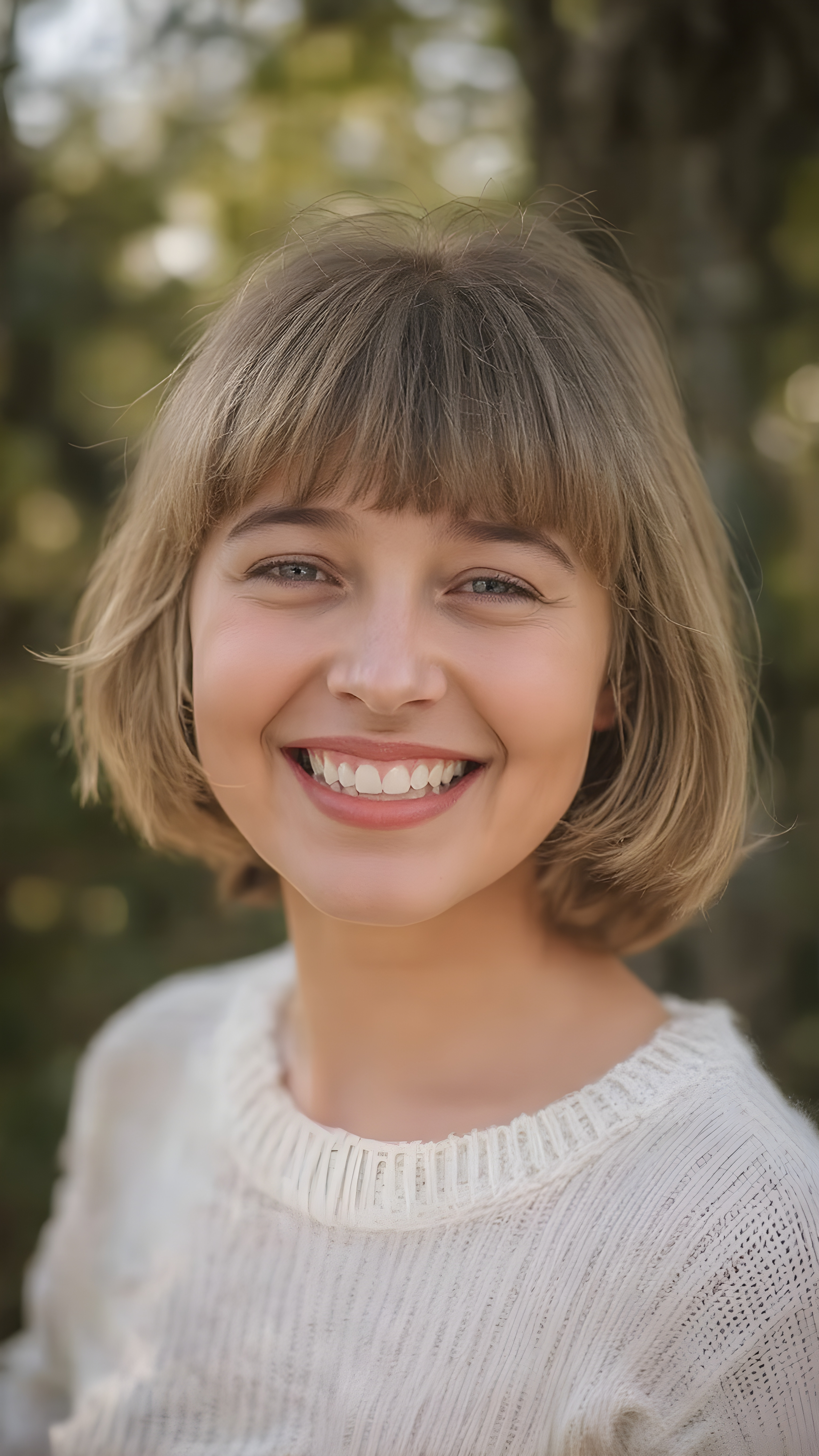A (((natural girl))) with natural bob haircut, straight hair, and a radiant complexion, embodying the essence of youthful beauty in a (((vintage, pin-up style))), full figure body image, showcasing her radiant skin and delicate, softly-toned natural makeup, against a backdrop of a (((natural, outdoor environment))) that brings to mind the spirit of natural beauty and the timeless allure of a bygone era. She is wearing a fine white sweater made of wool, she laughs heartily with her mouth wide open and her teeth white