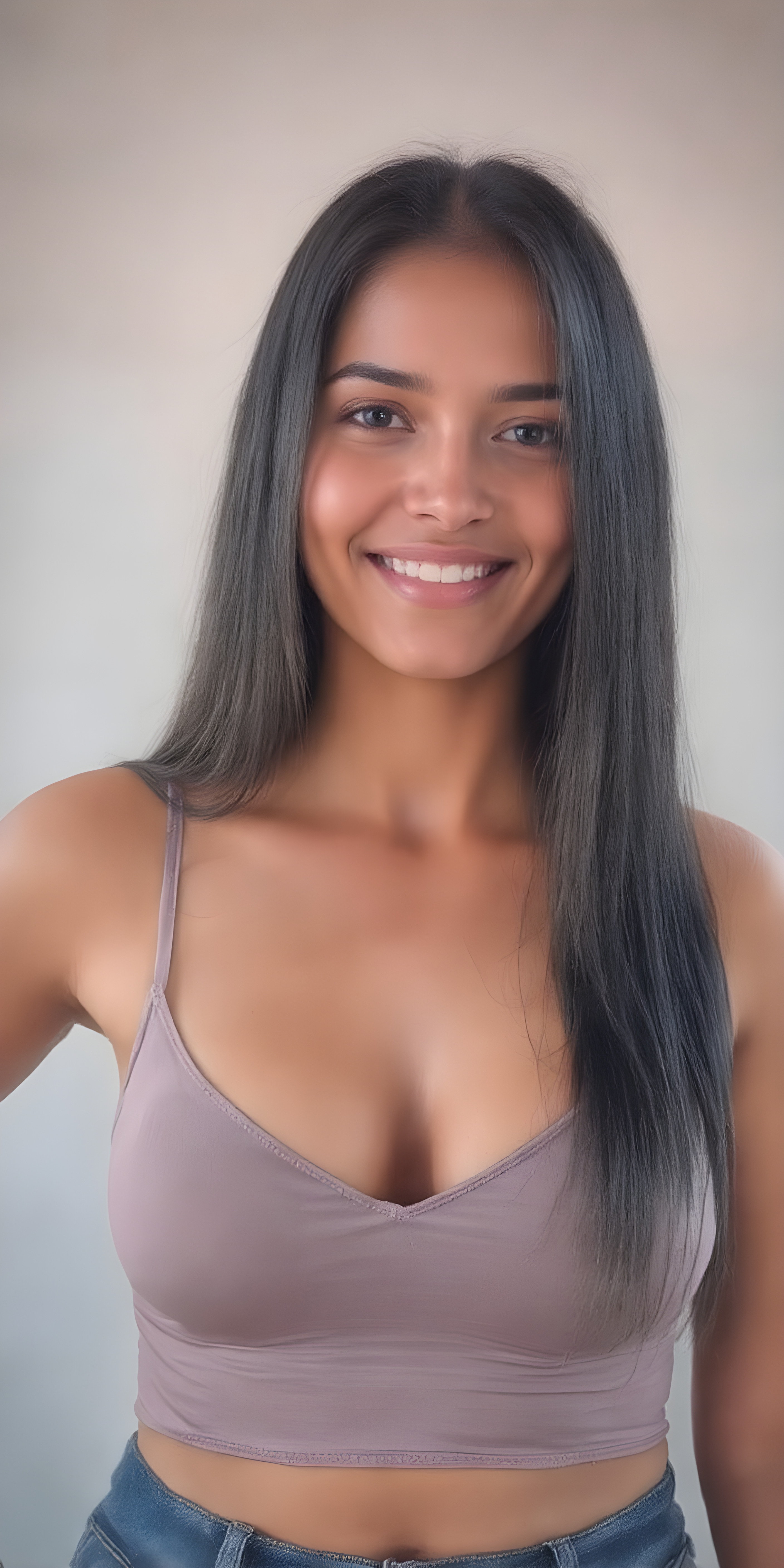 a beautiful well busty women, perfect curved body, deep v-neck, spaghetti cropped tank top, very long straight obsidian black hair, smile, view from the front