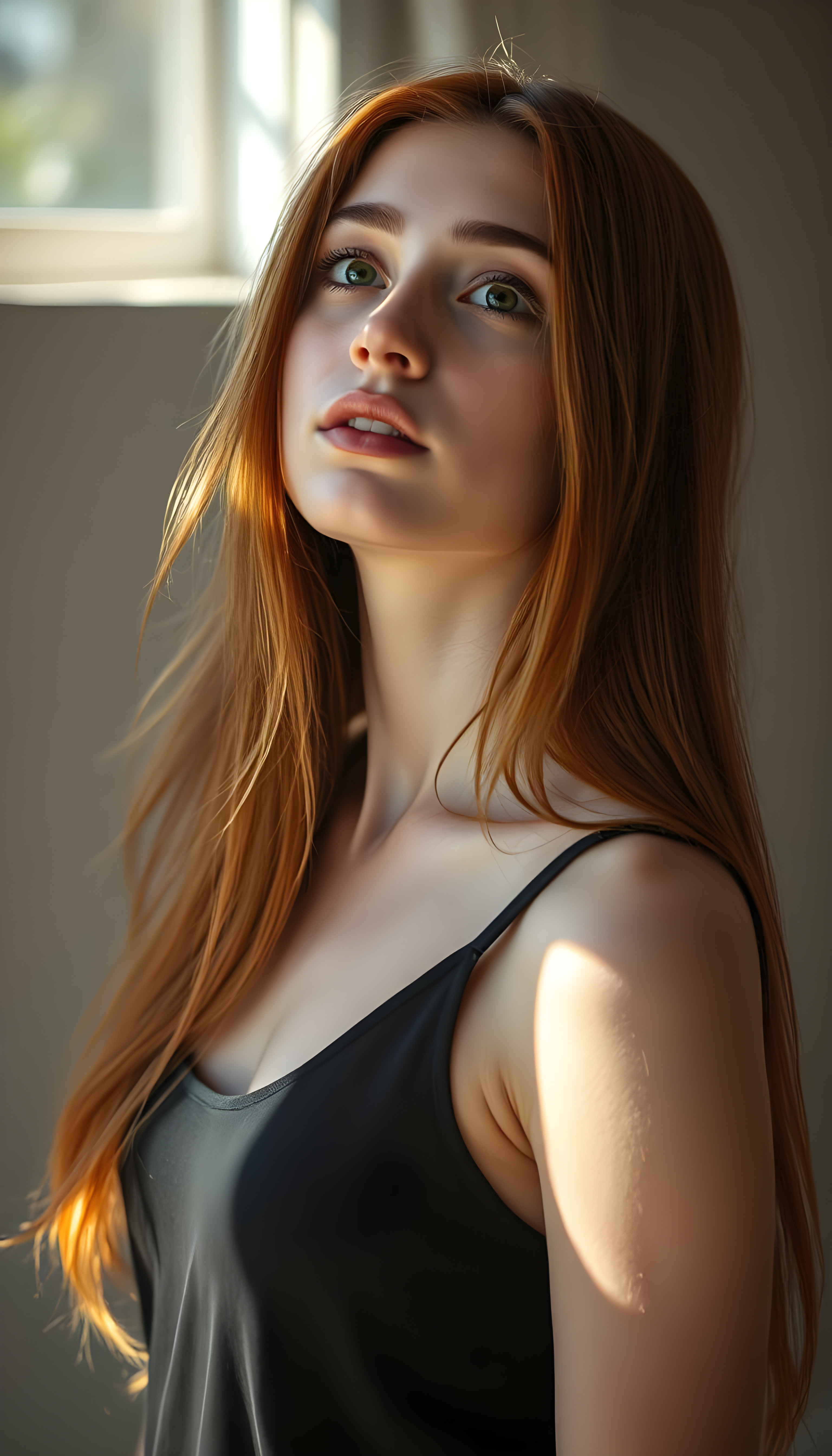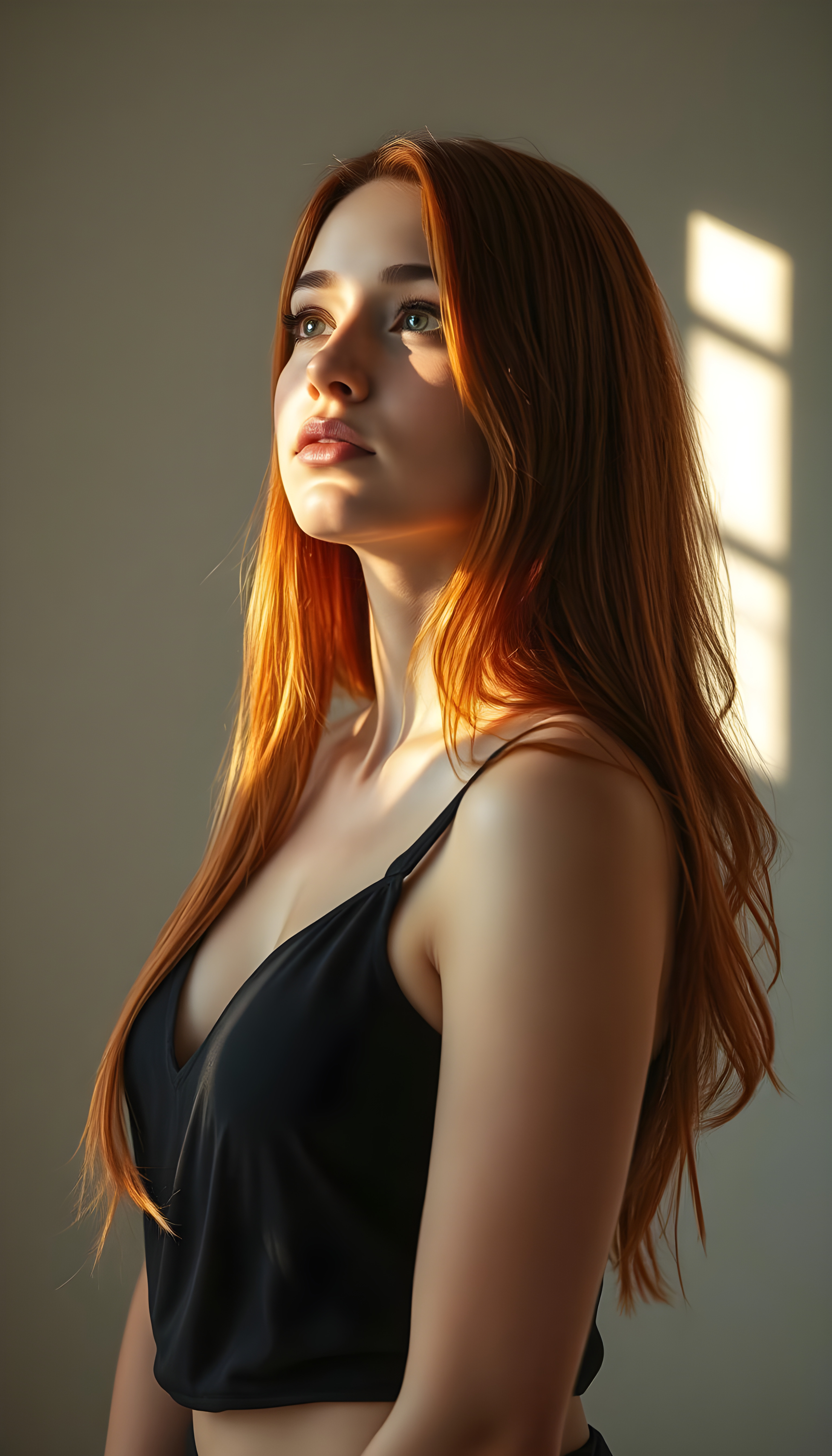 A young woman with vibrant red, straight, very long hair exactly the same length and striking amber eyes gazes upwards with a serene expression. Her delicate, full lips curve slightly as she looks off to the side. Sunlight filters through a window, casting a warm, golden glow over the scene, highlighting her features and creating a soft, ethereal ambiance. She wears a flowing, sheer black tank top that accentuates her slim figure, with the fabric gently cascading around her. Her hair is voluminous and elegantly falls over her shoulders, creating a dynamic, wavy silhouette. The background is a light grey studio setting, providing a clean, minimalist backdrop that emphasizes her beauty. The image is infused with a touch of dreamy, impressionistic artistry, blending realism with a subtle, painterly quality.