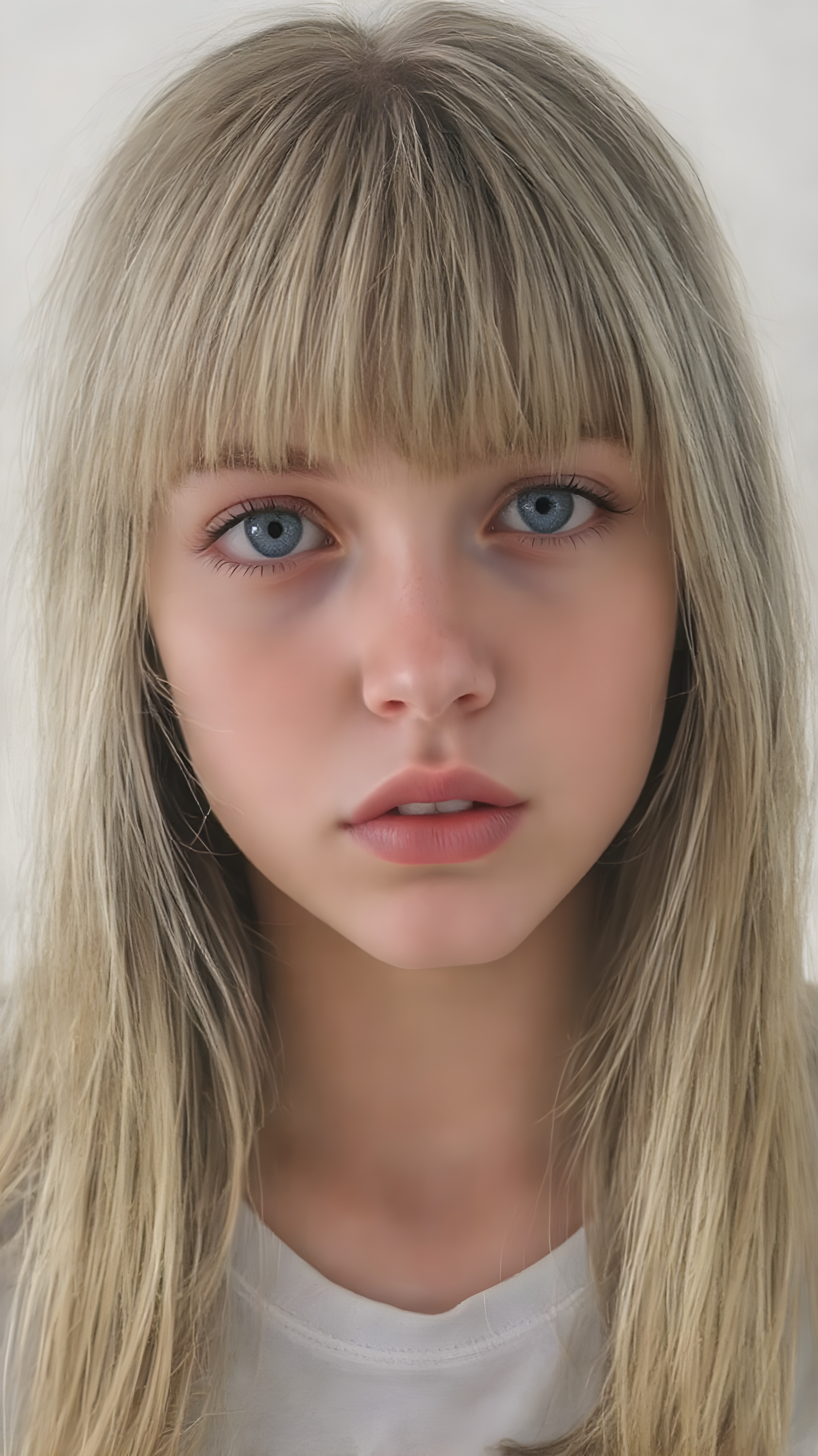 ((oil pastel drawn)) super realistic detailed, young teen girl, long straight blond and light brown hair, bangs, cute, stunning, gorgeous, ((full body, wears a light grey thin cropped t-shirt)), slightly open mouth, withe teeth