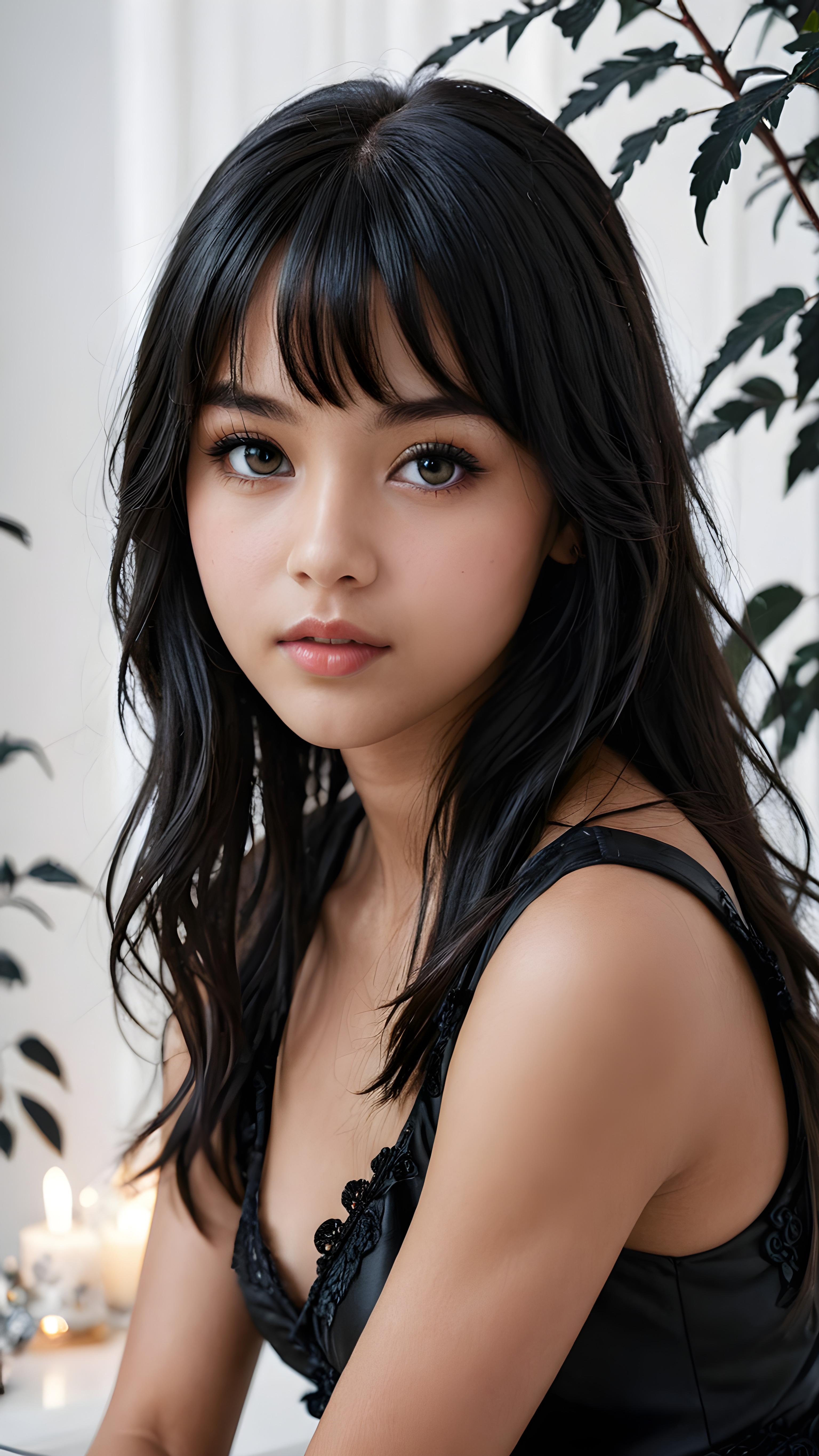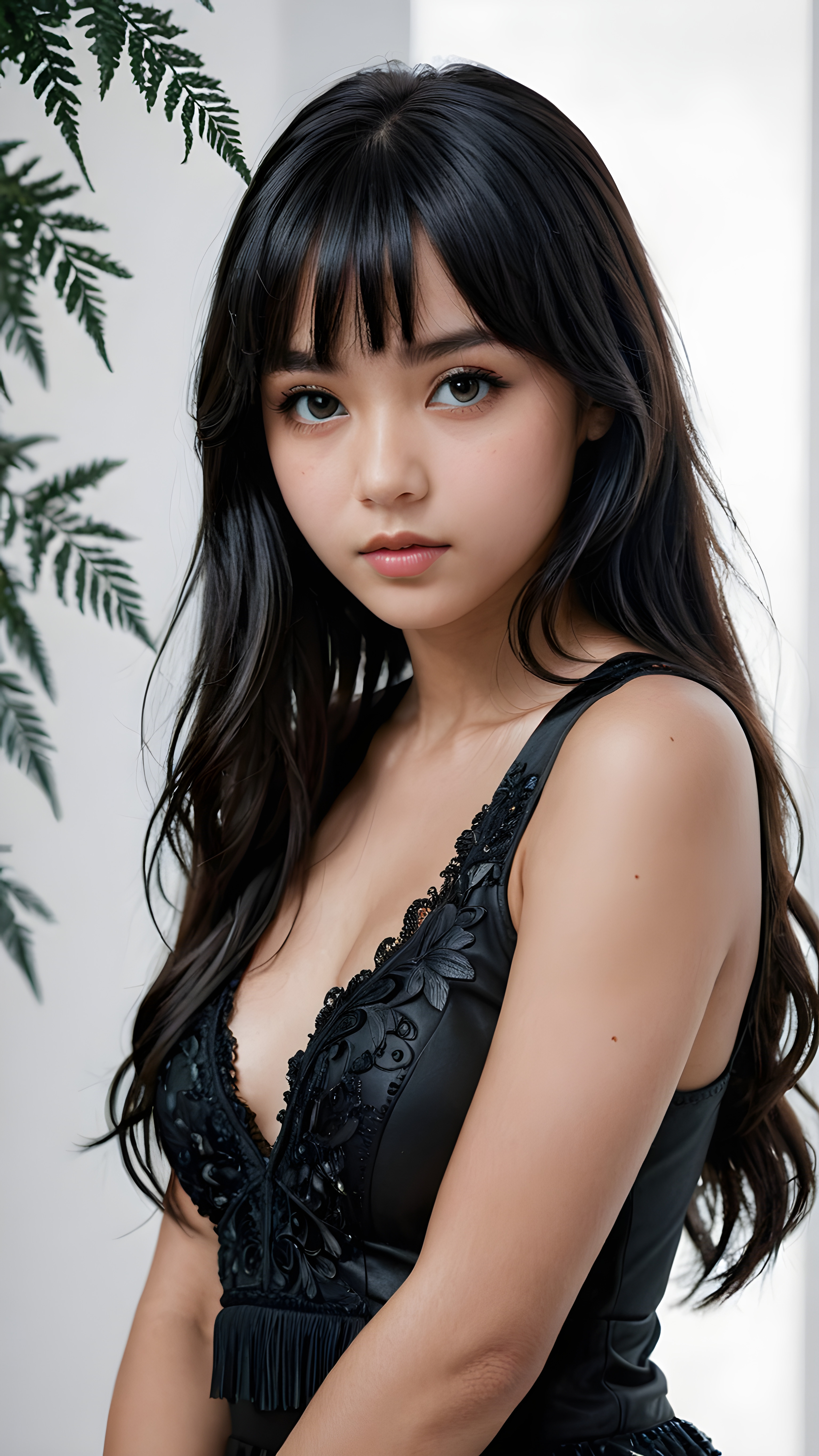 a (((super realistic, highly detailed, intricate photography))), capturing a (((beautiful young teen girl))) with an extremely defined and detailed face, including (((perfect, detailed obsidian black very long soft hair, bangs))), intense eye shadow, and a (short, v-neck black tank top) with (sharply contrasting, luxurious black and white details), paired with (distinctively shaped, vividly hued glass heels) and a (modern, minimalist white backdrop) for a (full body photo) that exudes an (ominous, seductive aura), accented by (subtle yet intricate gothic details) like (dark, twisted foliage) and (ethereal, shimmering glowing particles) that imbue a sense of mystery and magic
