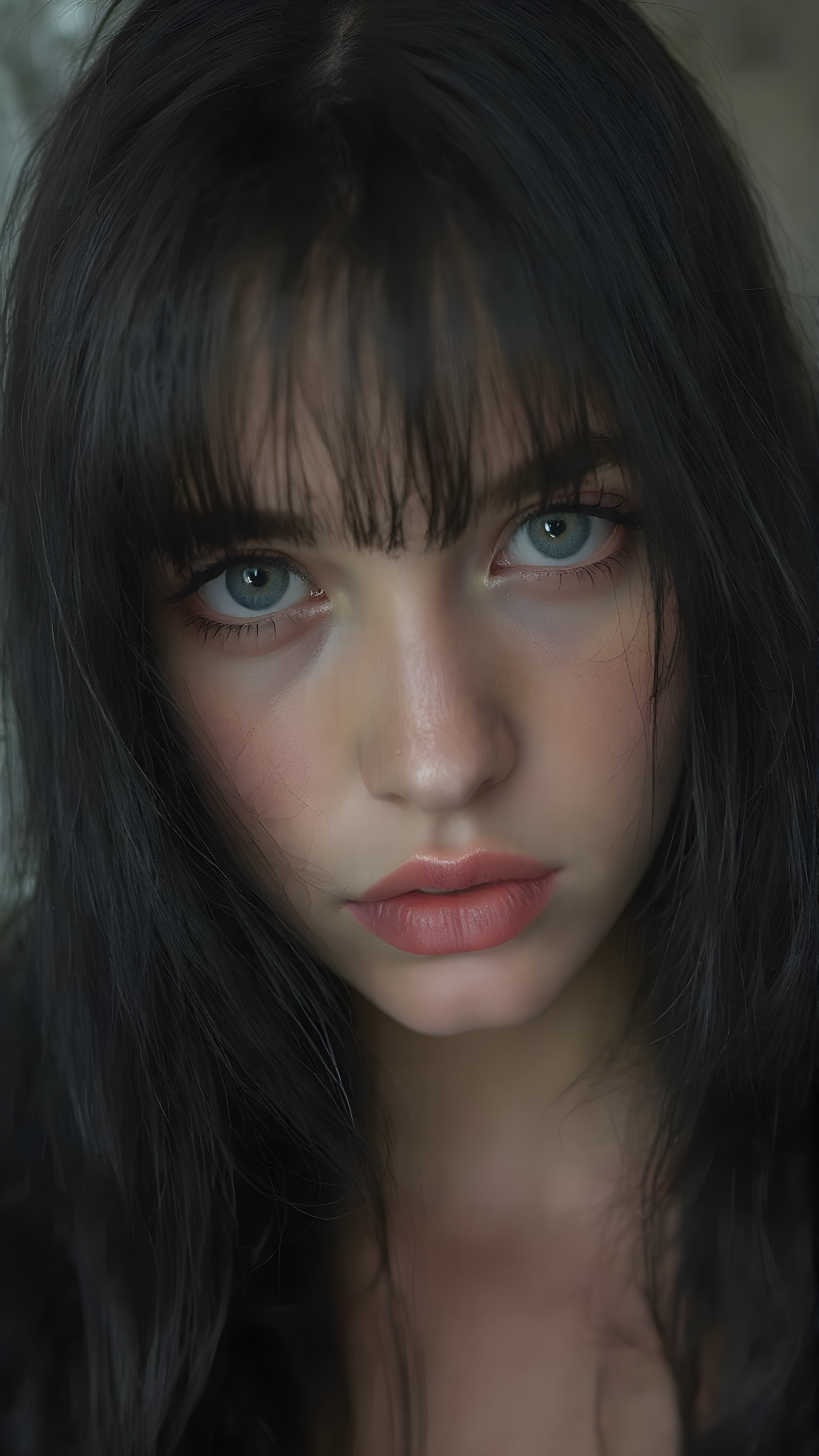 a cute, ((photo realistic)), ((innocent teen Emo girl)), ((long, straight jet black hair, bangs)), ((melancholic sad eyes)), ((depressed)), ((bummed out)), ((disappointed)), ((large cute determined red lips)), ((dark blue eyes)), ((black eye shadows)), (((black eyelids))), ((thick black brows)), (((gothic make-up))), ((detailed face)), ((realistic face)), ((matching faces)), ((perfect teeth)), ((looking into the camera))