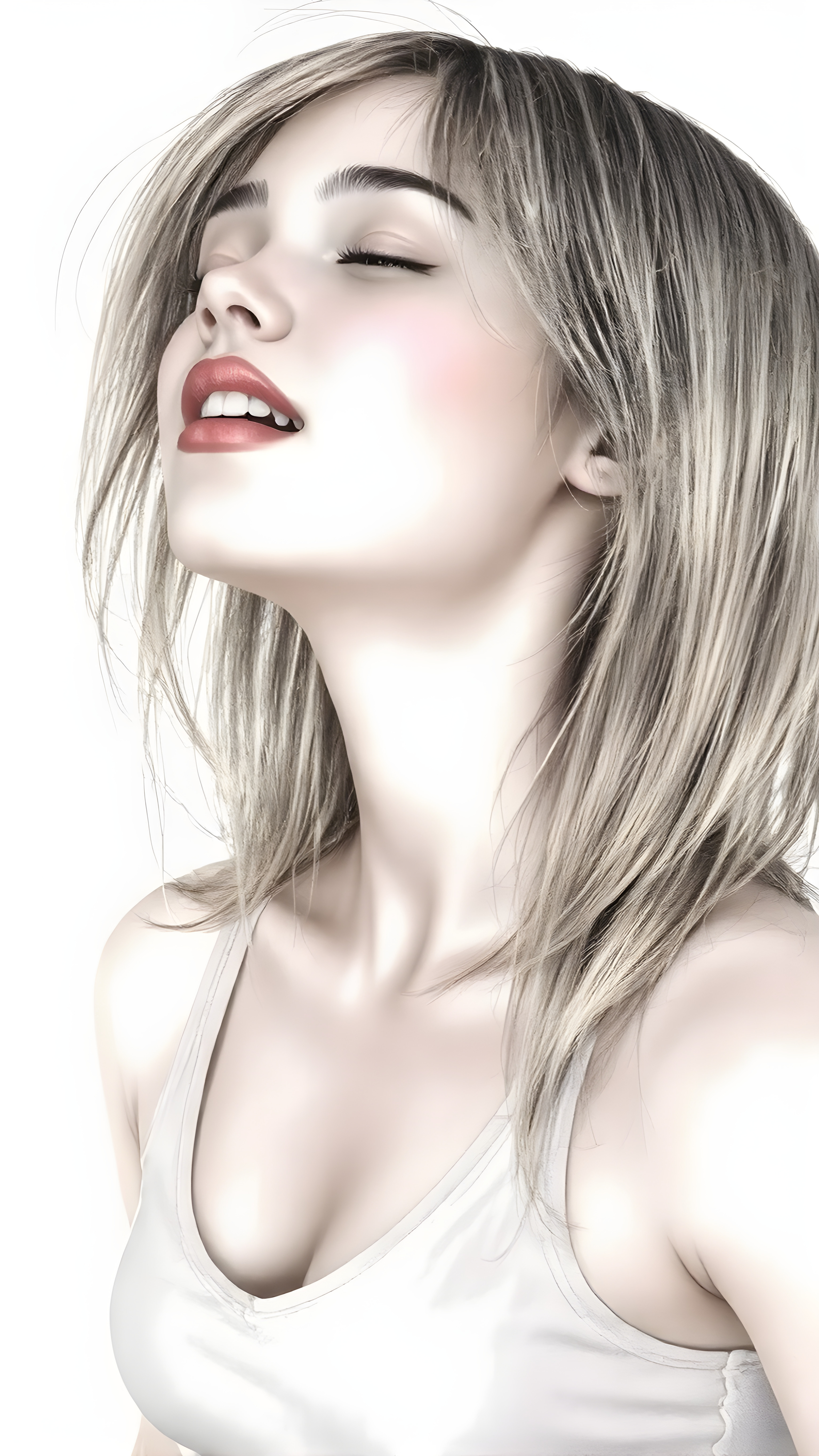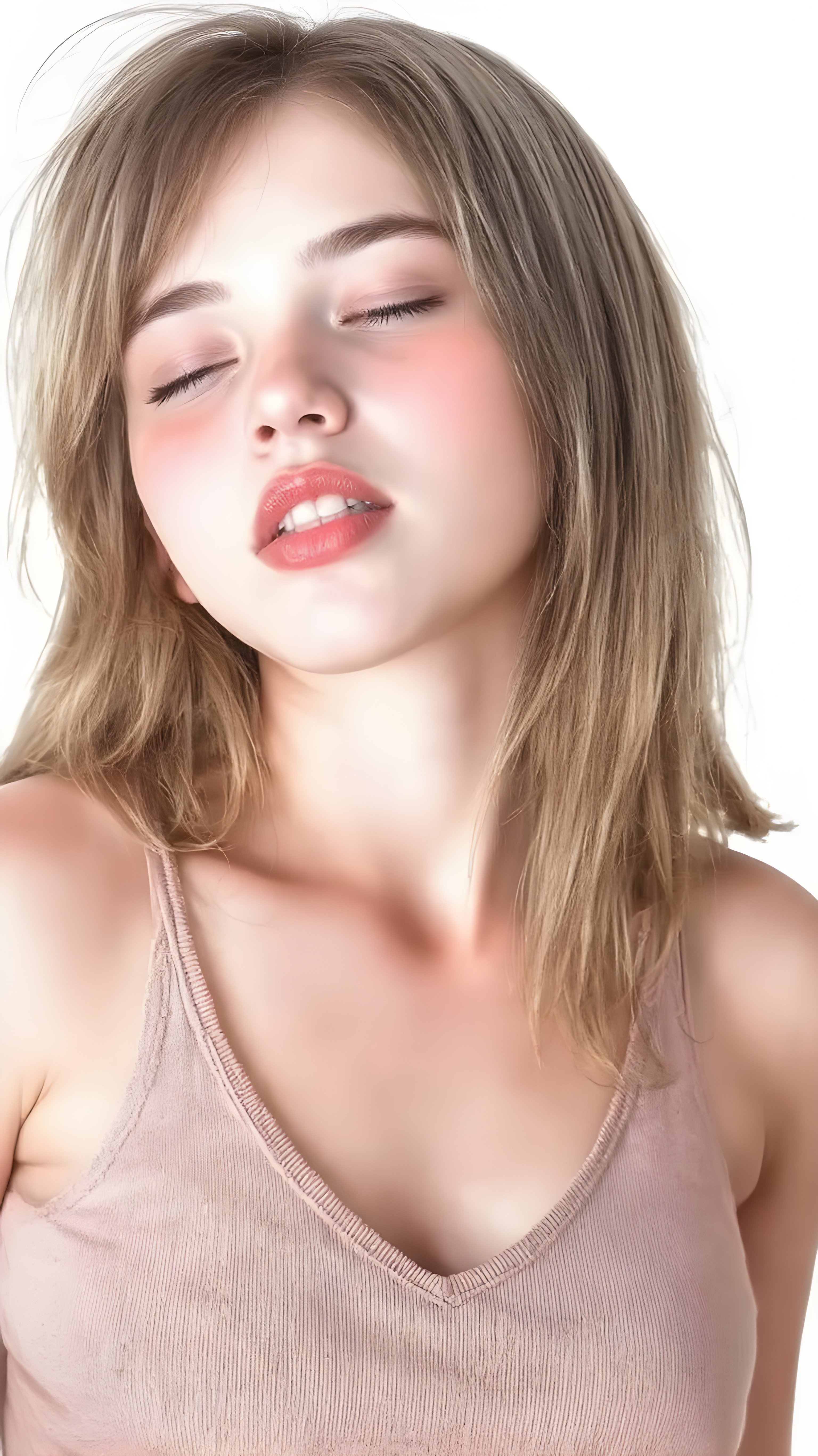 a (((beautiful well busty young teen girl))), with straight (((light soft amber hair))) styled in a cropped and tight fitting (((light amber short tank top, deep v-neck))). She has closed eyes and wide open mouth and white teeth and enjoy her desire, her head is tilted back and looks into the air. Round detailed cute face. She exudes a youthful vibe, reminiscent of a high school girl, with a petite, yet perfectly proportioned figure, that perfectly complements her advanced features and advanced beauty, white backdrop, side view, whole body