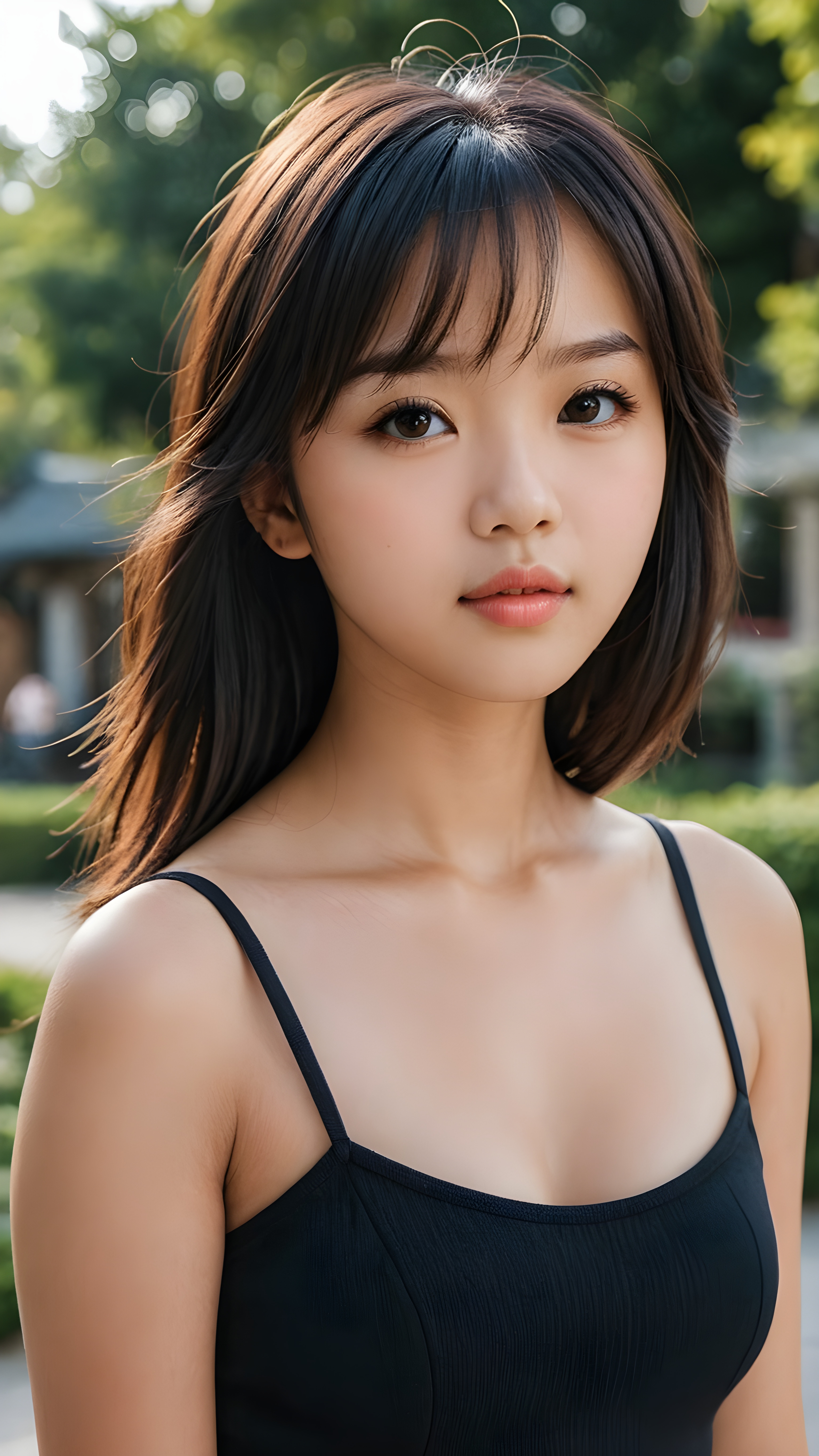 - a (((super realistic 4K-detailed face))), with a perfectly curved and (((cute Japanese teen girl))) silhouette, sporting long, flowing blach bangs and dark (((eyes))), dressed in a sleek, yet playful, (((white short, tight tank top))), looking directly into the camera, in a serene and confident portrait pose