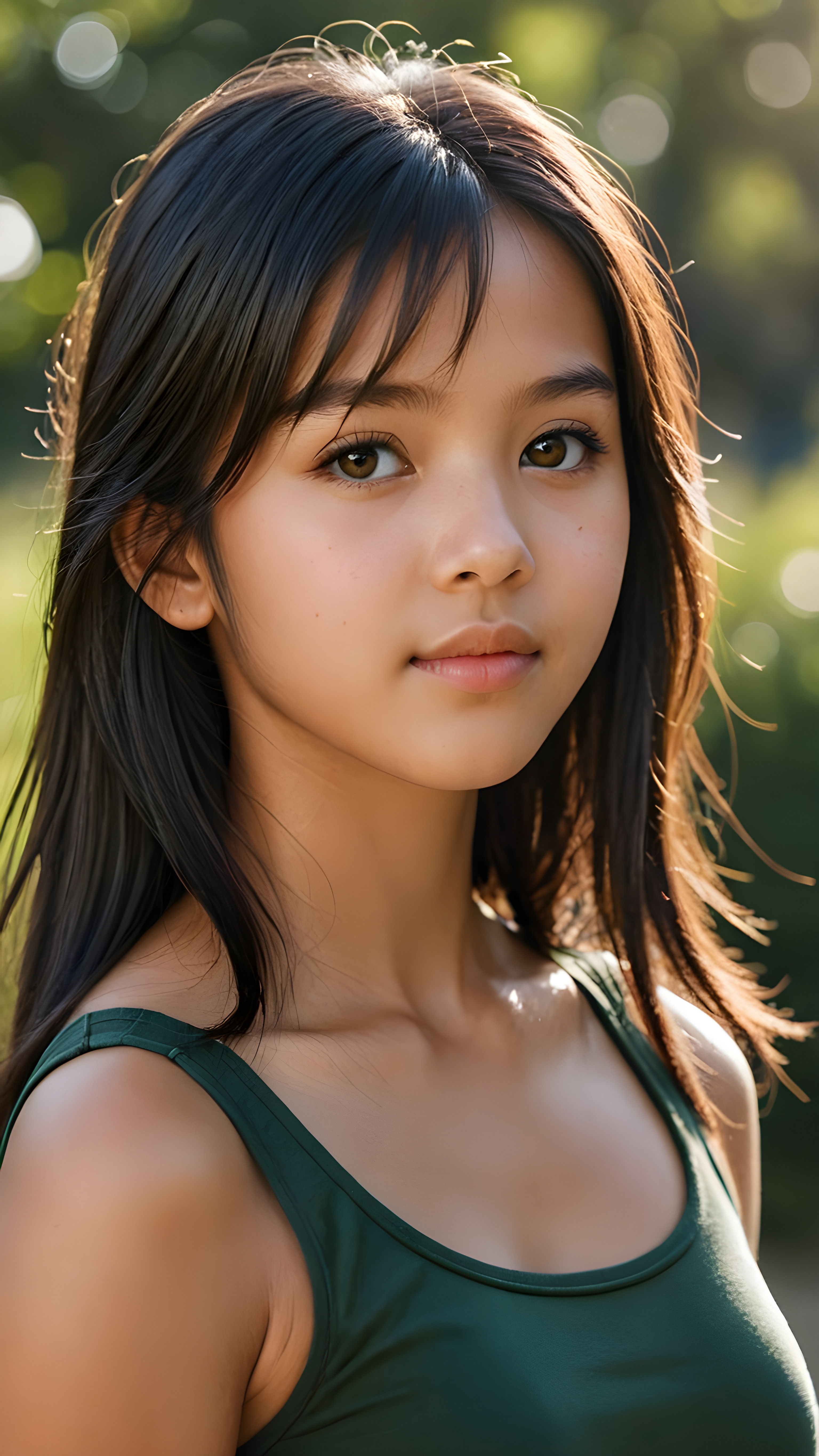visualize a detailed and realistic photo from a beautiful, young, soft COLOR-skinned teen girl, she is 15 years old and has soft long straight hair. She has a wonderfully shaped body and is only lightly clothed in a tank top. She looks seductively at the viewer and has full lips, ((stunning)) ((gorgeous)) ((side view))