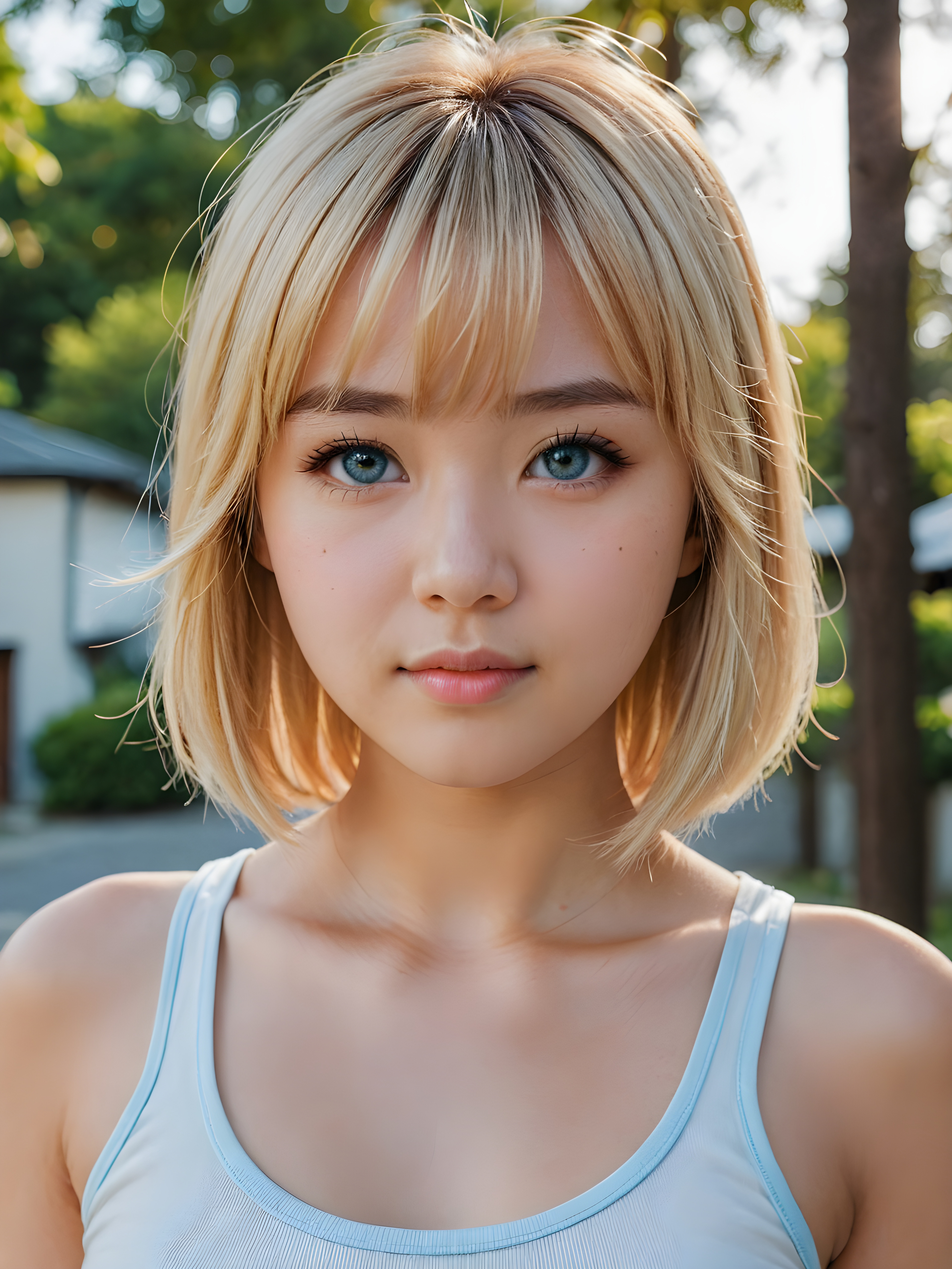 - a (((super realistic 4K-detailed face))), with a perfectly curved and (((cute Japanese teen girl))) silhouette, sporting long, flowing blonde bangs and bright blue (((eyes))), dressed in a sleek, yet playful, (((white short, tight tank top))), looking directly into the camera, in a serene and confident portrait pose