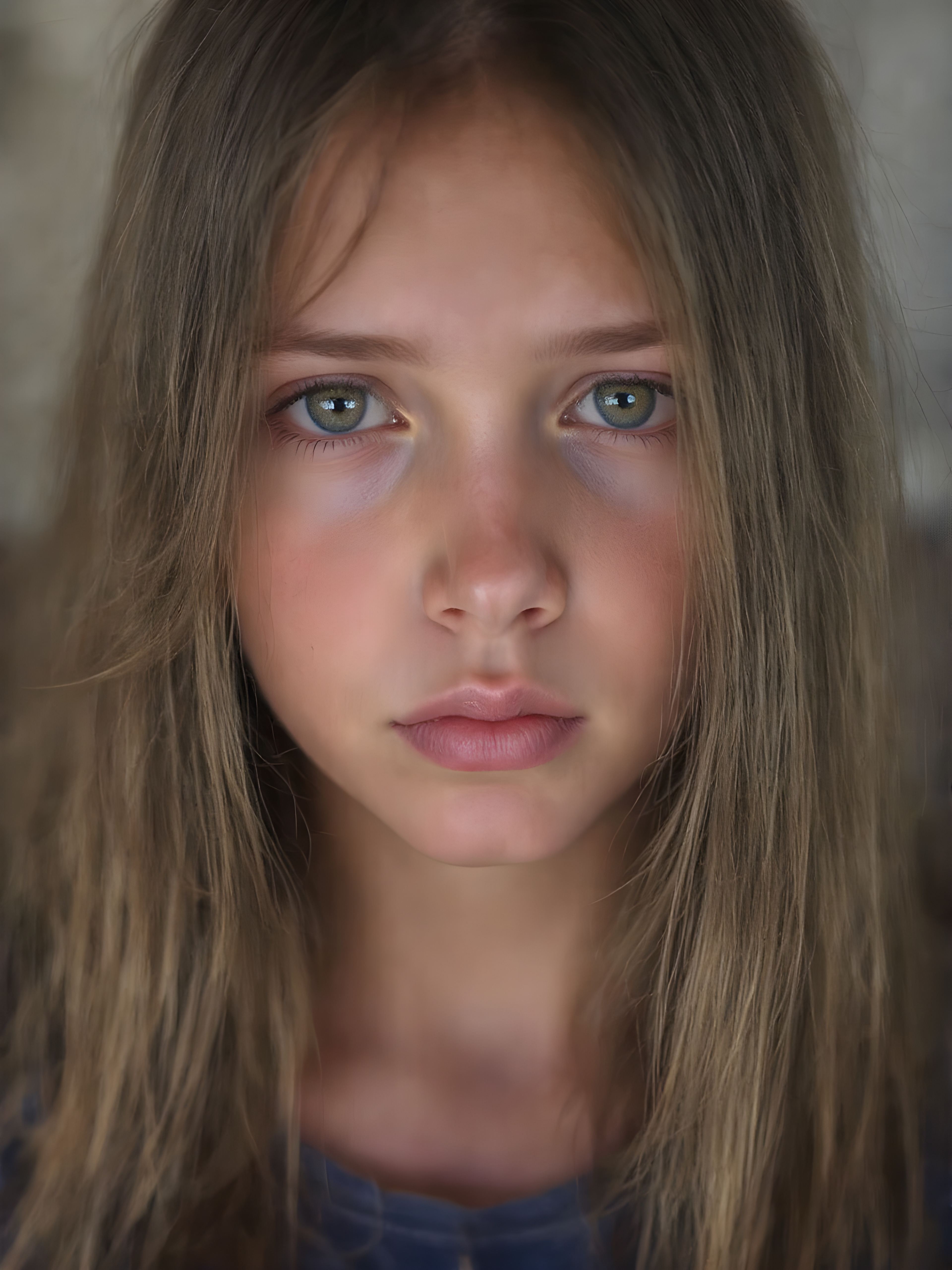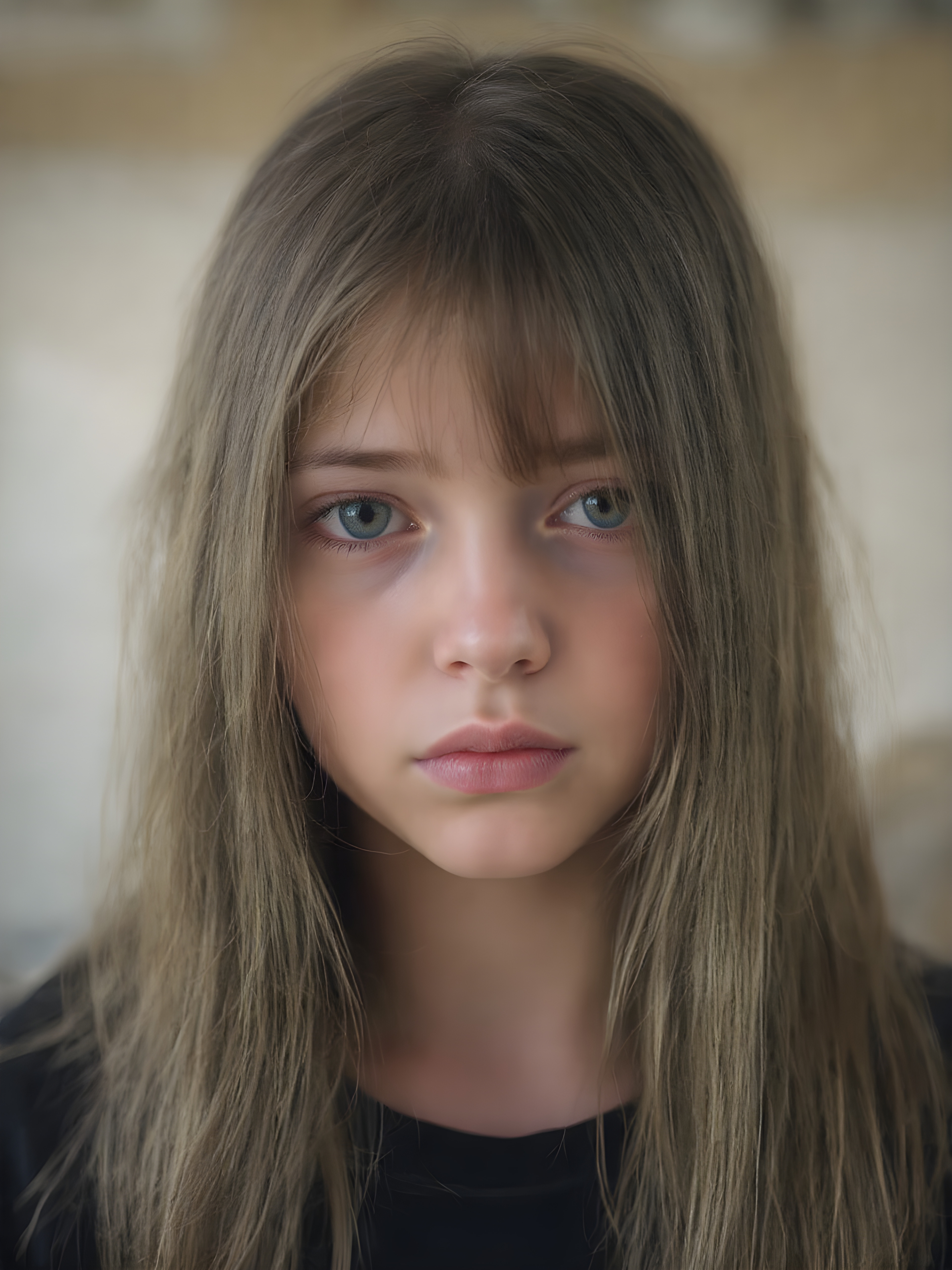 a cute young girl, super long straight hair, round face, full lips, amber eyes, detailed, + (looks tired)