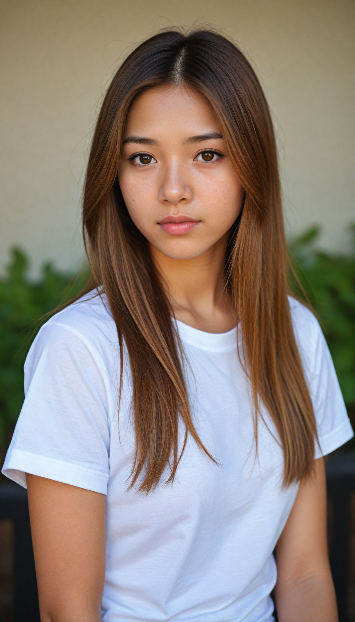 a stunningly elegant and cute Asian teenage girl with long, straight hazelnut hair, with a (realistically detailed angelic round face) and (realistically detailed hazelnut eyes) looking pensively at the camera, wearing a (super short, tight white t-shirt)