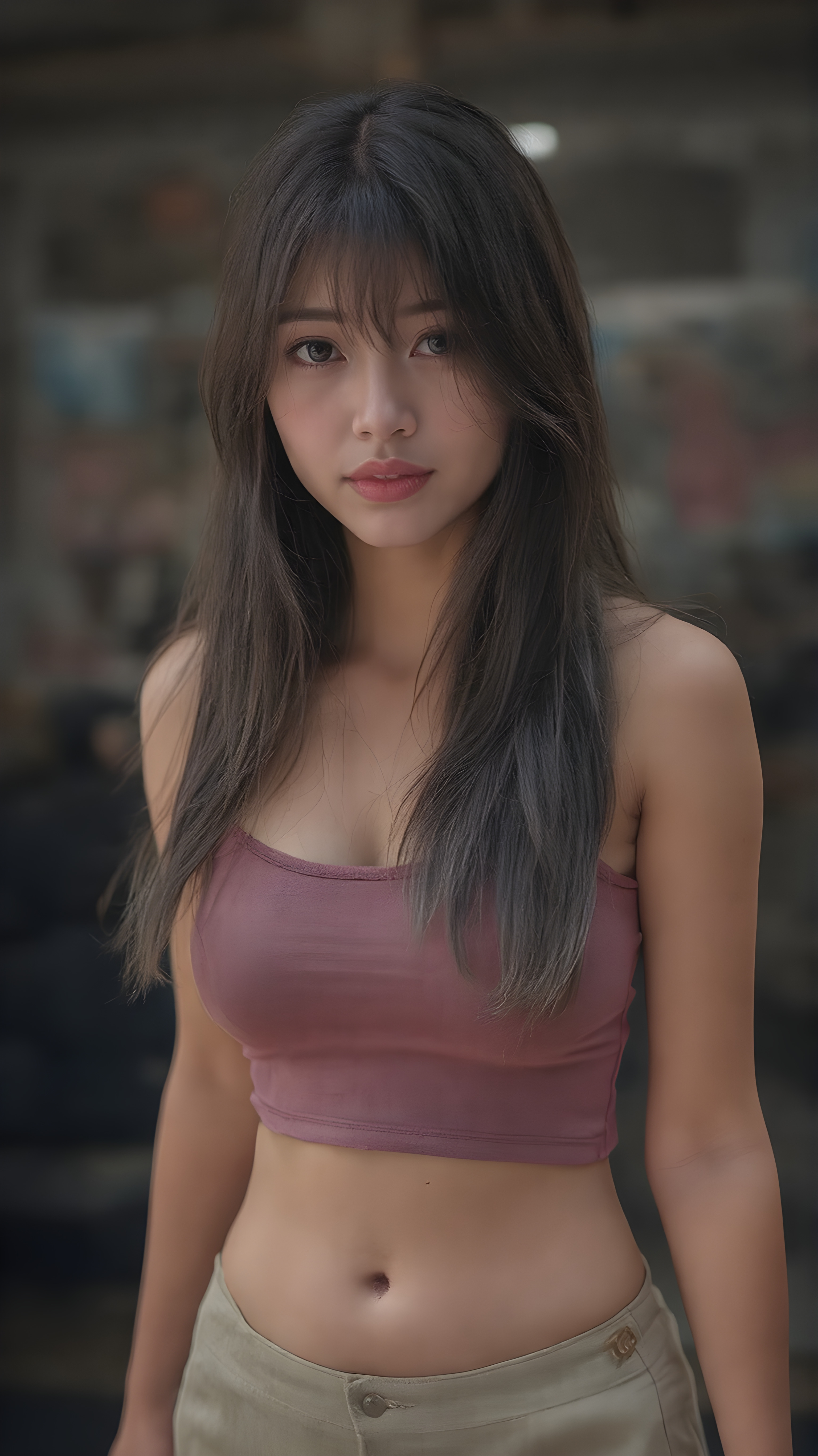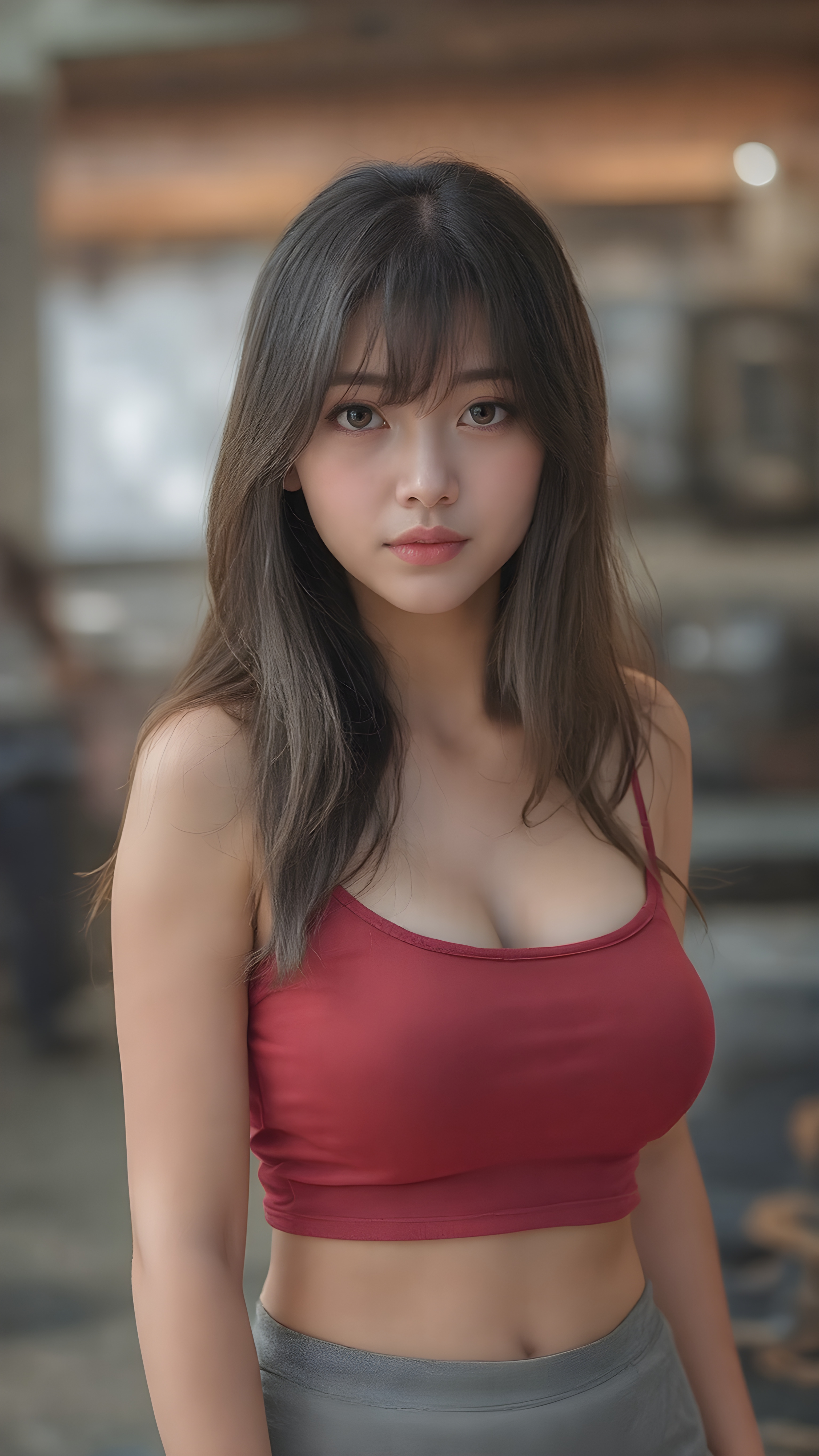 a beautifully drawn (((super realistic Japanese teen girl))), with a curvy figure and intricate details, dressed in a (((super short, tight tank top))), paired with a (((round, short mini skirt))), poised in a playfully confident pose, with long, flowing hair and striking, perfectly detailed eyes