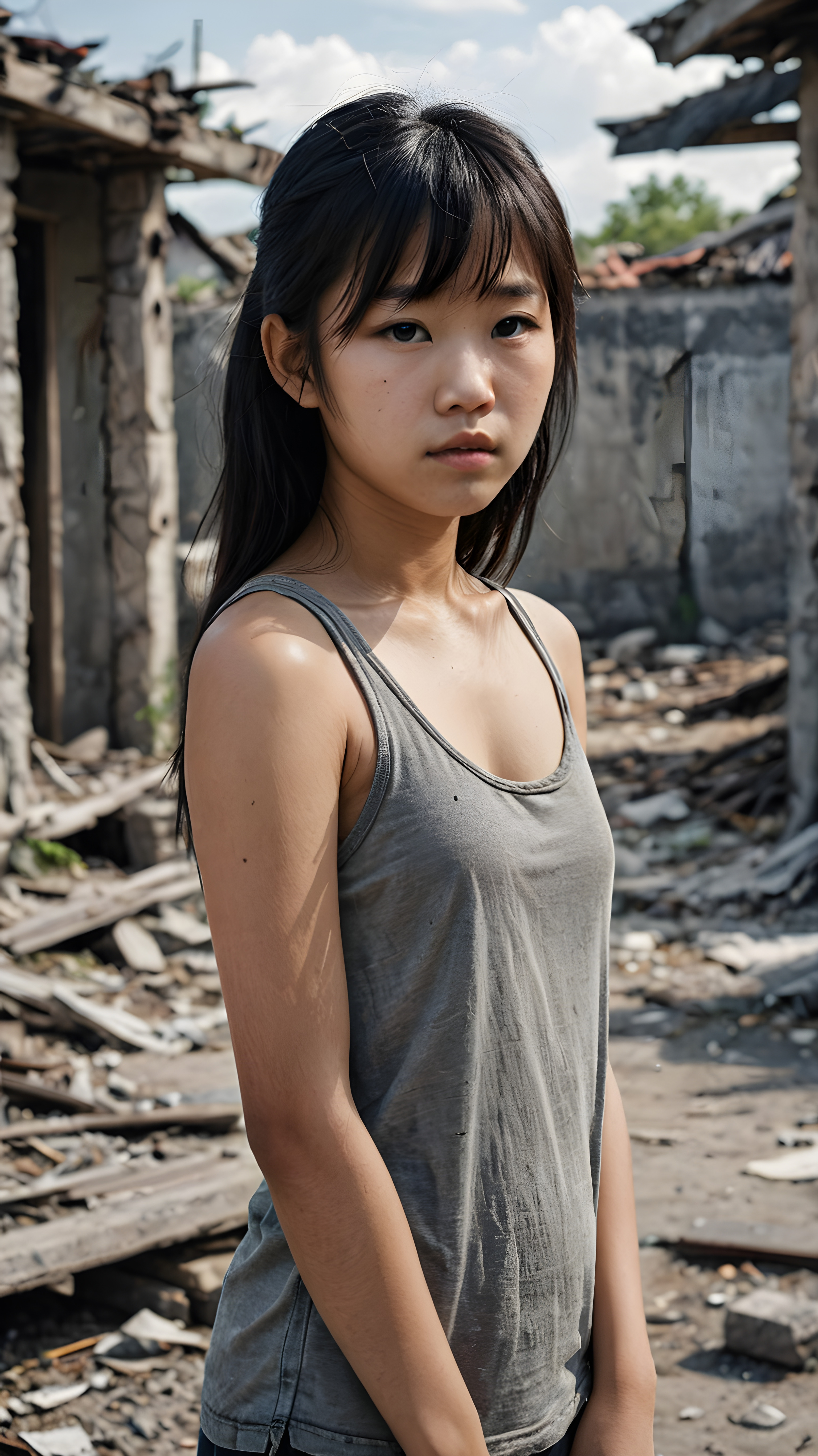 a (((super realistic image))) capturing a (((young, abandoned, sad, lonely, poor Asian teen girl, perfect curved body))) with shoulder-length disheveled obsidian hair in bangs cut, looking sadly at the viewer. She is hopelessly poor and scantly dressed in a tattered grey tank top, standing alone. Her face is dirty and she’s skinny. In the background, there are realistically detailed (ruins) representing destroyed houses from war, adding a sense of desolation and despair, (bird’s eye view)