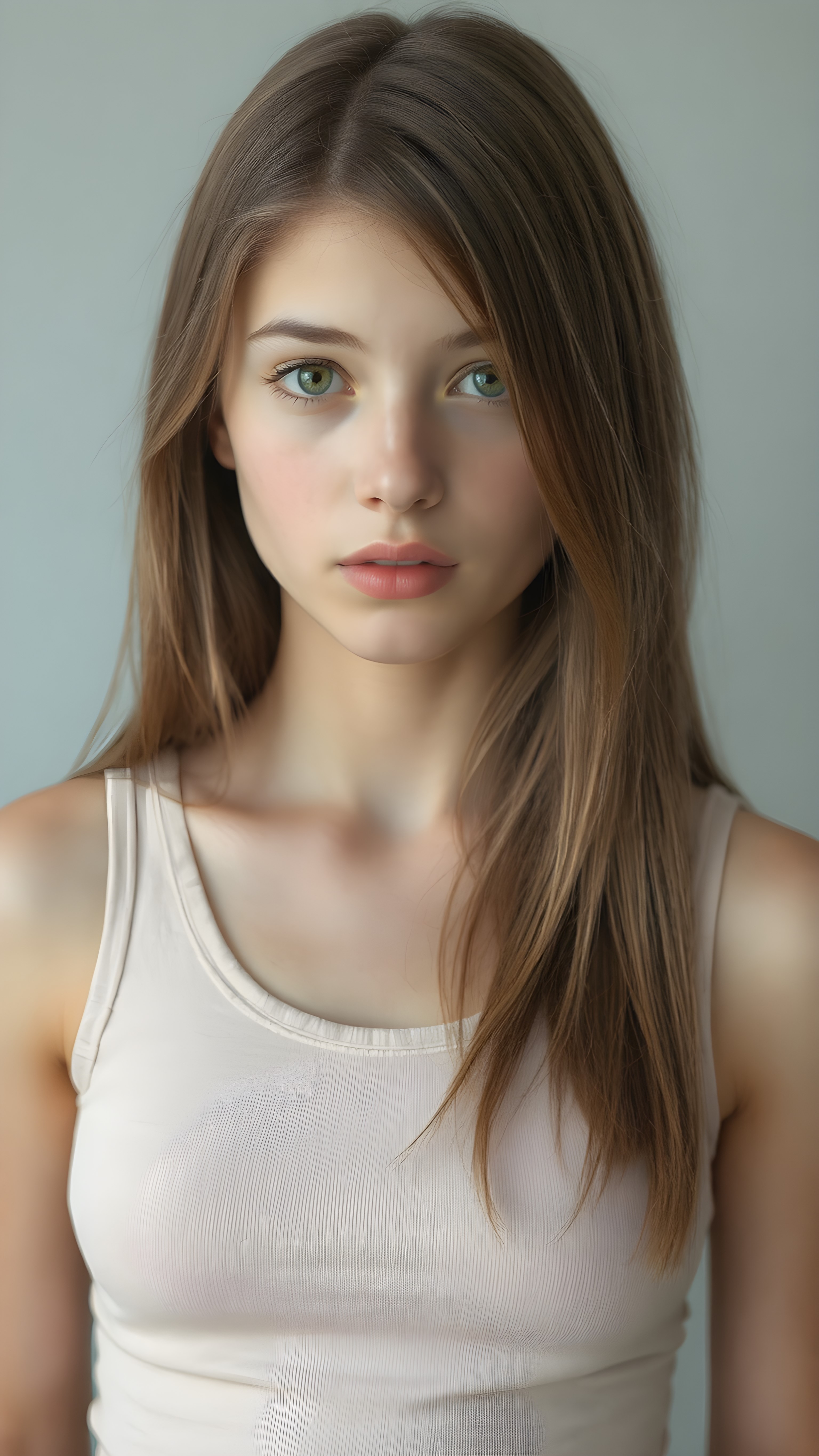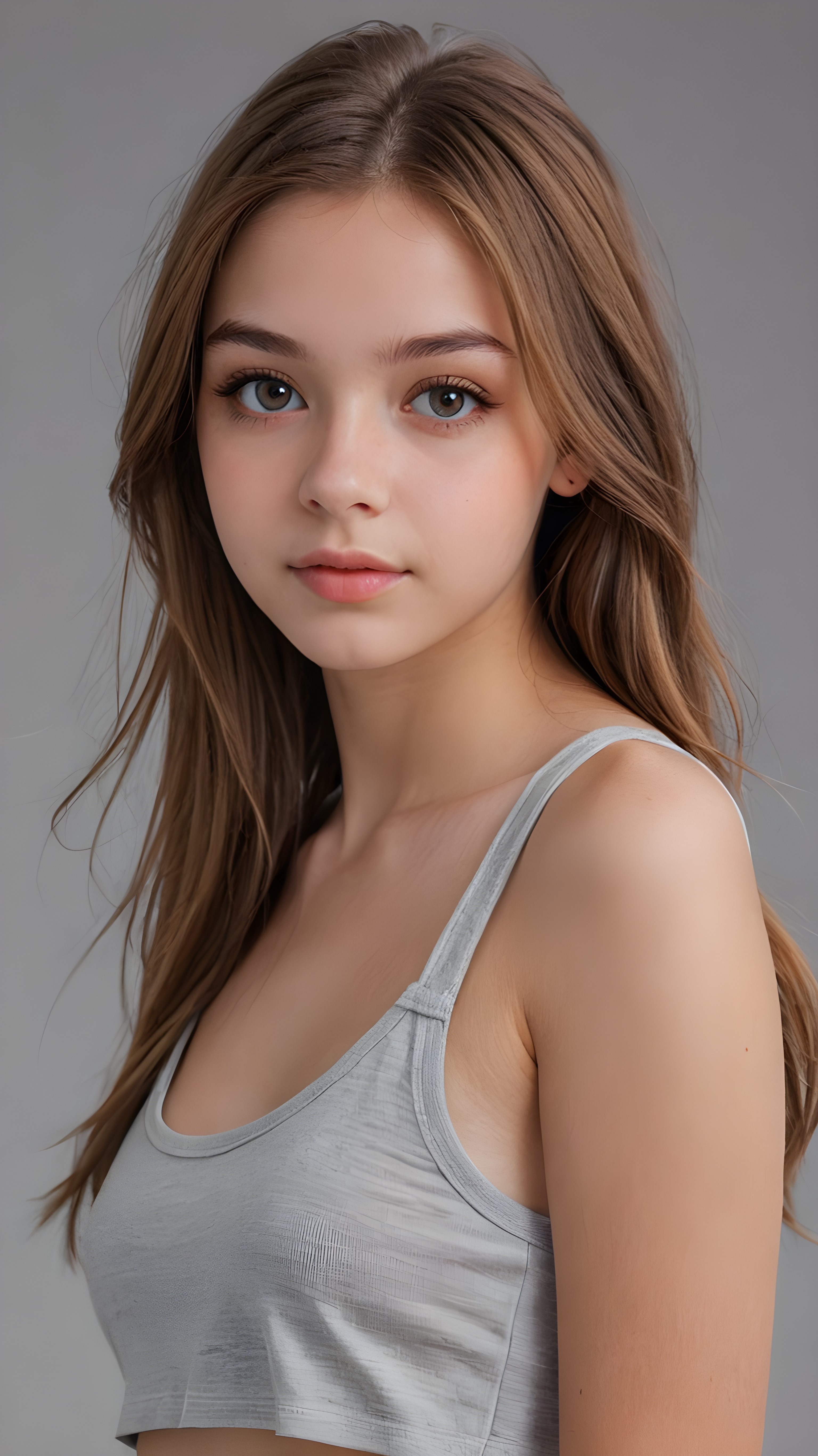 a (((realistic cute teen girl))), with straight soft long light brown hair, (full lips), and ((big amber eyes, round face)) that exude innocence, paired with a (short cropped tank top) that emphasizes her perfect body, (perfect skin), her figure is so perfectly proportioned that it defies reality, (((against a light grey backdrop))) ((upper body portrait))