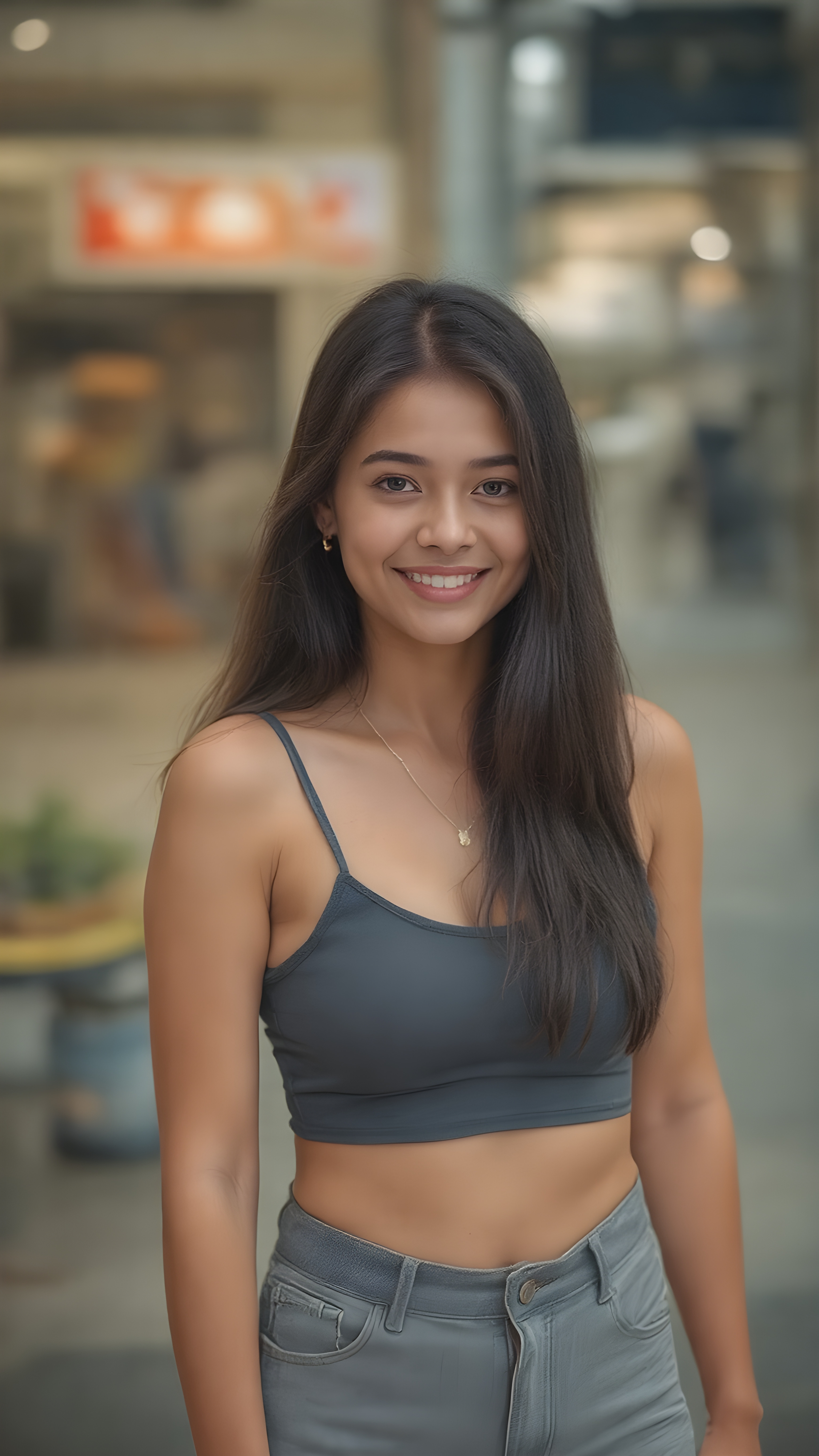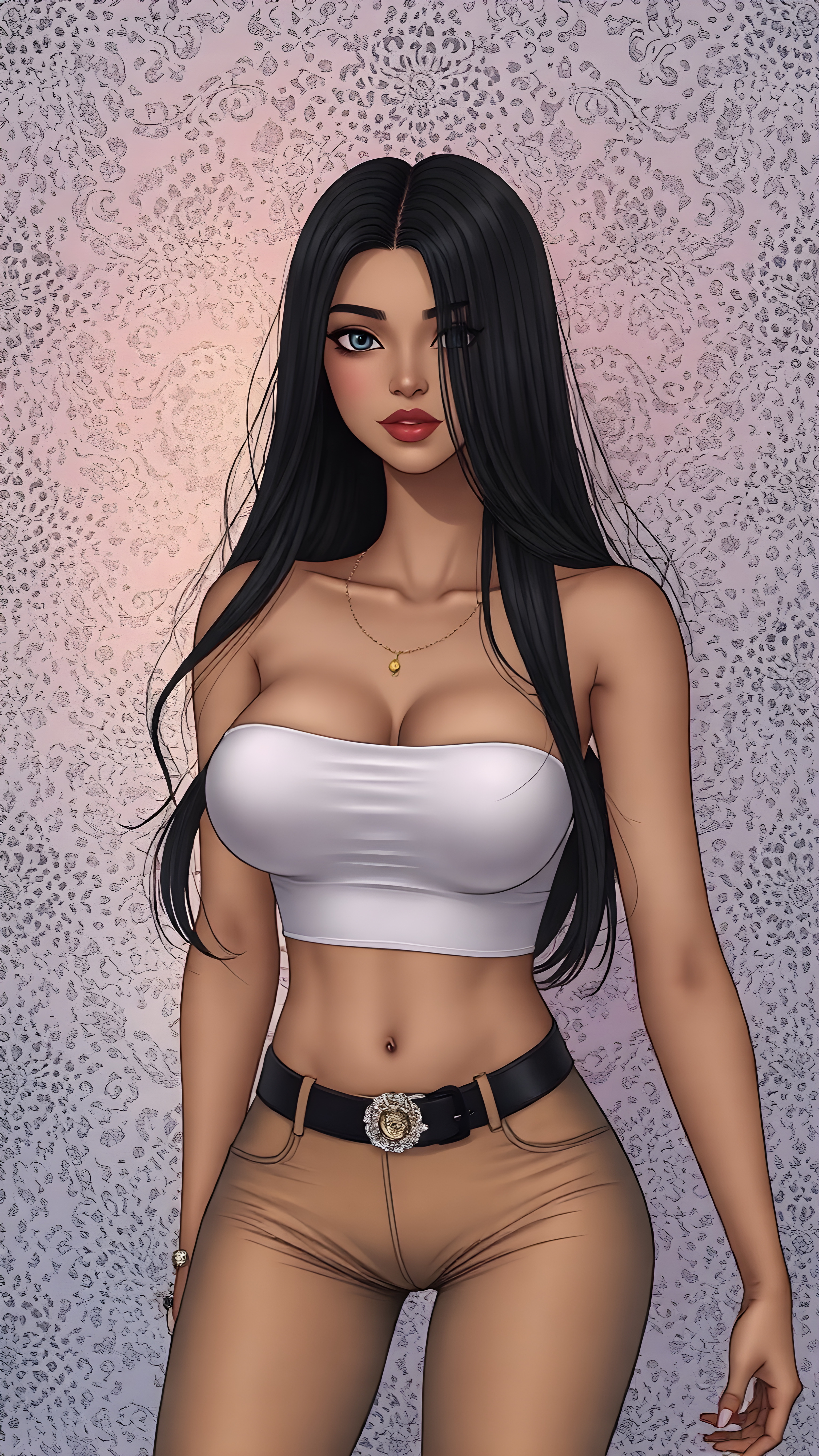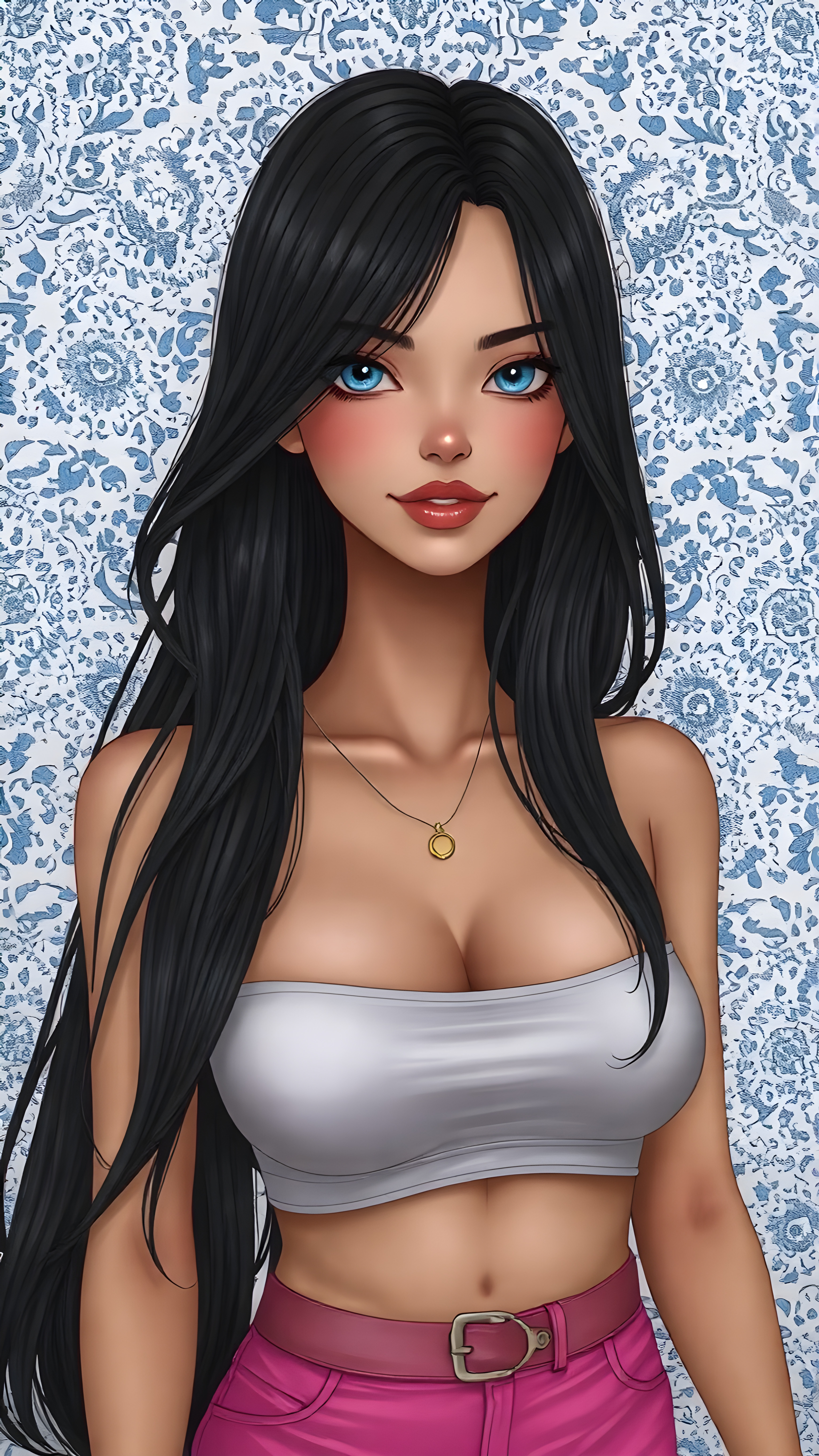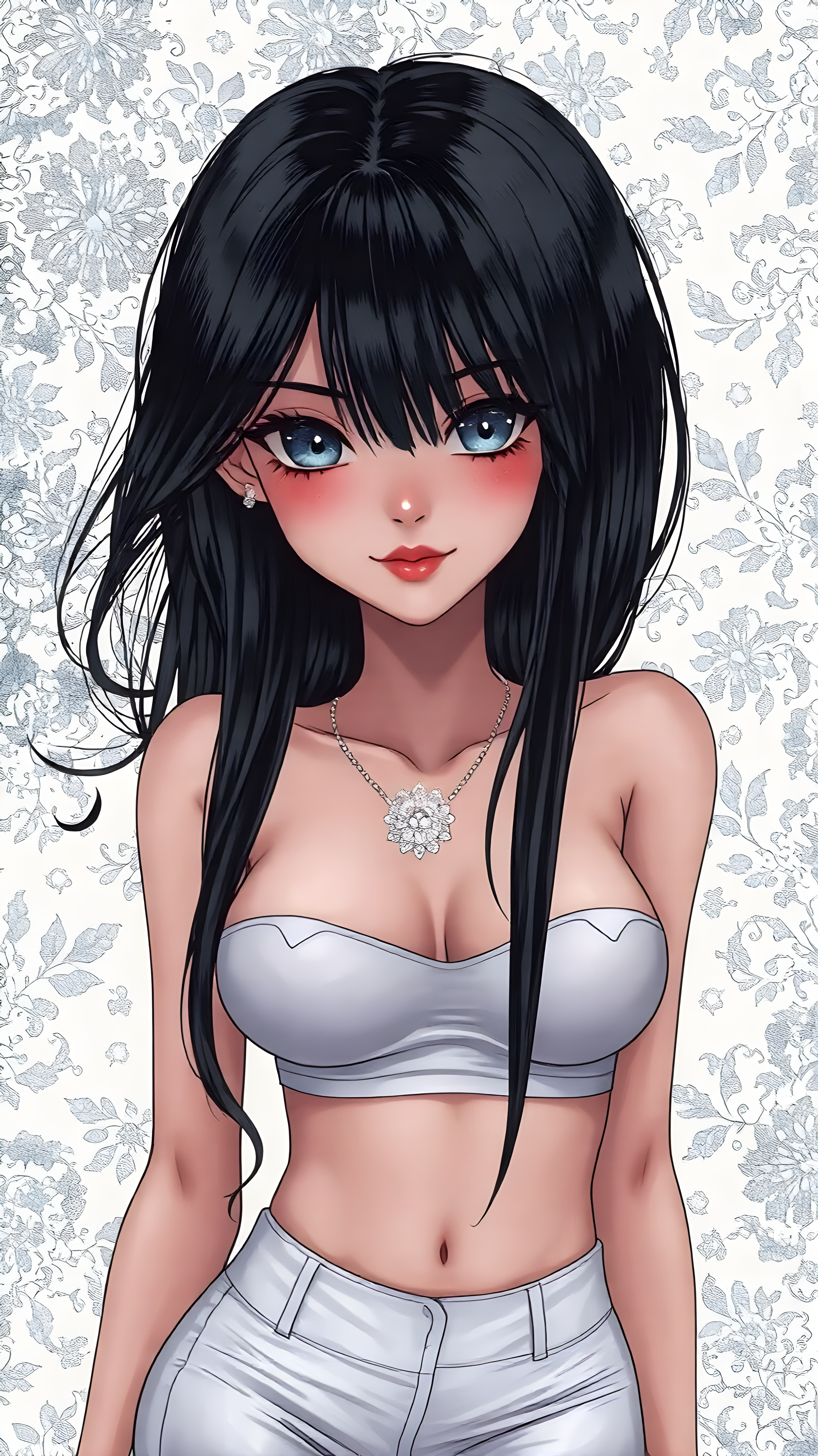 A (((fantastically super cute and well busty girl))) with long, flowing black hair that frames her face perfectly, sporting (((brightly colored, tight fitting hot pants and a sleek, cropped top in a (((white and blue theme))), accessorizing with sleek, luxe details like intricate doilies and a (((highly detailed, vibrant backdrop) featuring a blend of (abstract white and blue patterns) that evoke a sense of extreme detail and luxurious opulence