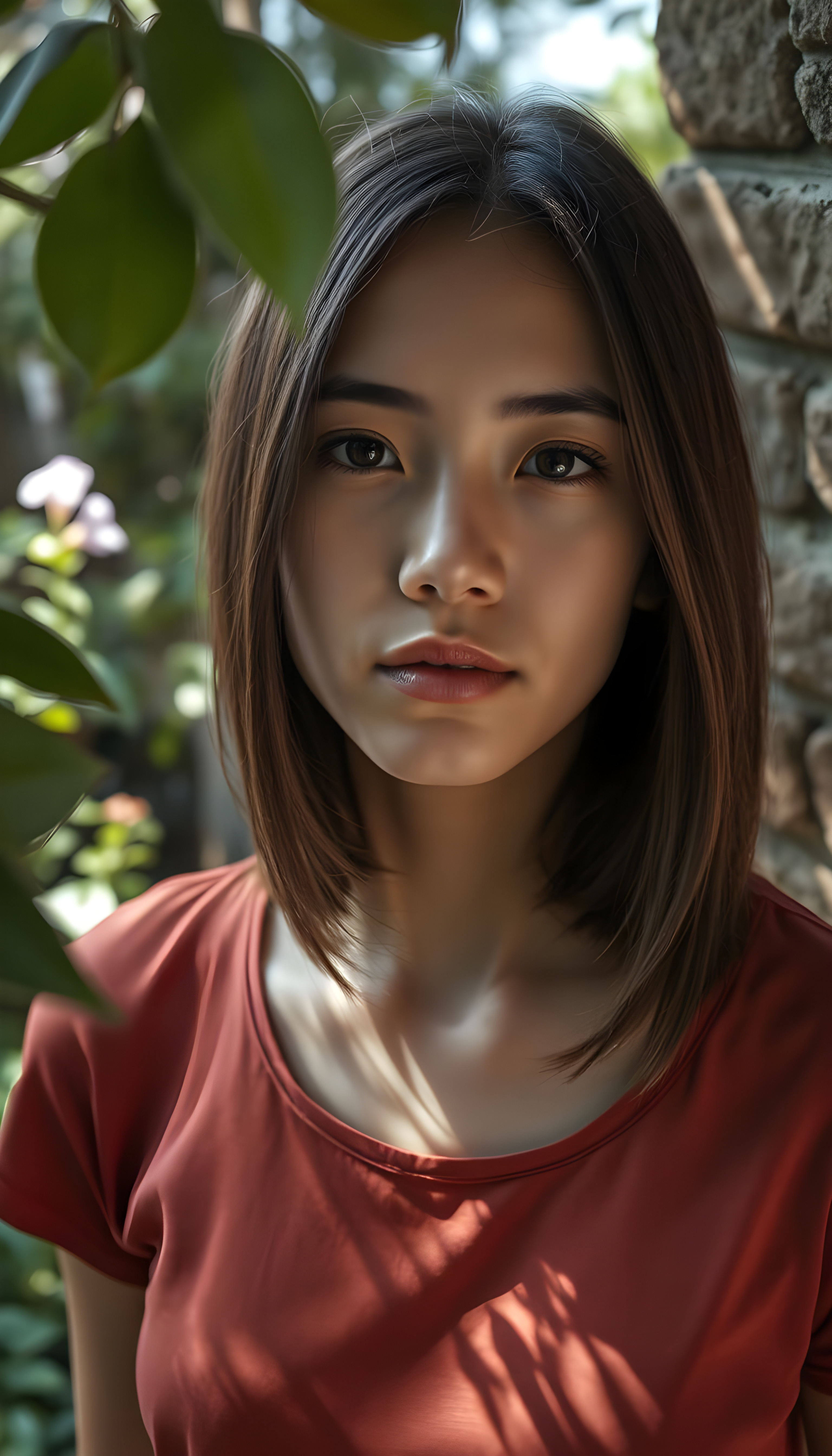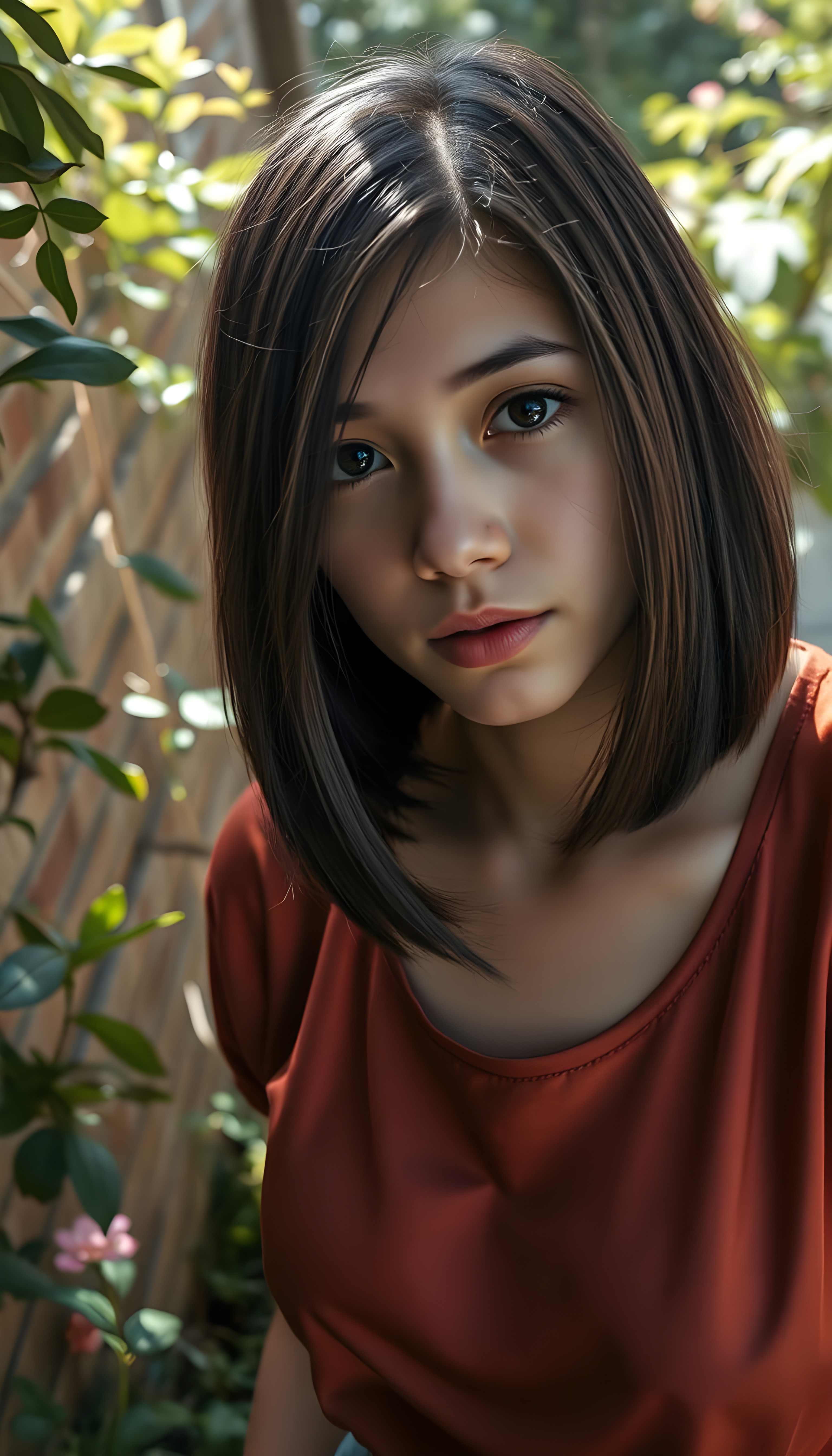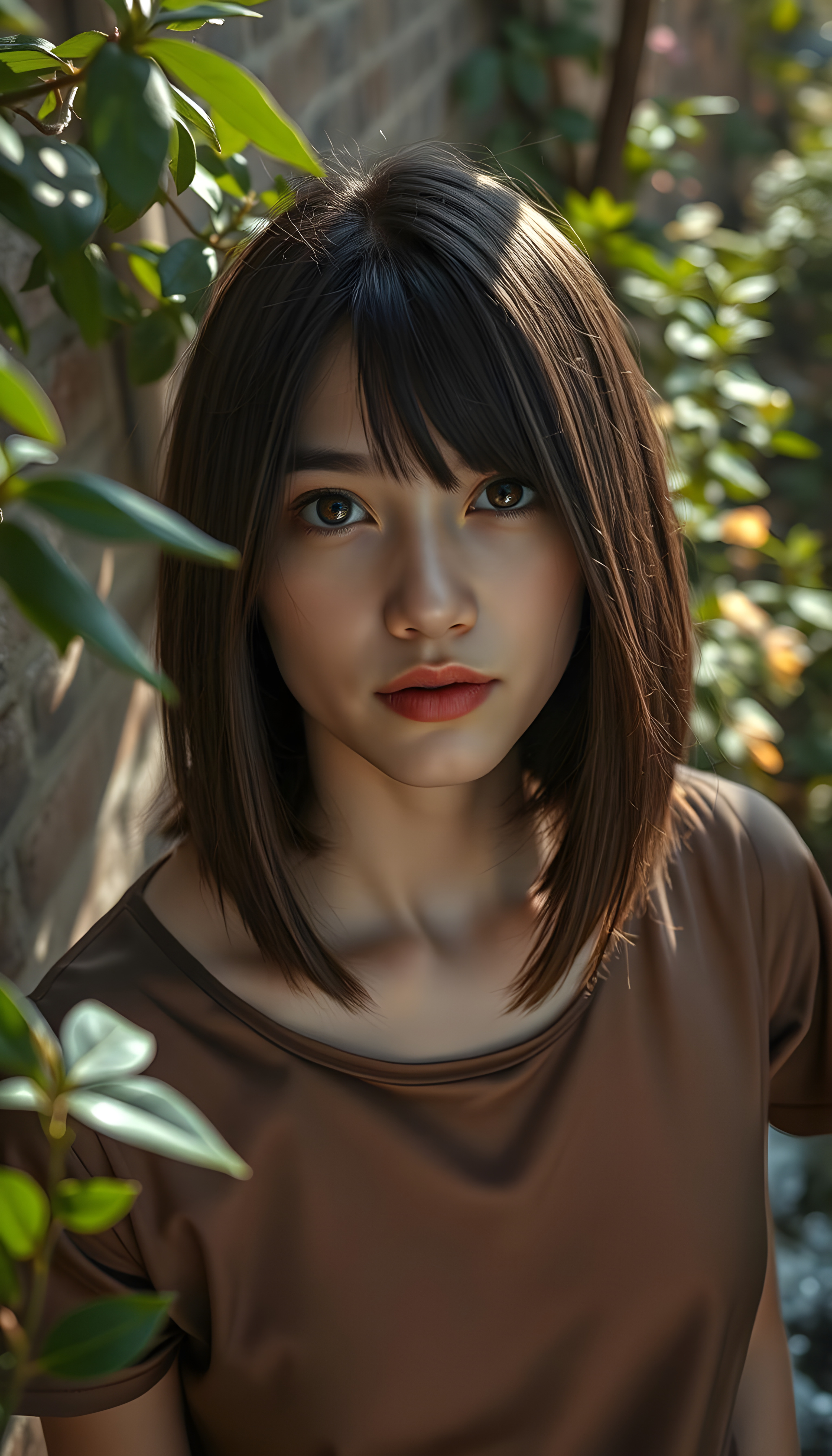 A vibrant, high-angle view captures a cute innocent young woman with soft brown, straight shoulder long hair adorned with black highlights framing her face symmetrically, bob cut. Her flawless, round face radiates fear, enhanced by the dappled sunlight filtering through nearby foliage. She wears a stylish, thin silk t-shirt in a rich, complementary color, blending seamlessly with her natural beauty. The background features a rustic brick wall, partially obscured by lush greenery and blooming flowers, creating a harmonious and picturesque scene.