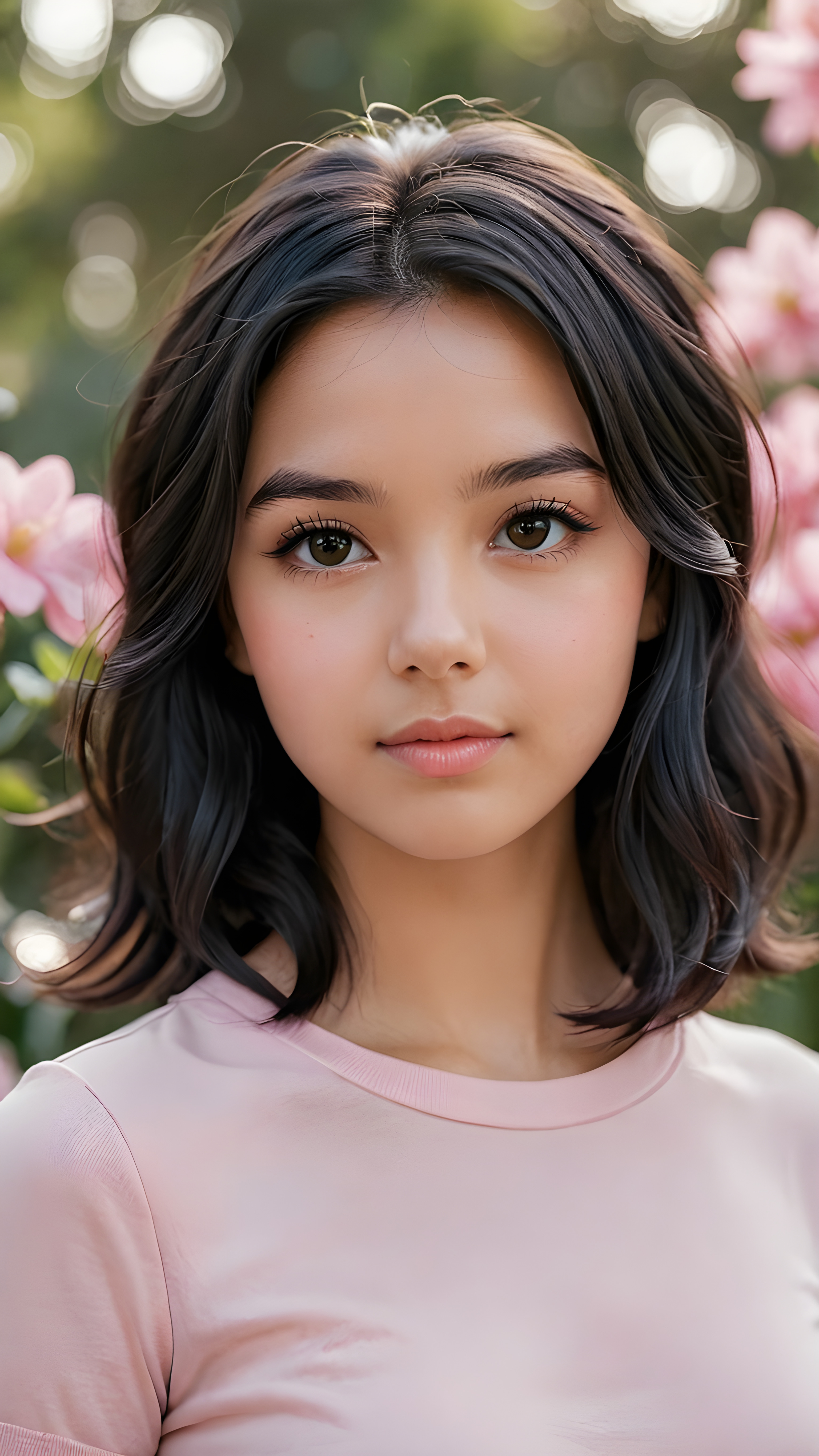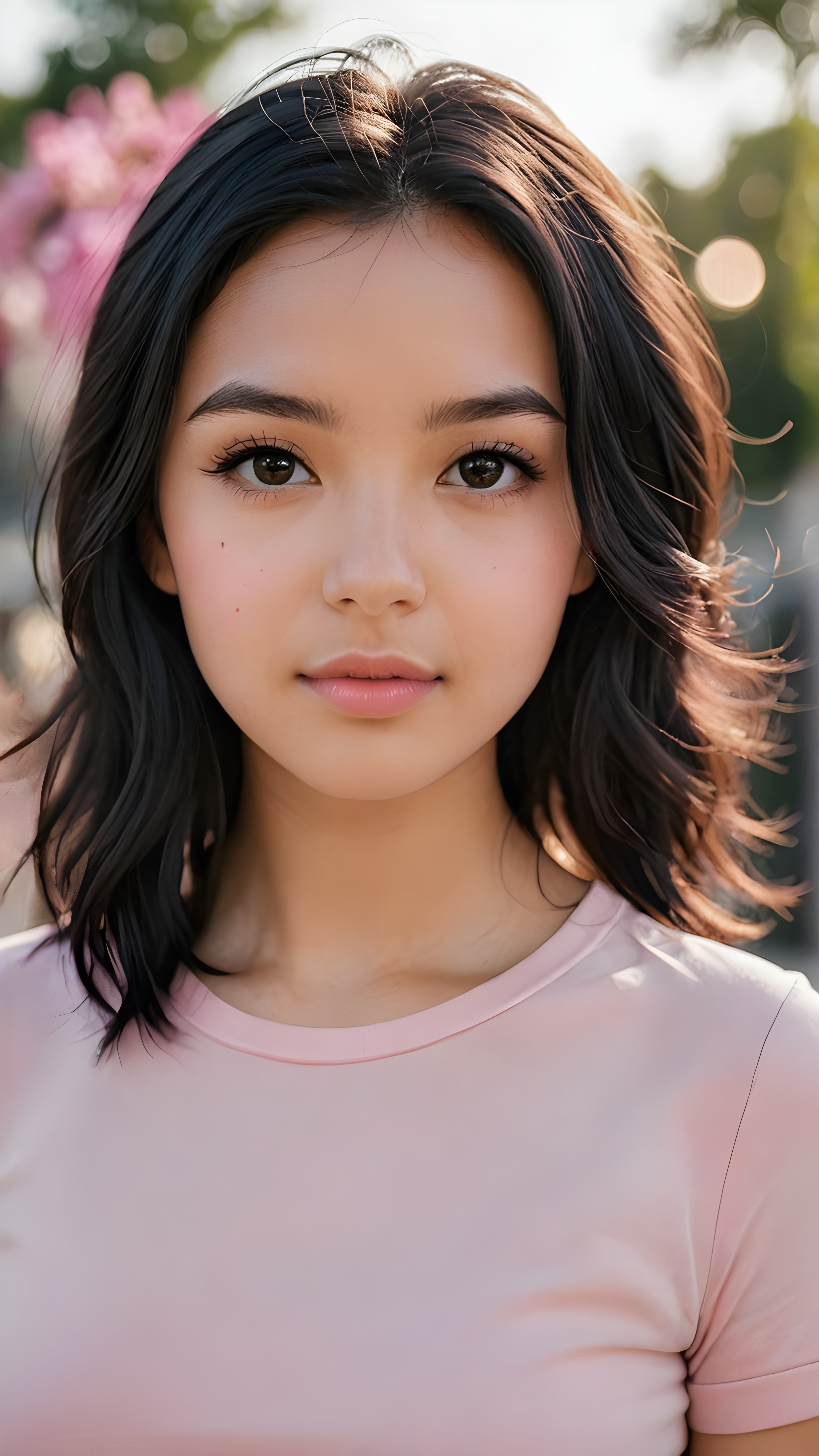 a (((professional photograph))) showcasing a beautiful young girl with sleek, soft, slightly curled black hair framing her face, the lips are full and painted in a light shade of pink, she wears a short tight black T-shirt, which accentuates her (round) figure, enjoying the scene