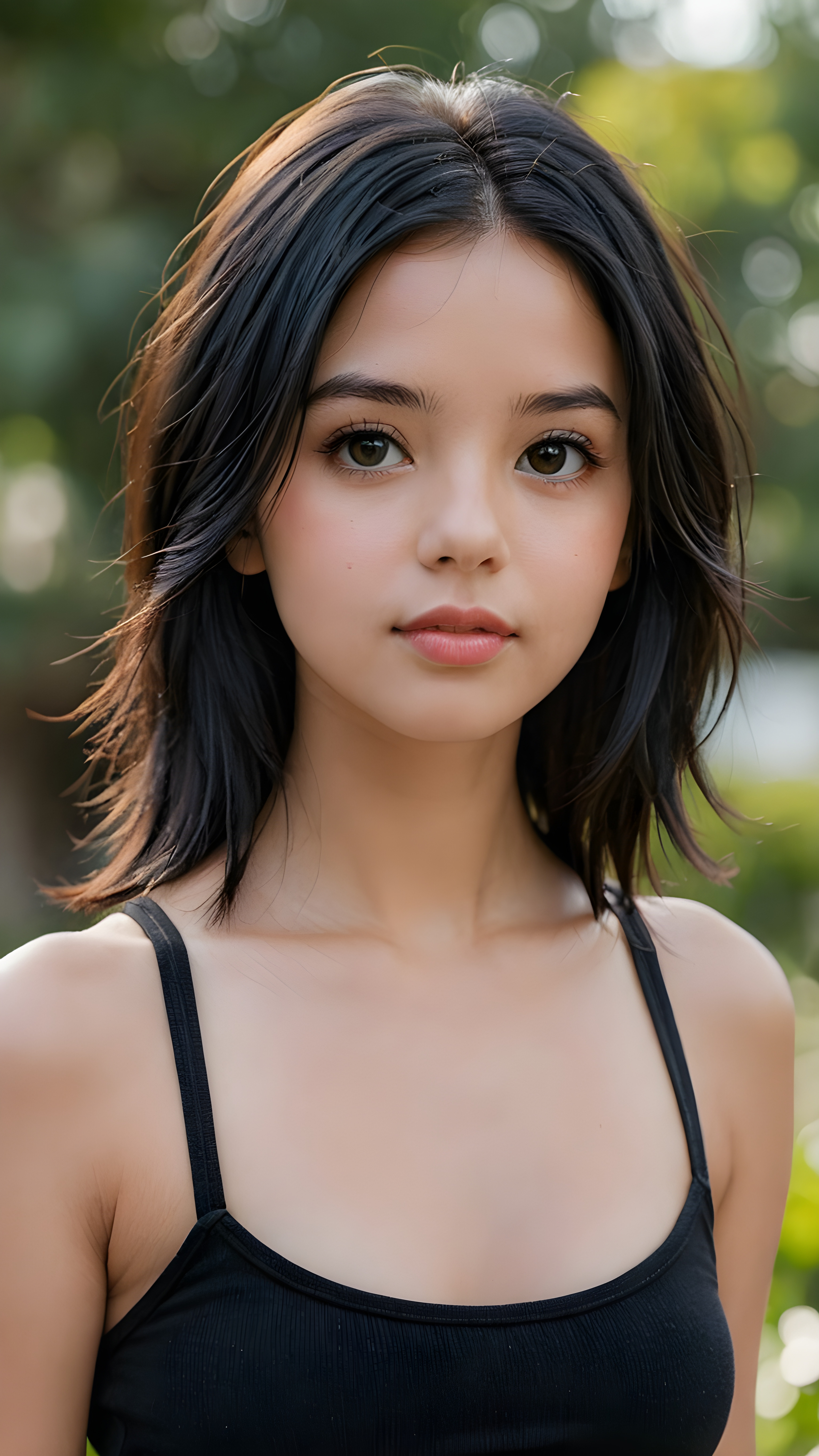 a (((young girlie))), wears a short cropped black tank top, straight soft long black hair, ((round face)), full kissable lips, round eyes, perfect skin