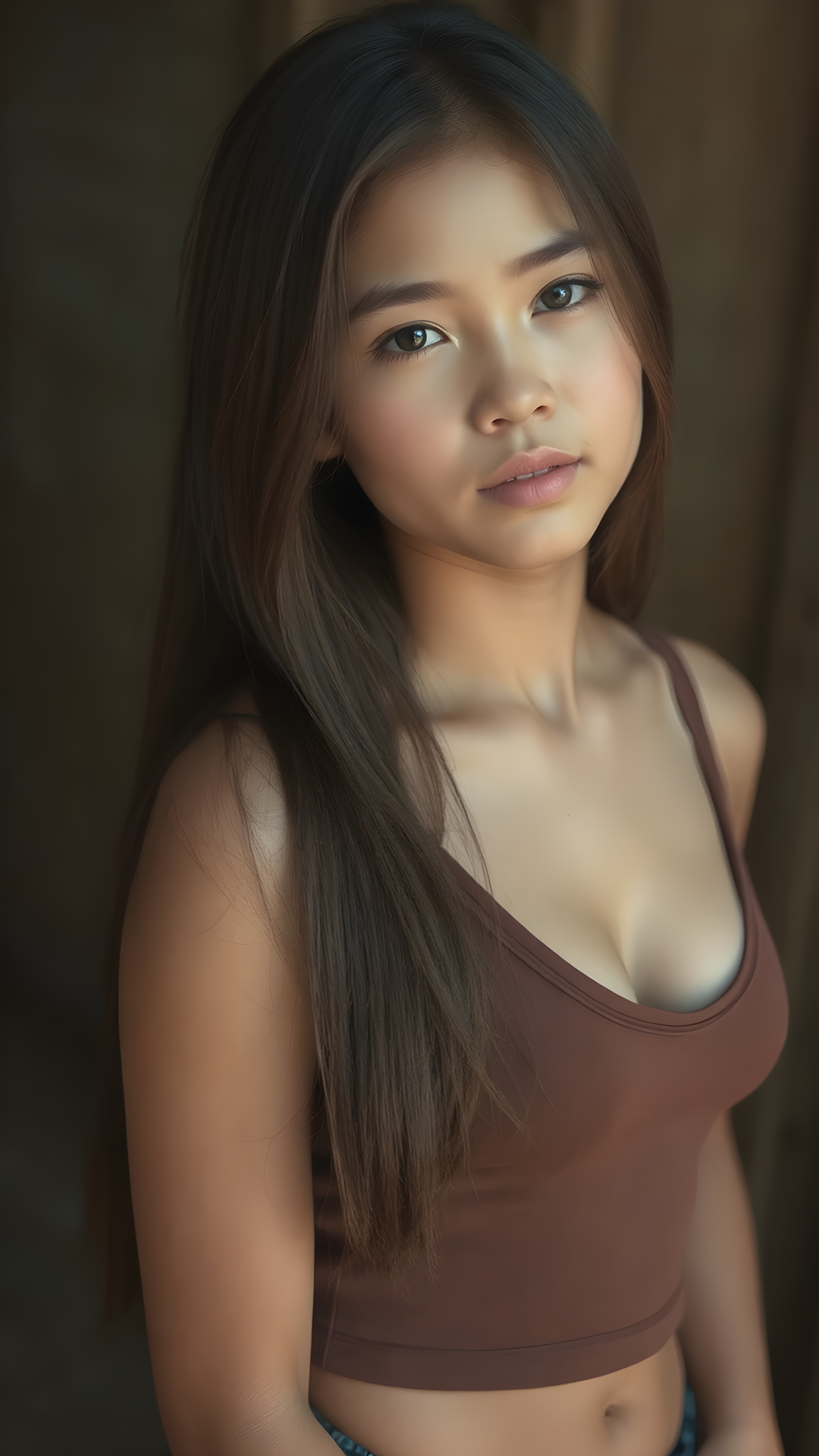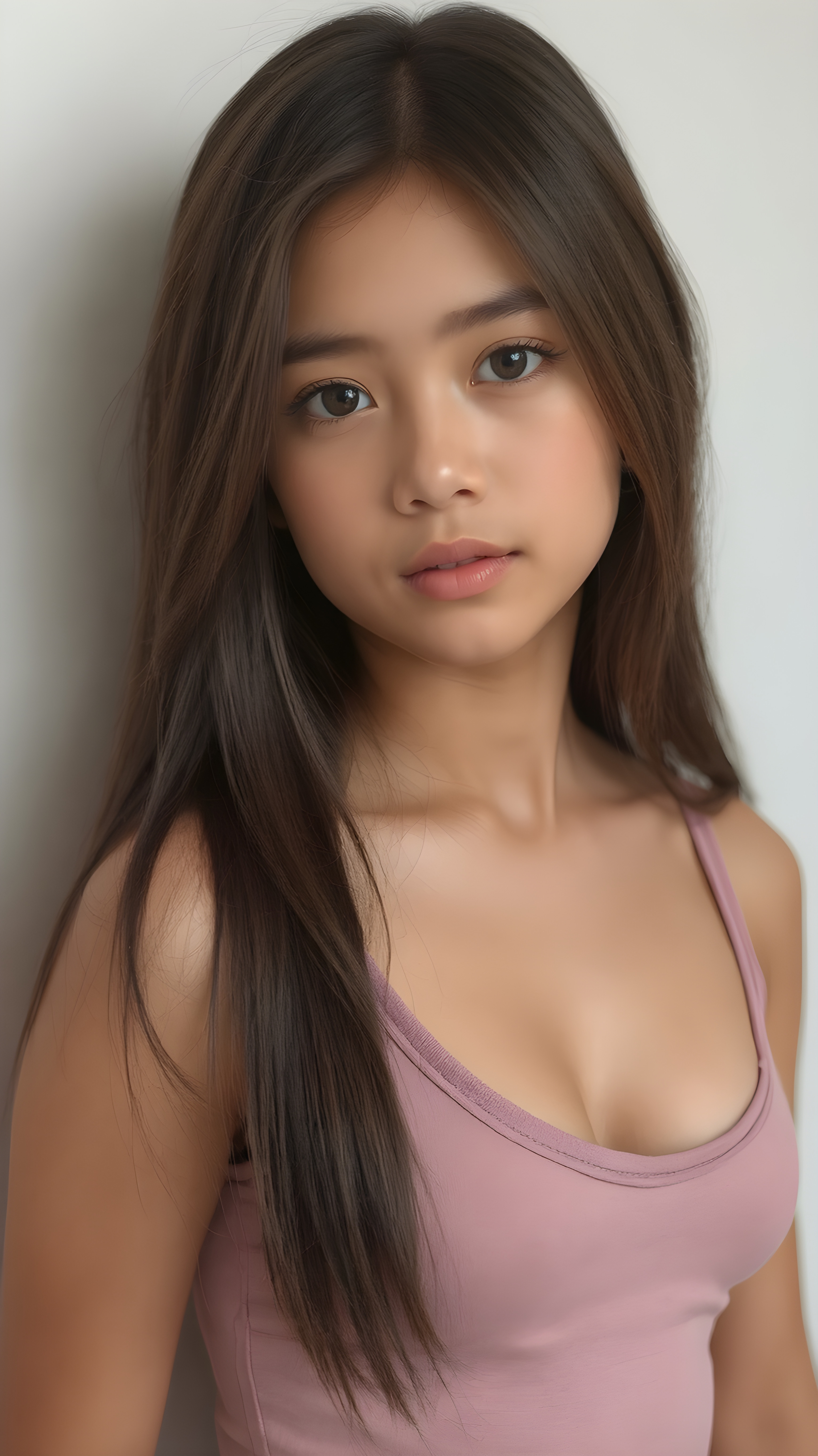 realistic, super high quality upper body portrait in 1:3, beautifully proportioned 14 year old girl, with luxurious long straight blond super soft hair, round cheeks, and bright green eyes. She’s wearing a (short tight white crop tank top, deep v-neck, silver skin, and perfectly complements her full figure), against a dark backdrop