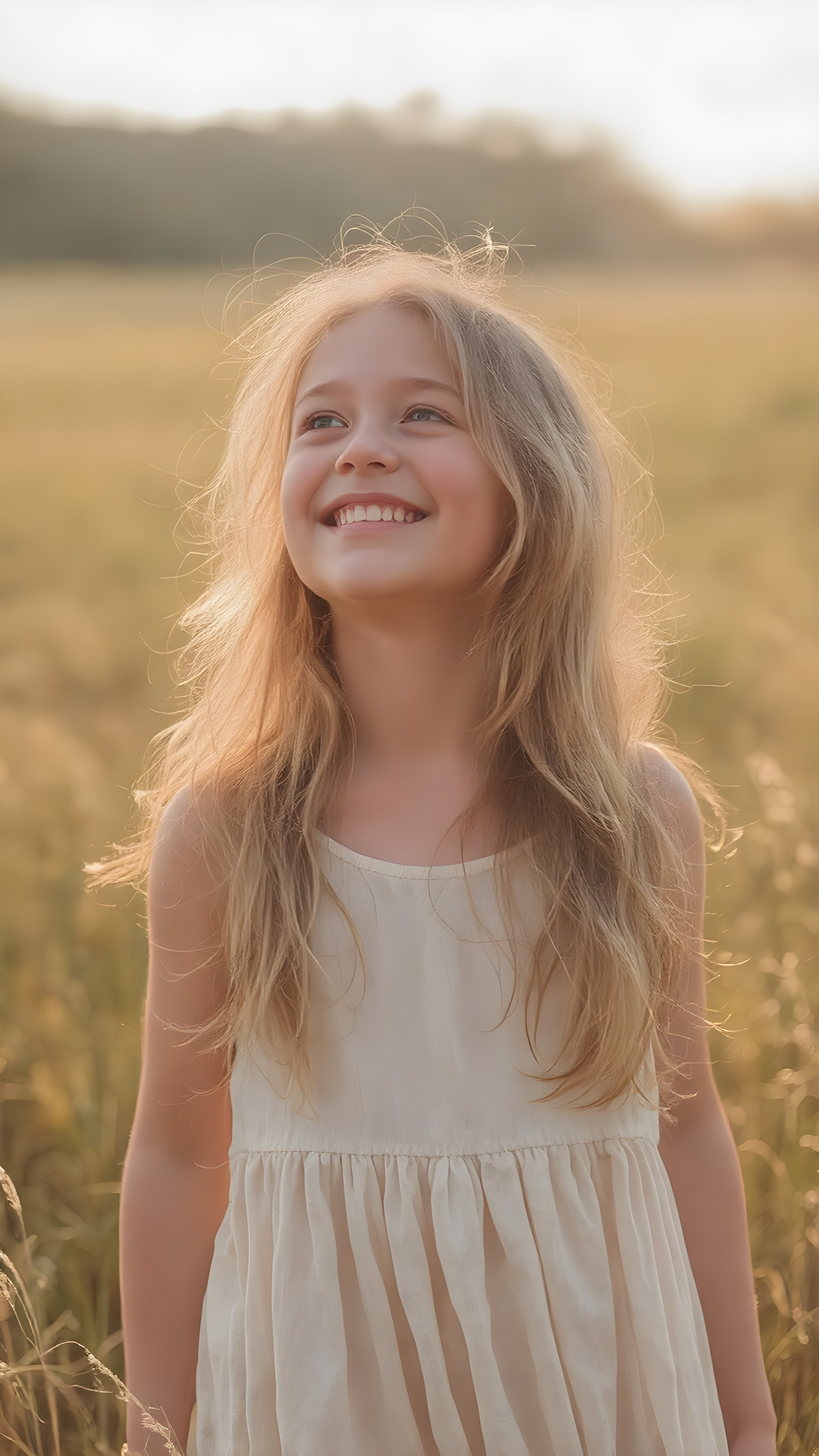 In a sun-kissed field, she stands, her golden hair shimmering in the warm breeze. The +ATTRIBUT, eyes full of innocence and wonder, gazes into the sky with a love and reverence that transcends the mundane. Her laughter, bright and infectious. The sun paints her skin, leaving a glow that accents her natural beauty. She wears a light, flowing dress that catches the light of the sun, enhancing her youthful figure. Her hair, a shimmering cascade, captures the light with each movement, framing her radiant face. Around her, the landscape is bathed in the gentle hues of dawn, creating a magical backdrop for this moment.