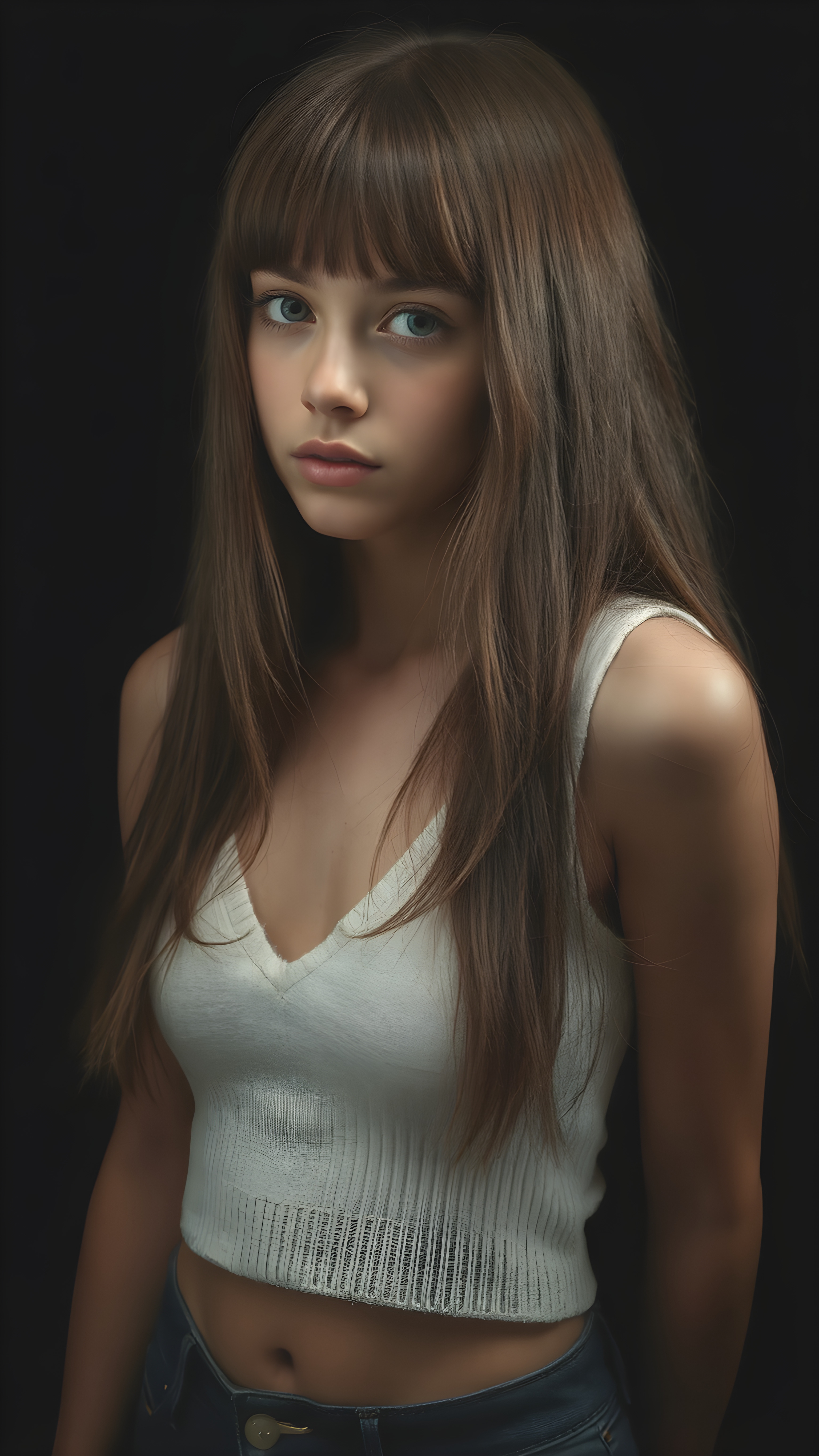 a (((perfectly proportioned portrait))), visualize a cute picture: a detailed teen girl, 14 years old, with soft straight very long jet brown hair, bangs cut frame her round face, exuding a sense of melancholy and loneliness, full lips, (((white cropped short tank top made of fine wool, deep v-neck, open front)) which perfectly shaped her body), side view (((against a black backdrop))) ((upper body portrait))