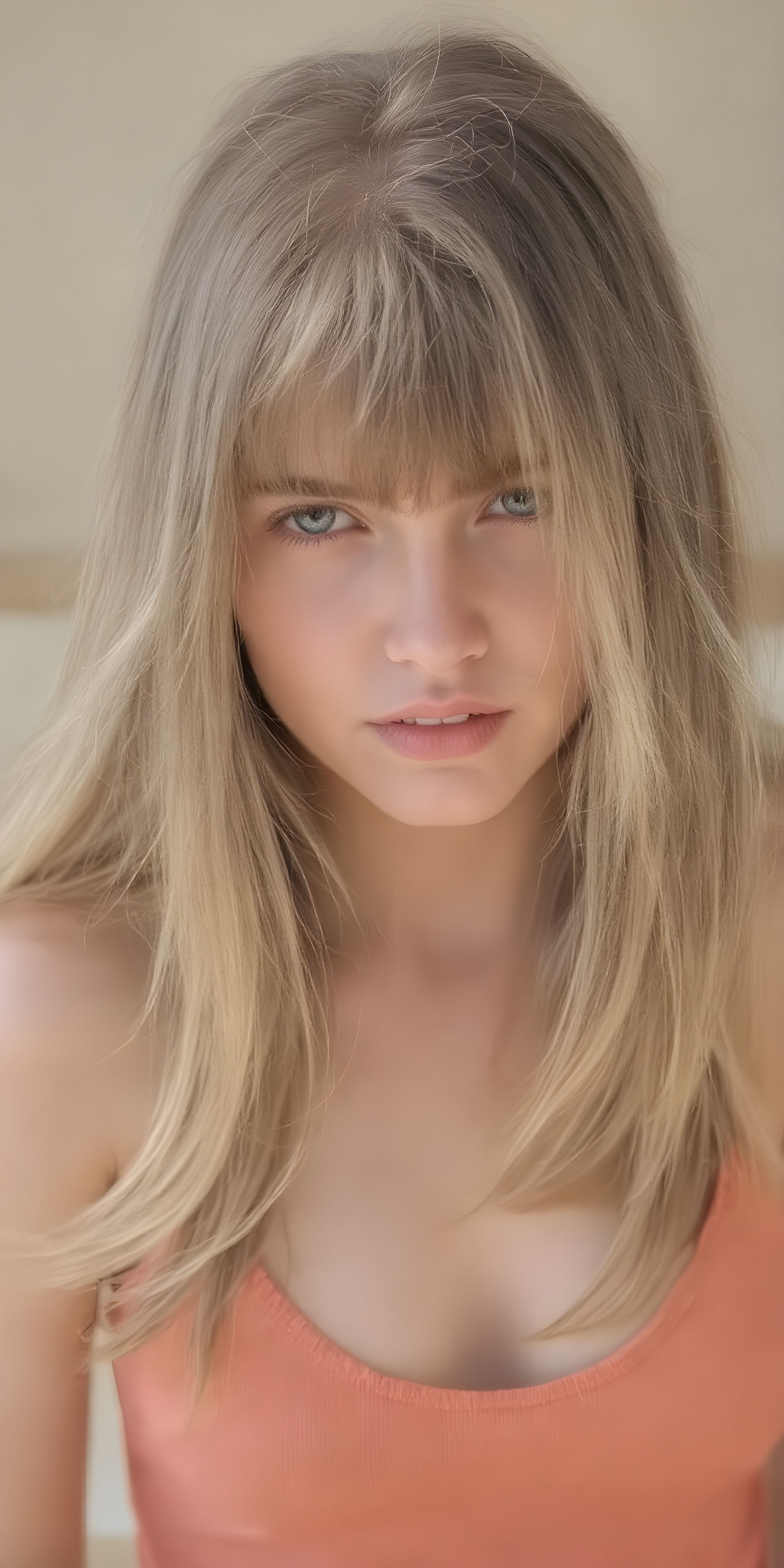 a thoughtful (((young cute teen model girl))) with long soft, straight hair framing her face, bangs, caught off guard as it cascades down her shoulders and covers her upper body in a in a plunge neck (((cropped low cut tank top))), expressing a mix of bashfulness and embarrassment, perfect curved fit body ((sunny backdrop))