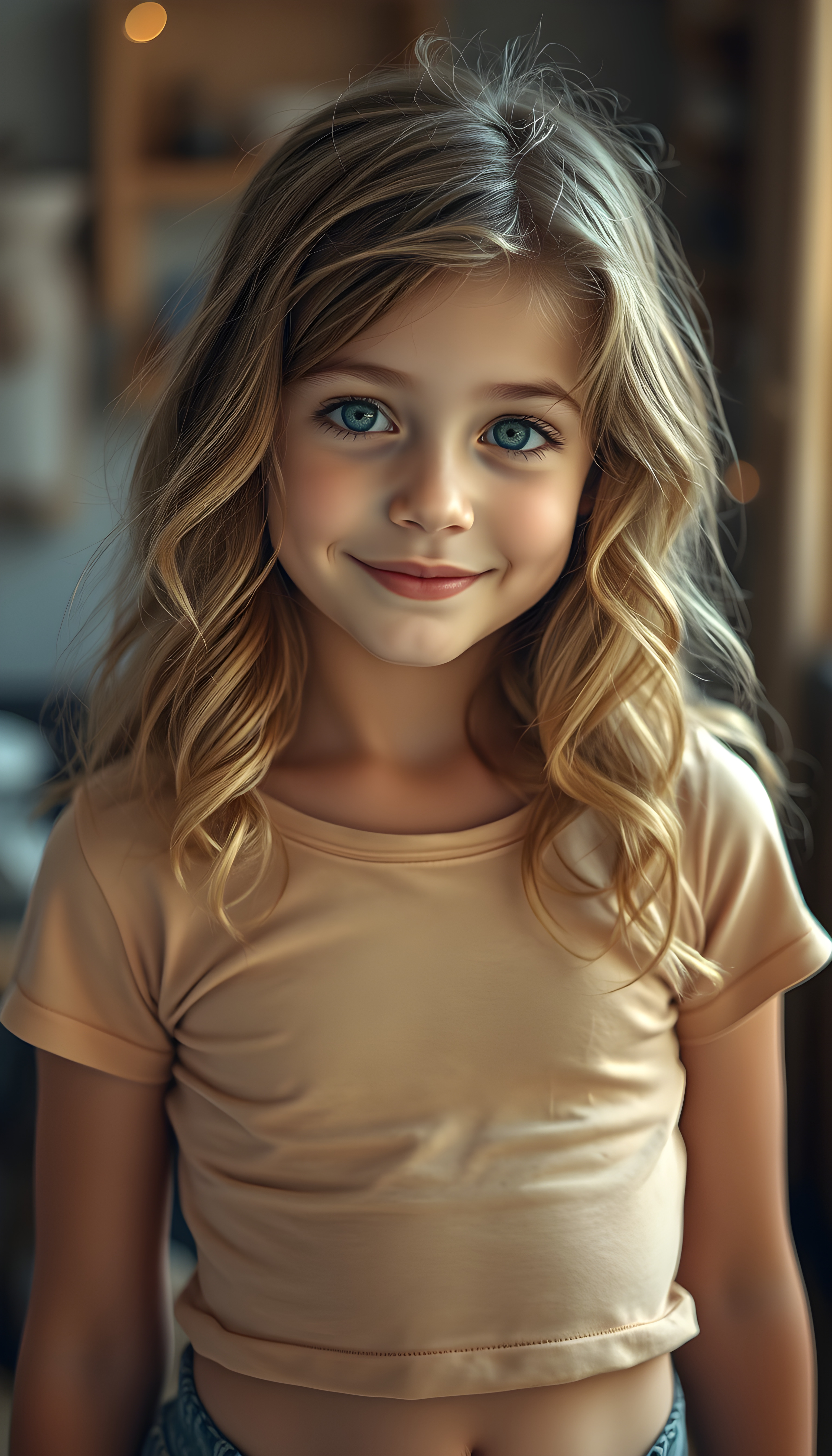 A young, cute girl with brown wavy hair and golden highlights smiles shyly at the camera. She has beautiful, shiny blue round eyes, a pouty mouth, and a small nose. Her skin is flawless and slightly tanned. She wears a short, tight T-shirt that perfectly accentuates her wonderful, feminine body and shows off her curves to perfection.