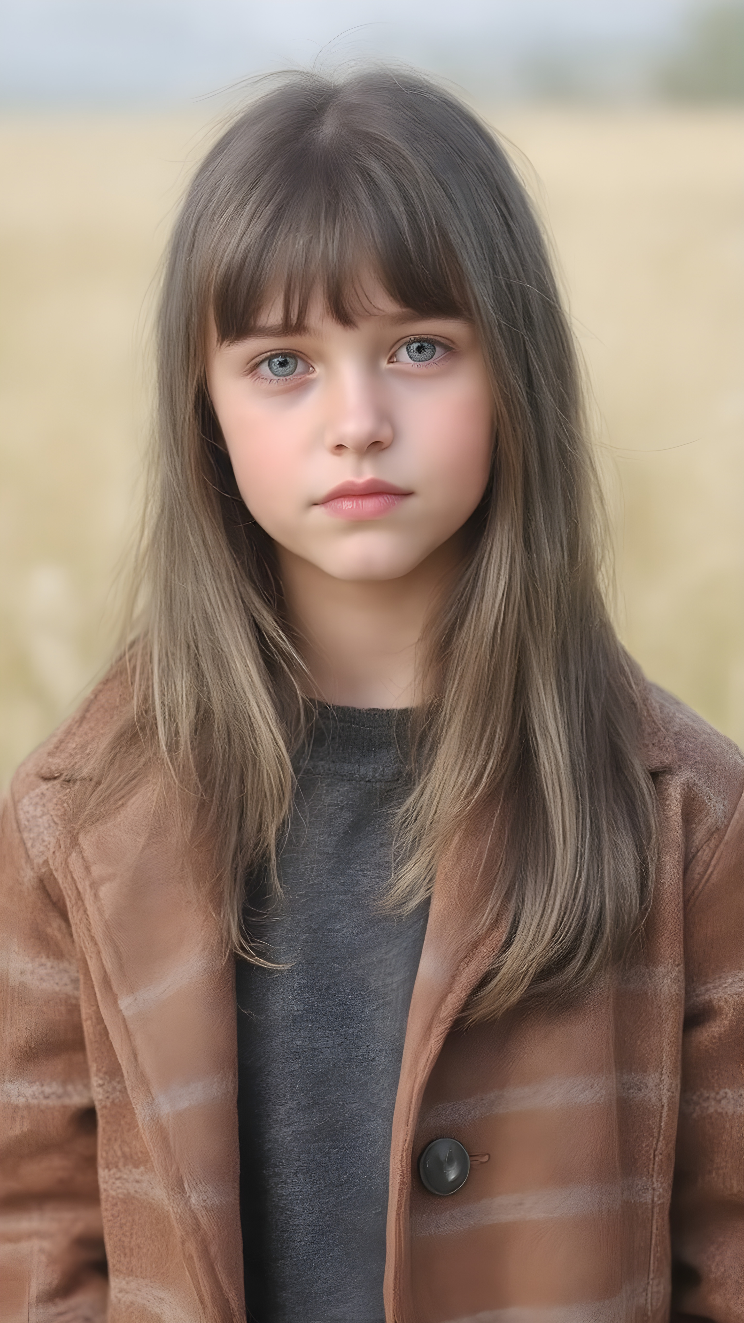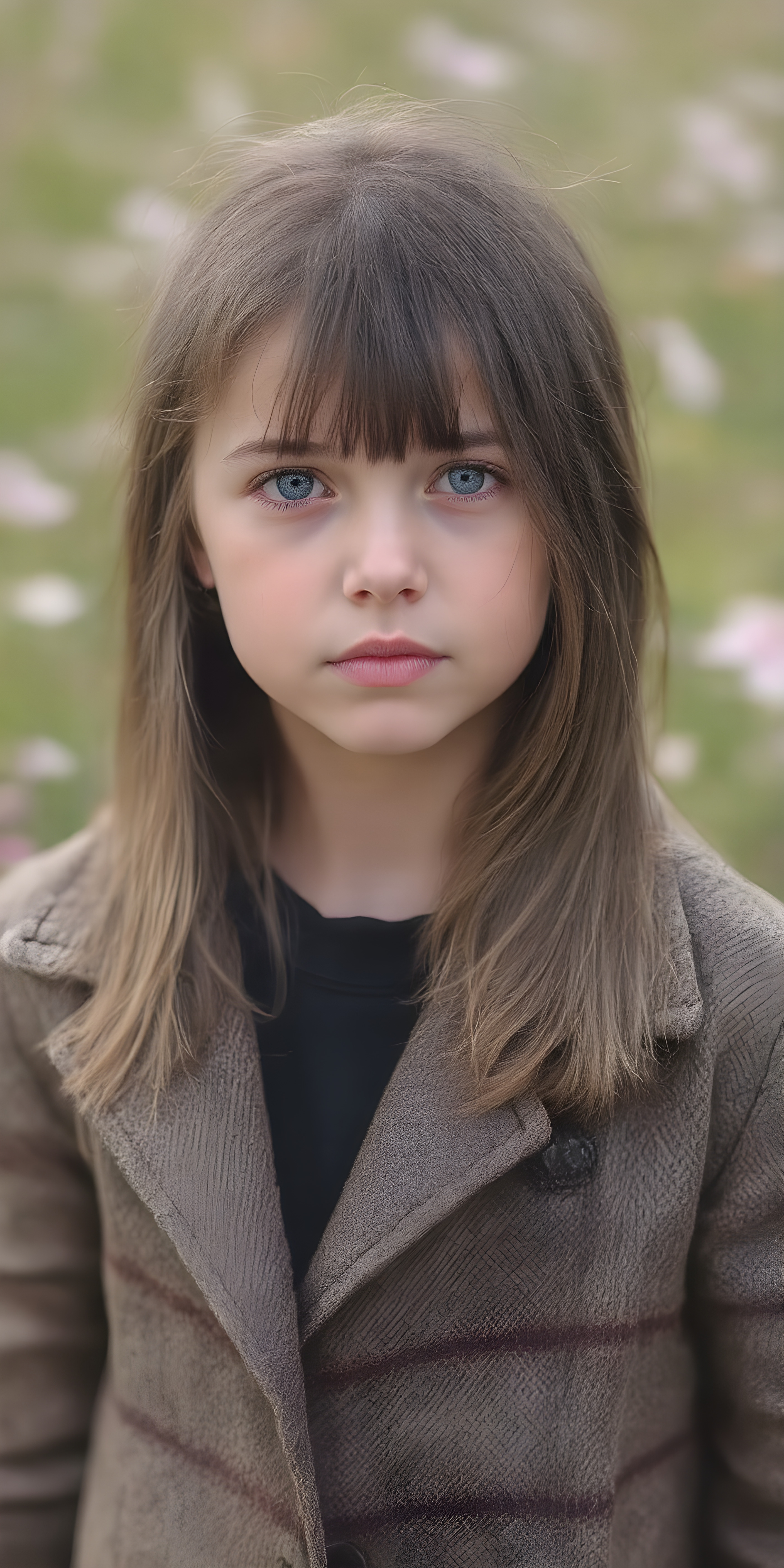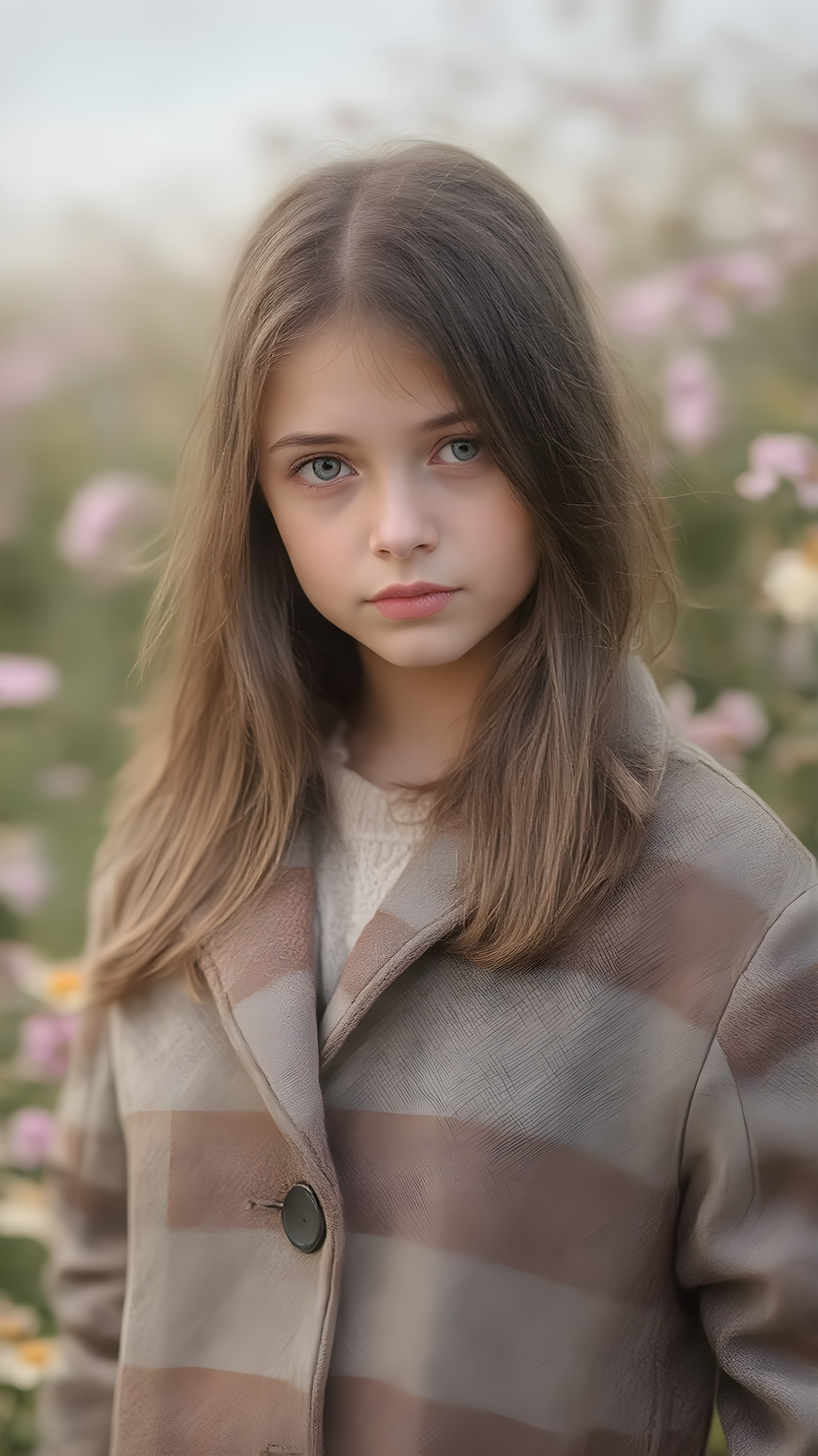 a detailed perfect portrait with pastel colors, young cute girl, stands in a sunny meadow. She wears a ((checkered coat in brown and grey)) and black shirt, she look at the viewer, detailed shiny straight brown hair, blue eyes, round detailed face
