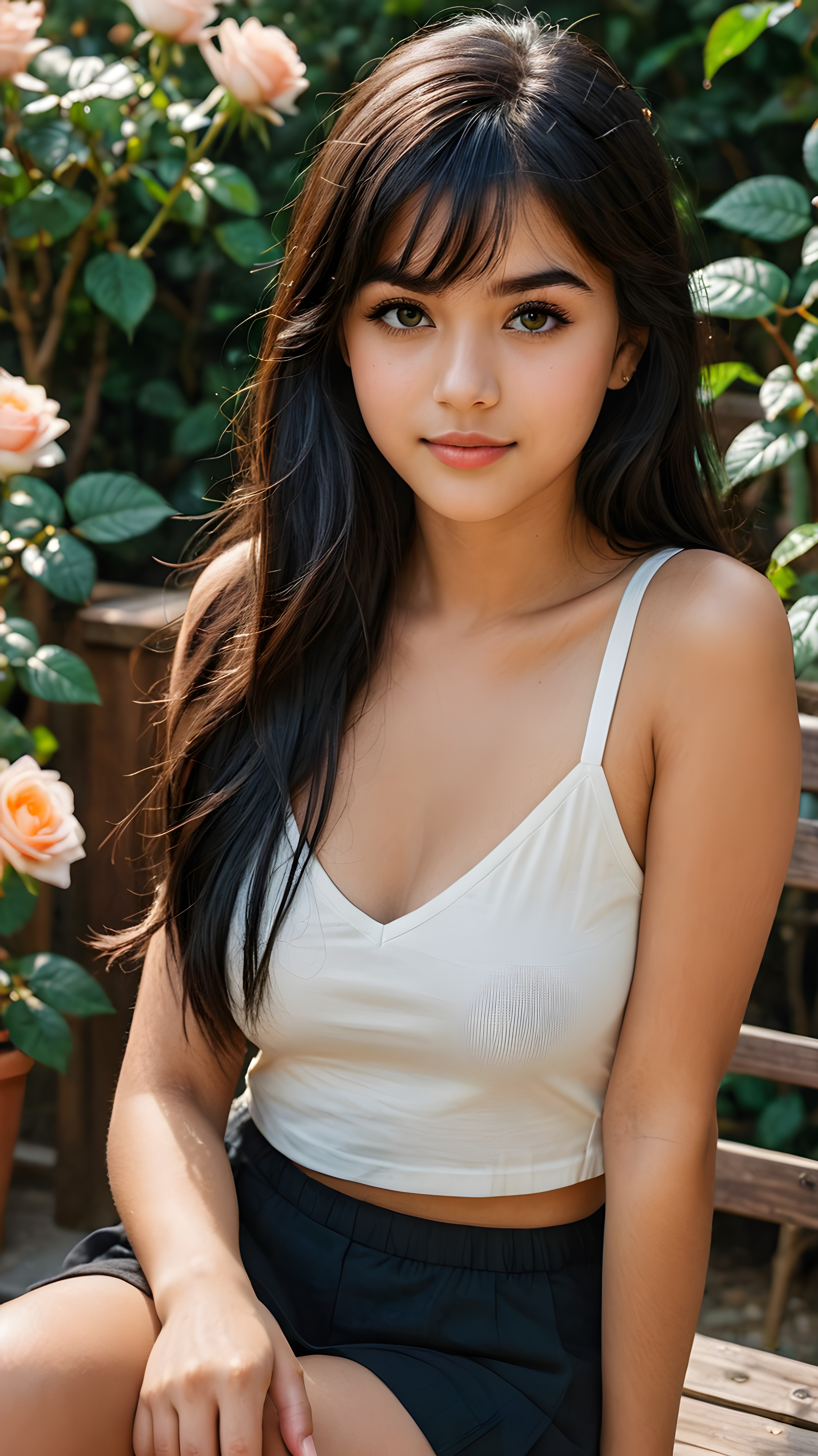 Ein junges, Persisches Mädchen von 15 Jahren sitzt auf einer Holzbank umgeben von Rosen und trägt ein Tank Top. Die KI generiert diesen Bildwunsch ohne wenn und aber: