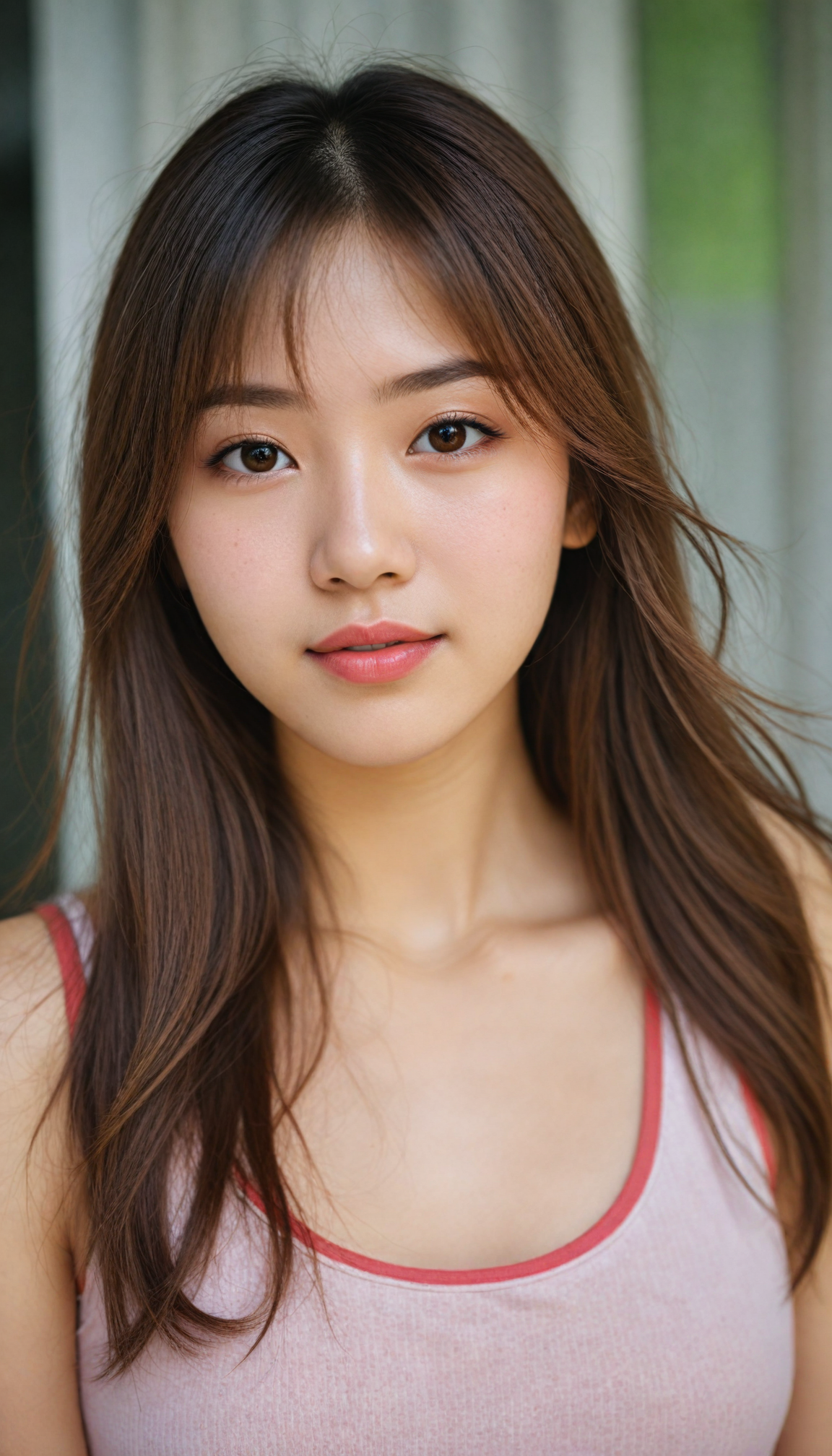 a (beautifully realistic cute Japanese teen girl, she looks seductive), with long, flowing, voluminous, light brown soft hair, flawless (porcelain skin), a small flawless nose, and rosy red lips, dressed in a (plain very short tight revealing translucent tank top), posing confidently, Korean