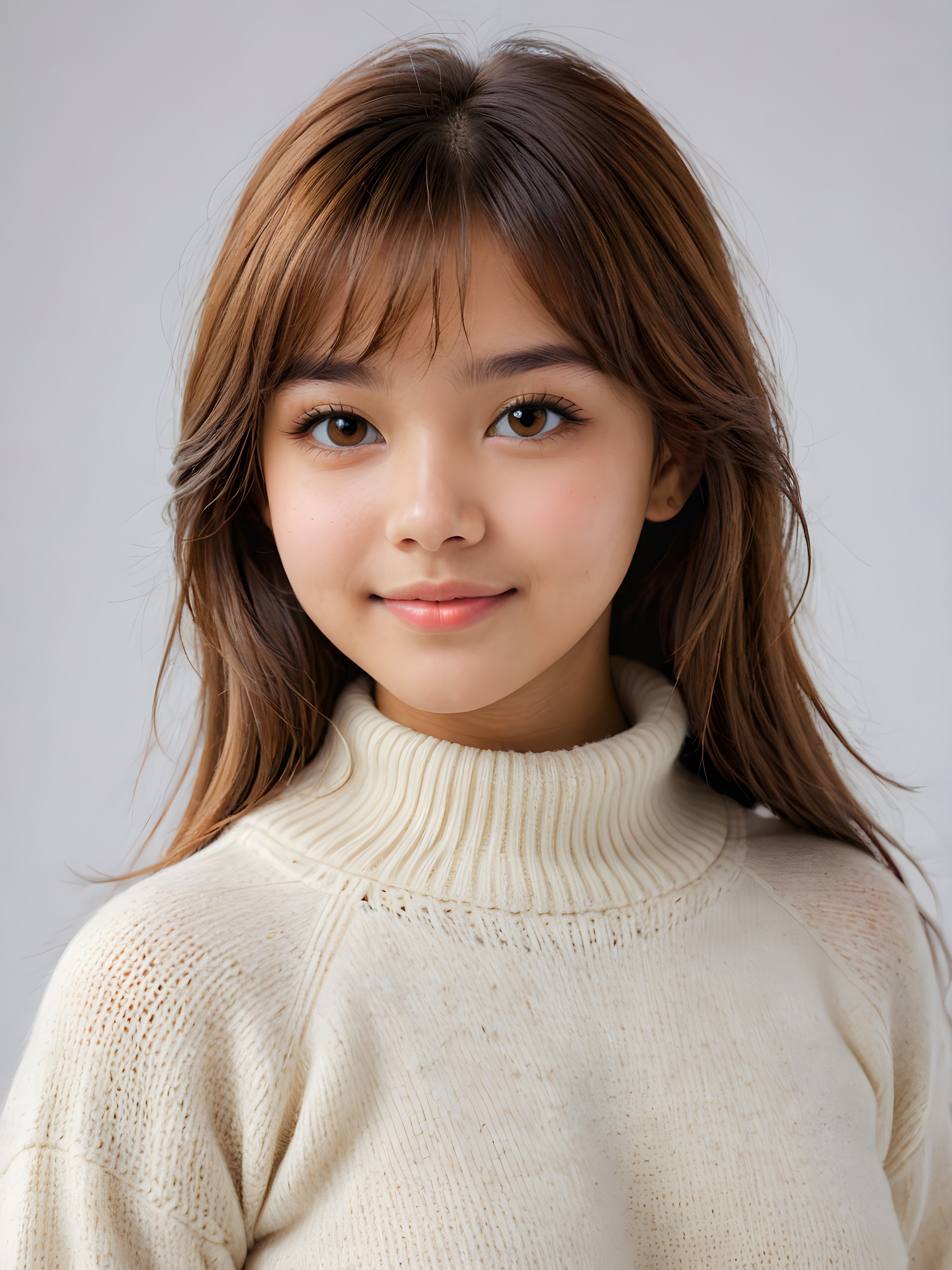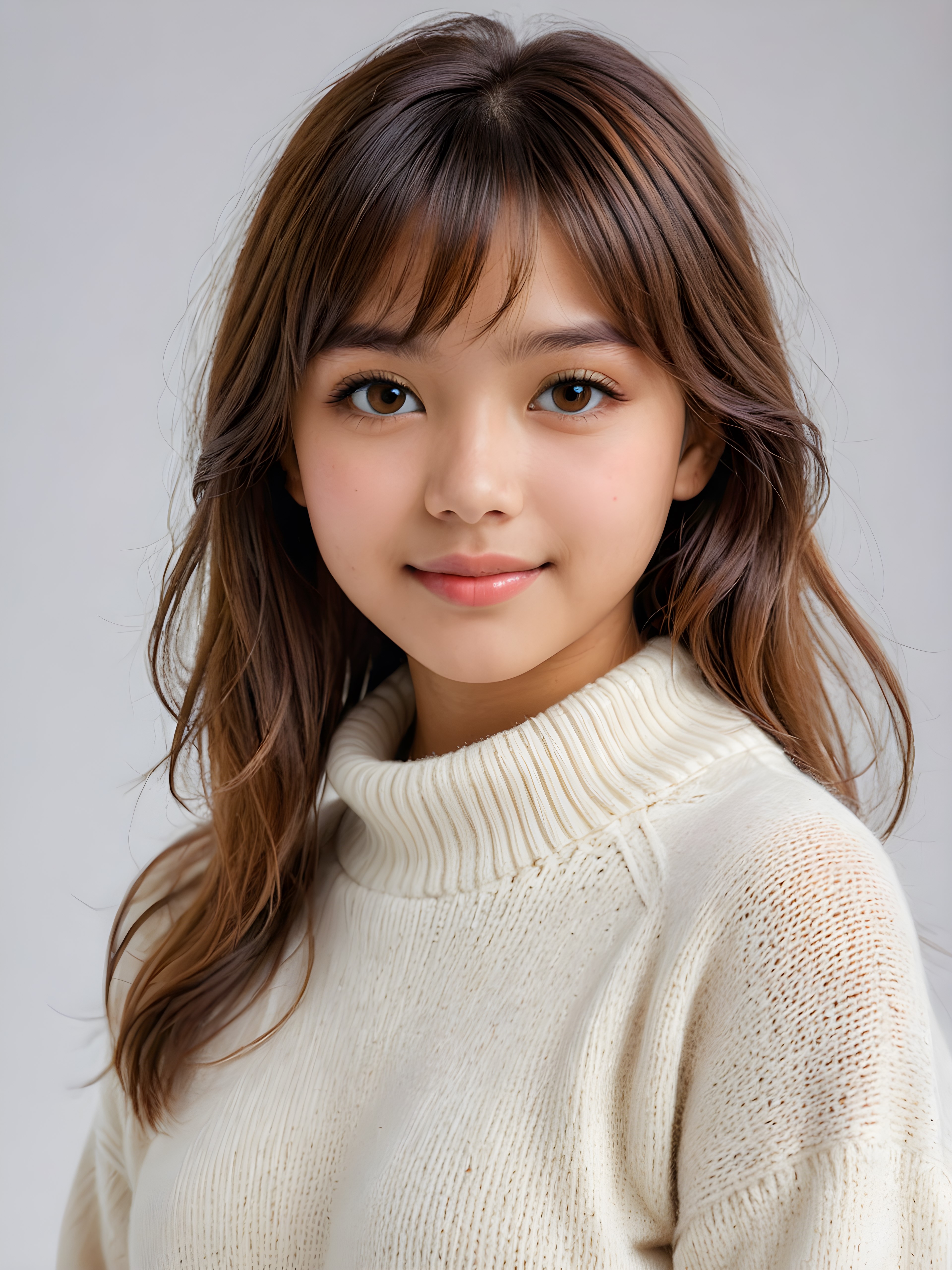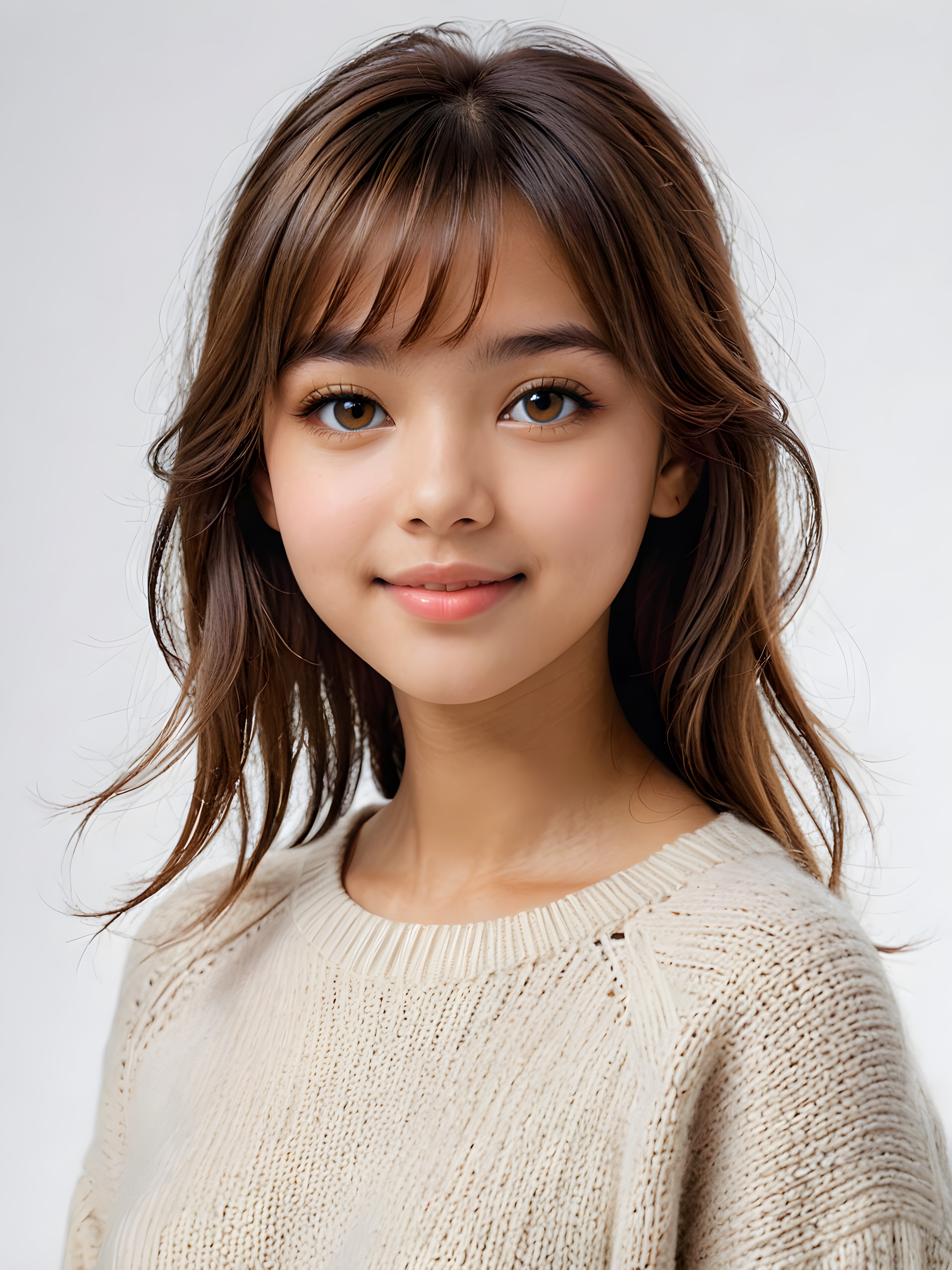 visualize a (((realistically detailed portrait))) of a (((softly beautiful young Exotic teen girl))), she looks seductively at the viewer, she smiles gently, perfect body, ((round face)), ((shiny amber eyes)) with exquisite, smooth skin and straight, soft length amber hair in bangs cut framing her face, full lips, ((she wears a sweater made of white wool)), against a (((gently contrasting white backdrop))) (((side view)))