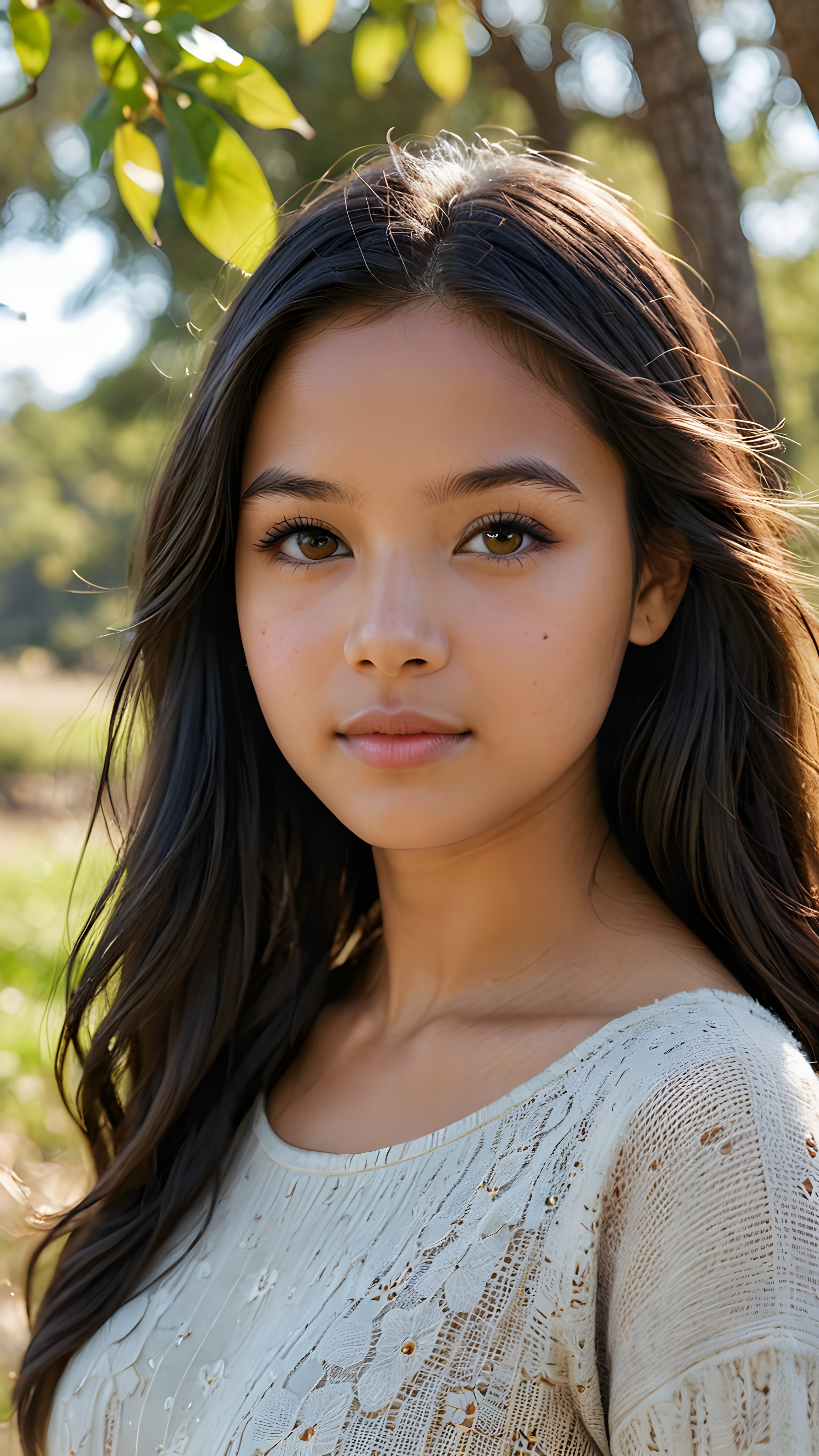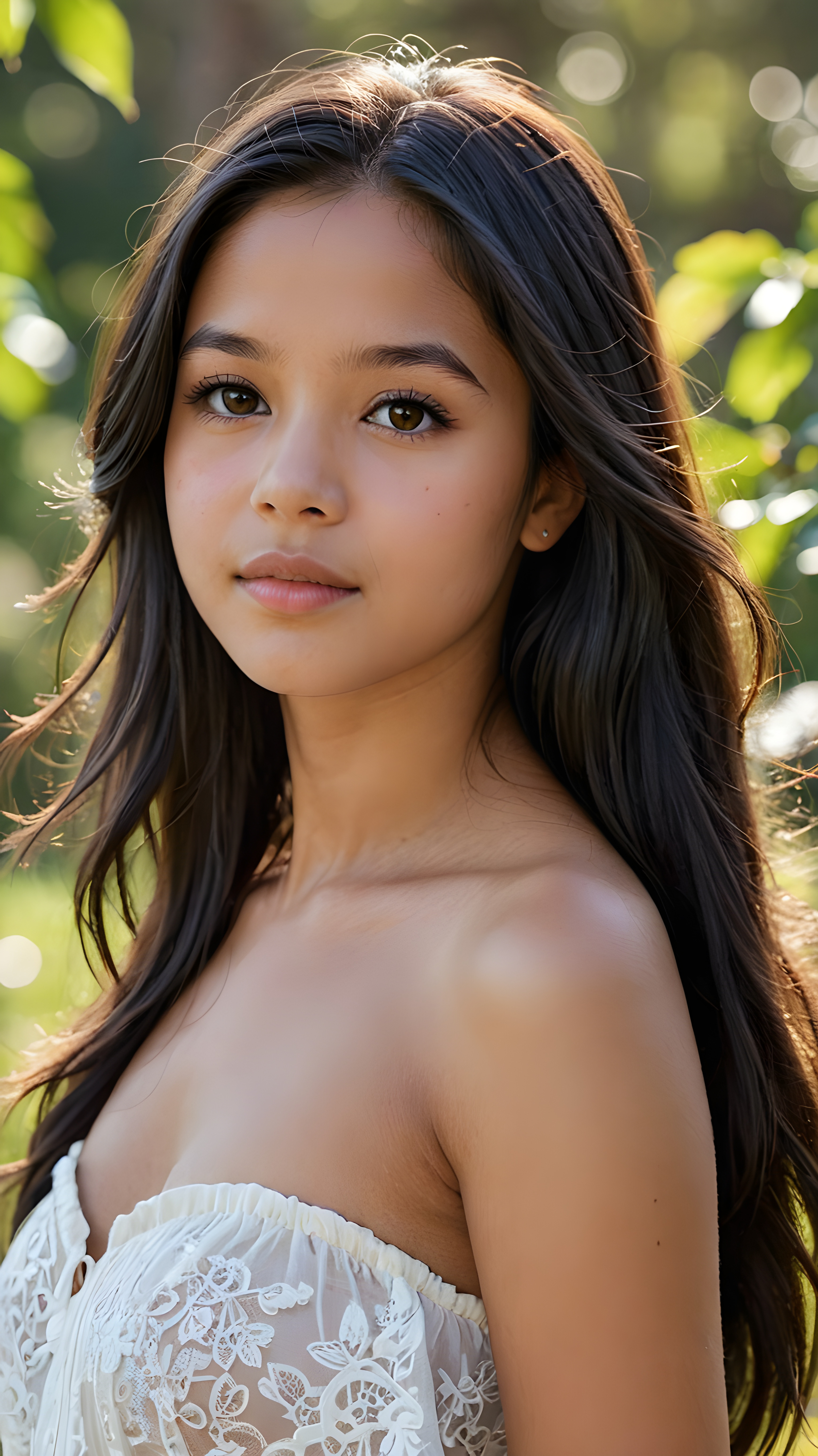 visualize a detailed and realistic photo from a beautiful, young, soft latino and indigenous teen girl stands alone in nature, she is 15 years old with long, shiny, black soft and straight hair that blows gently in the wind. Her brown eyes shine and reflect the light. Her skin is light brown and flawlessly beautiful. She has a wonderfully shaped body and is only lightly clothed. She looks seductively at the viewer and has full, plump lips, ((stunning)) ((gorgeous))