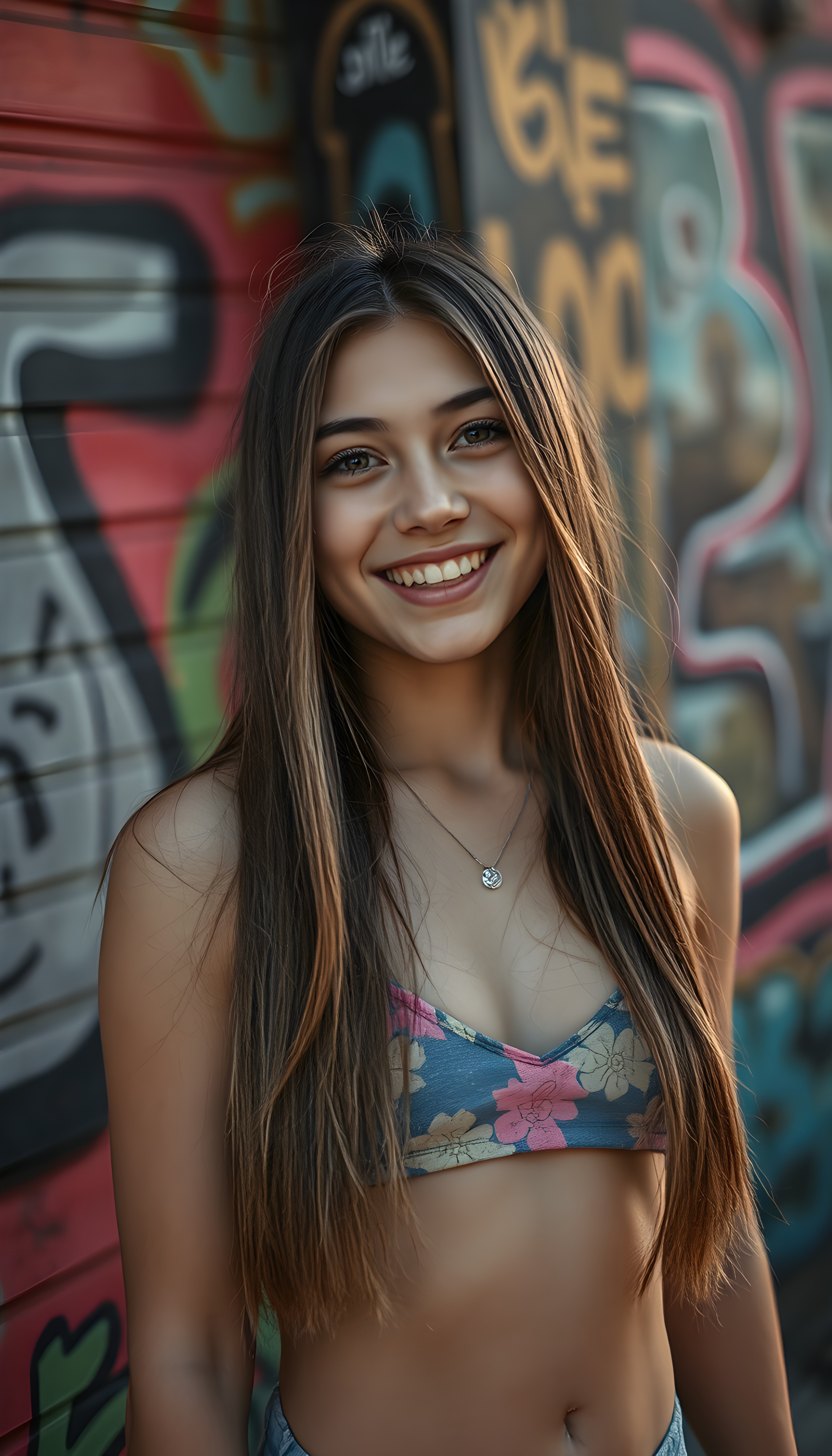 A joyful young busty teen girl with long, straight fine hair falls down to her body, sparkling eyes stands in front of a vibrant, graffiti-covered wall. She wears a colorful cropped tank top, deep v-neck, revealing a playful and energetic demeanor. The lighting is warm and inviting, casting a soft glow on her features.