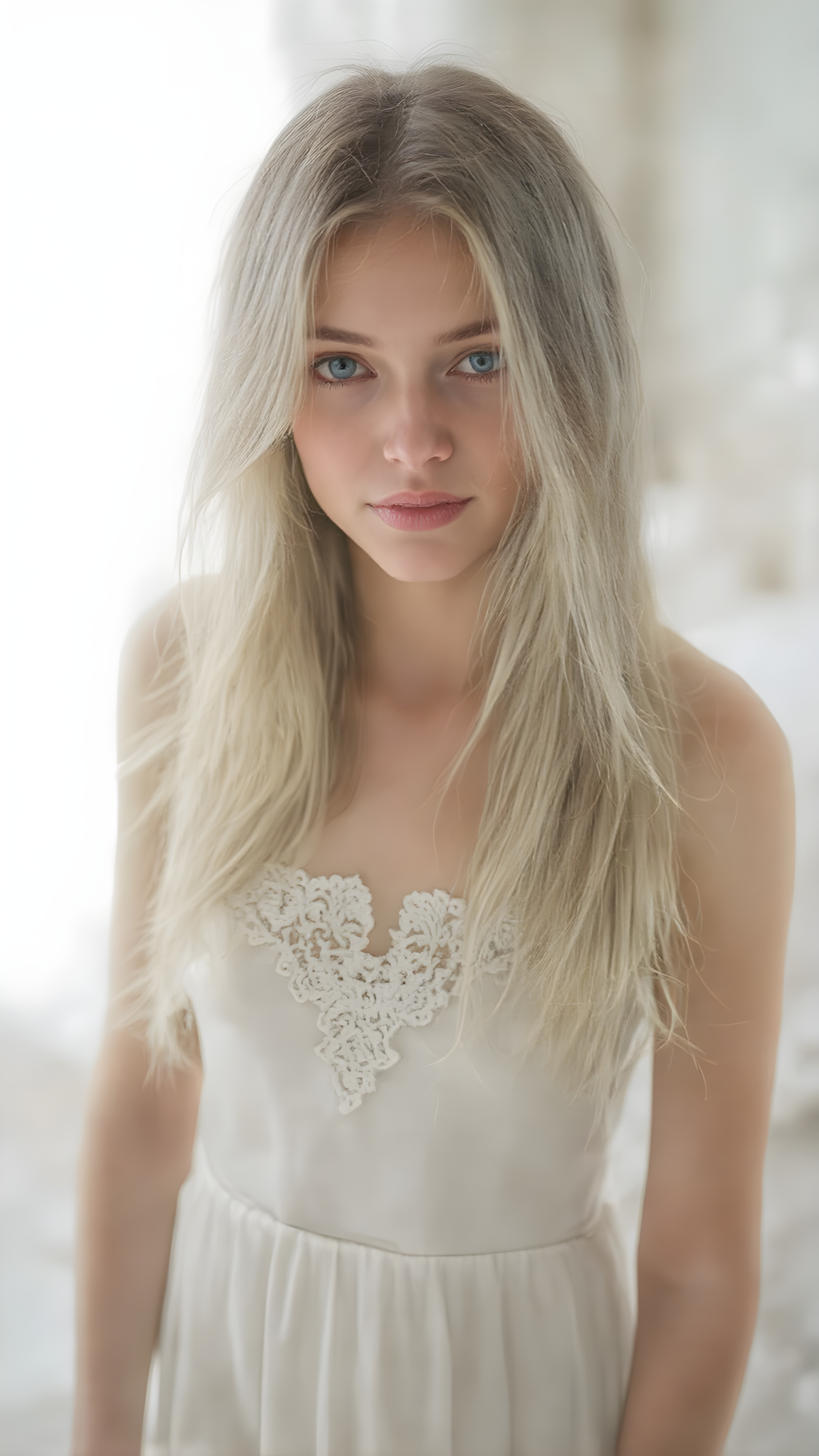 a (((stunning girl))) with (((soft long white hair))), (((extremely beautiful and alluring eyes))), dressed in a flowing (((long white silk dress))), (((adorned with delicate lace and flowers))), exuding tranquility and elegance, under a (misty backdrop of a luxurious white themed bedroom) where a soft glow emanates from her form