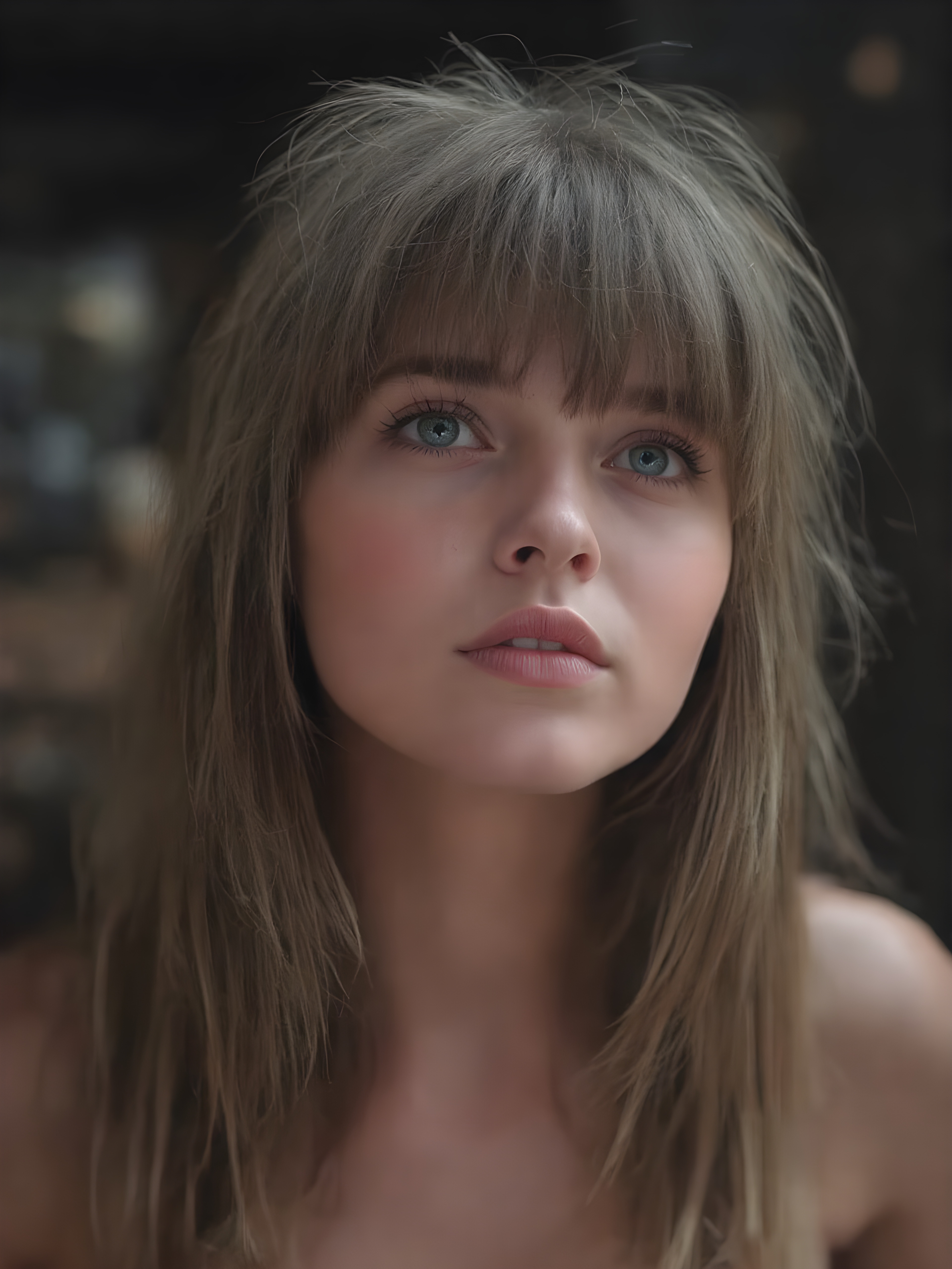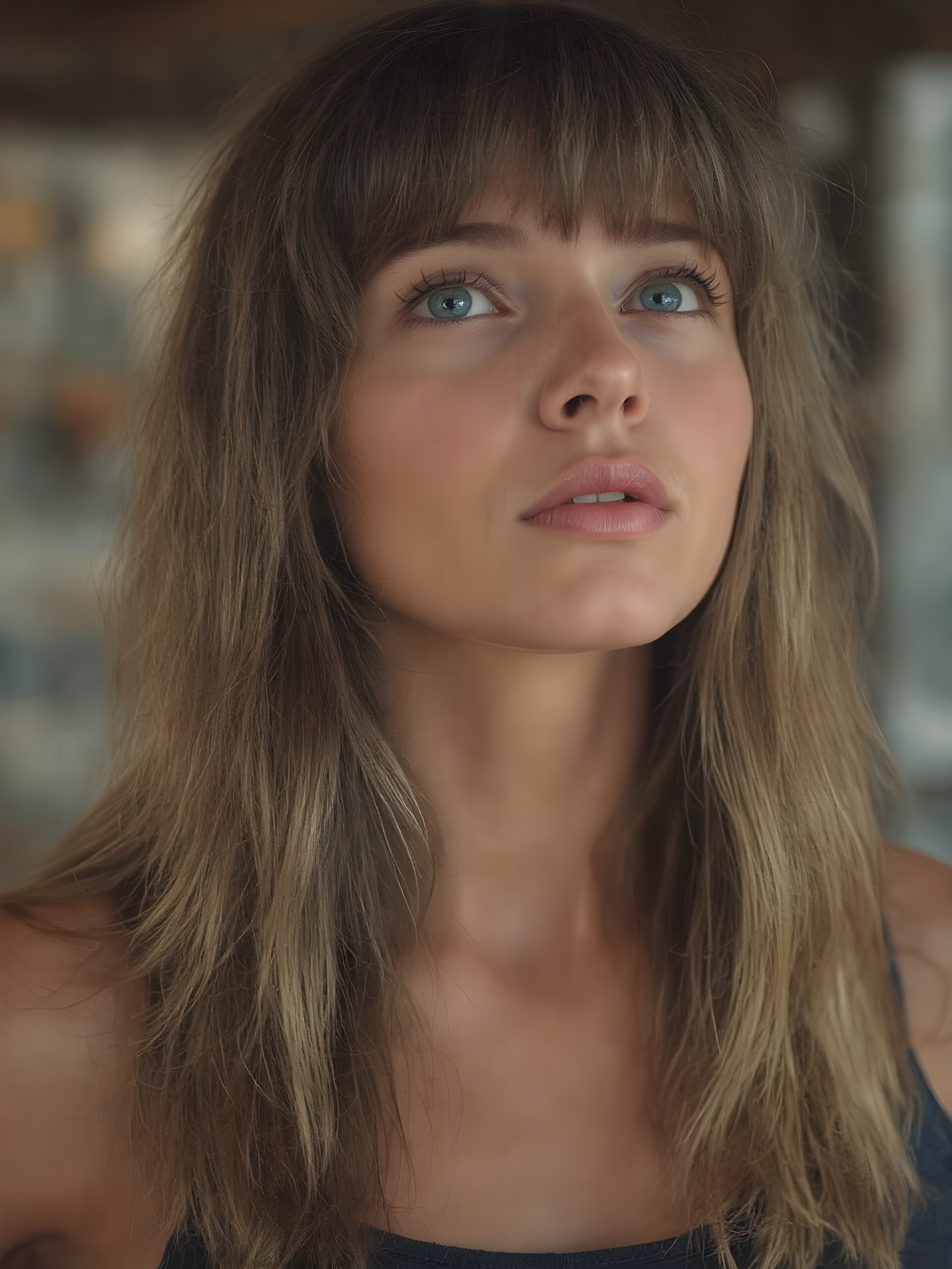 a girl with a beautiful pout, plump lips, long soft brown and blond hair in perfect bangs cut frame her round face, realistic and detailed, she wears a lifted cropped tank top, stunning female body, she waits seductively for a kiss, looks up and she says: kiss me