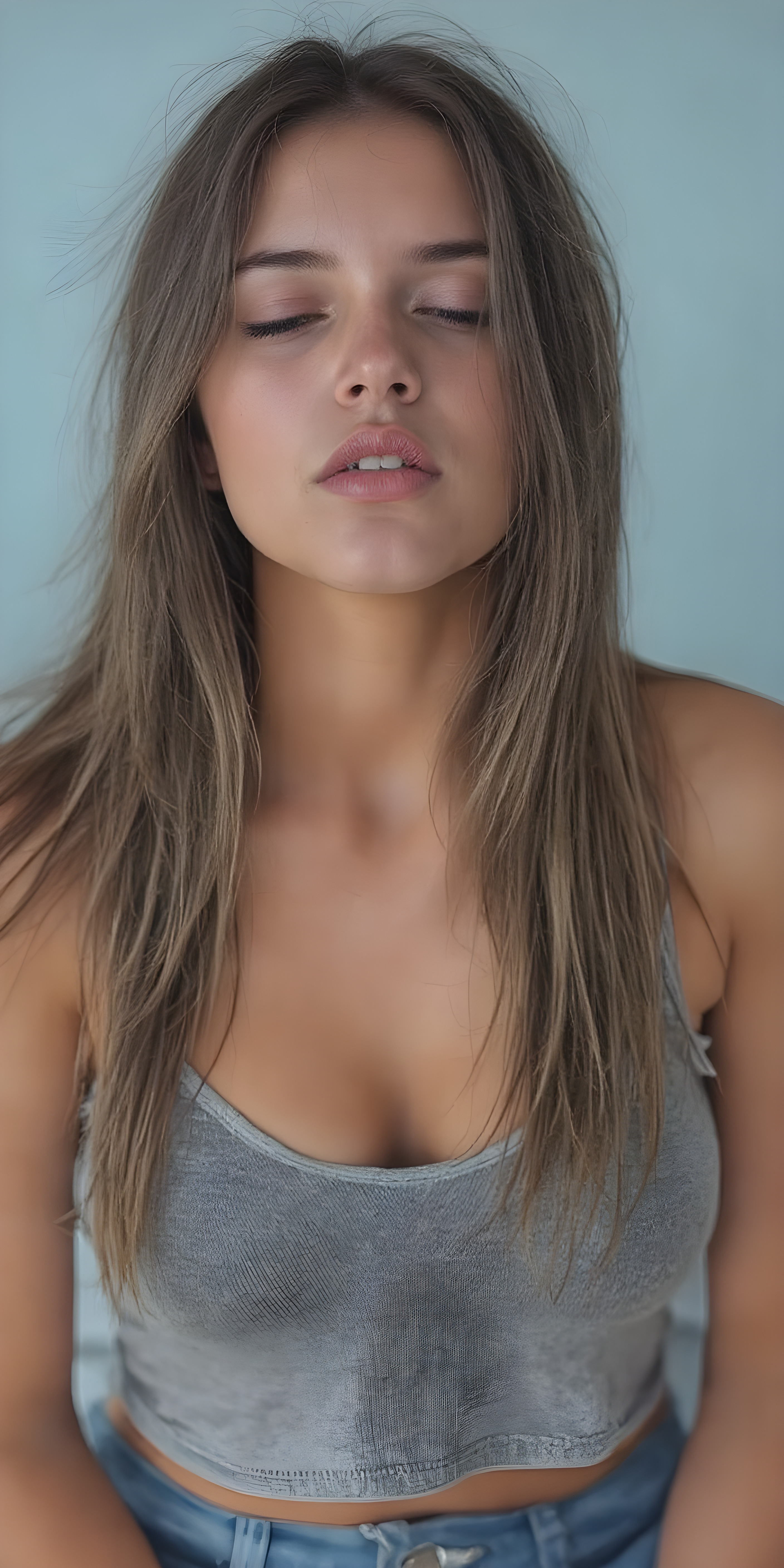 a (((hyper-realistic full angle body shot))), with intricate details and highly detailed textures, capturing a (((very beautiful young busty girl))) with ((silver skin)) and ((extremely long, sleek messy dark straight hair)), wearing a ((grey cropped tattered tank top, deep v-neck)) that stands out against a (light blue backdrop), her face poised in a ((natural pose, sitting in her bedroom)) with ((her lips open wide, closed eyes)) as if she is ((exuding confidence)) at a (professional studio photo shoot)