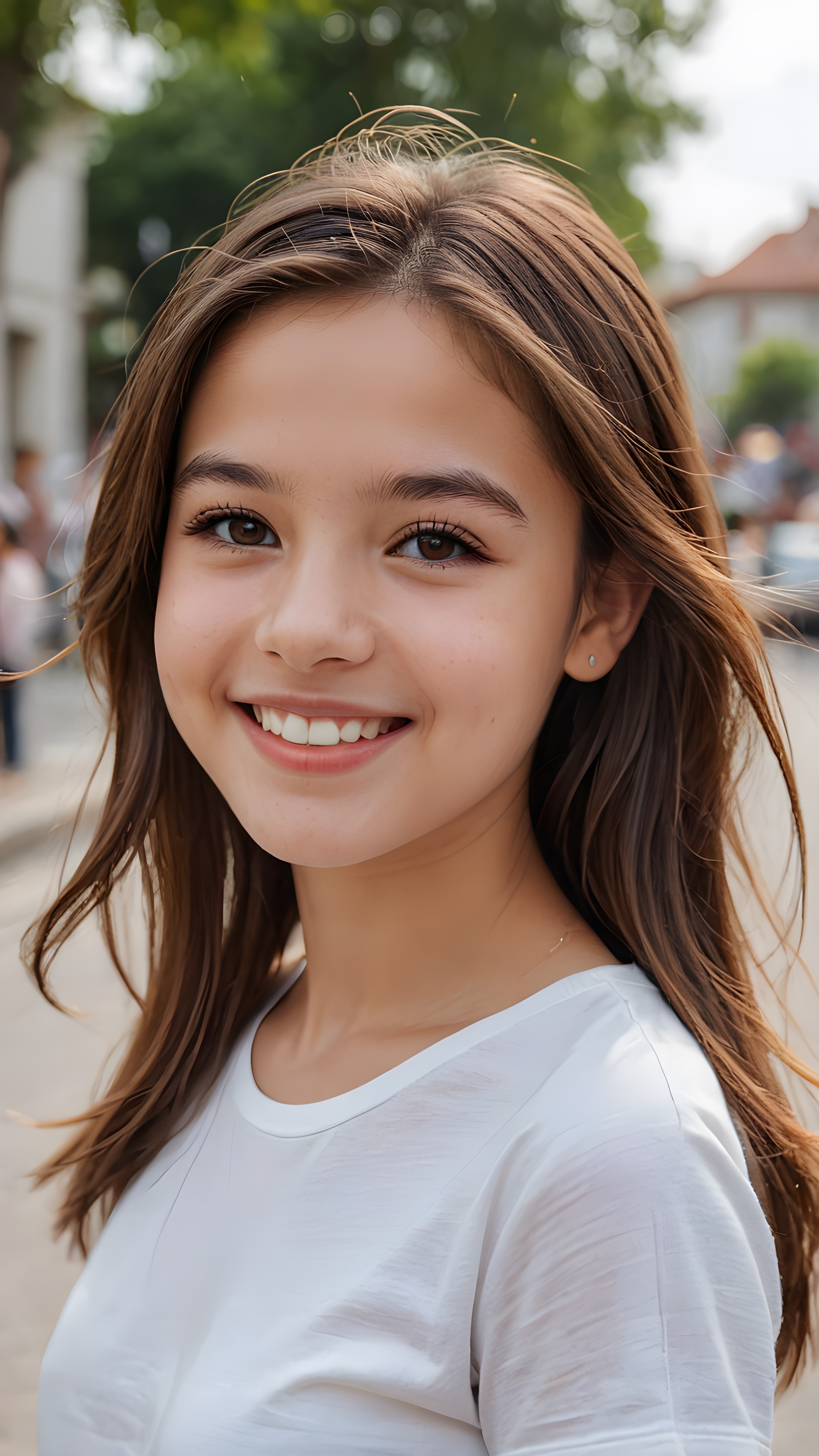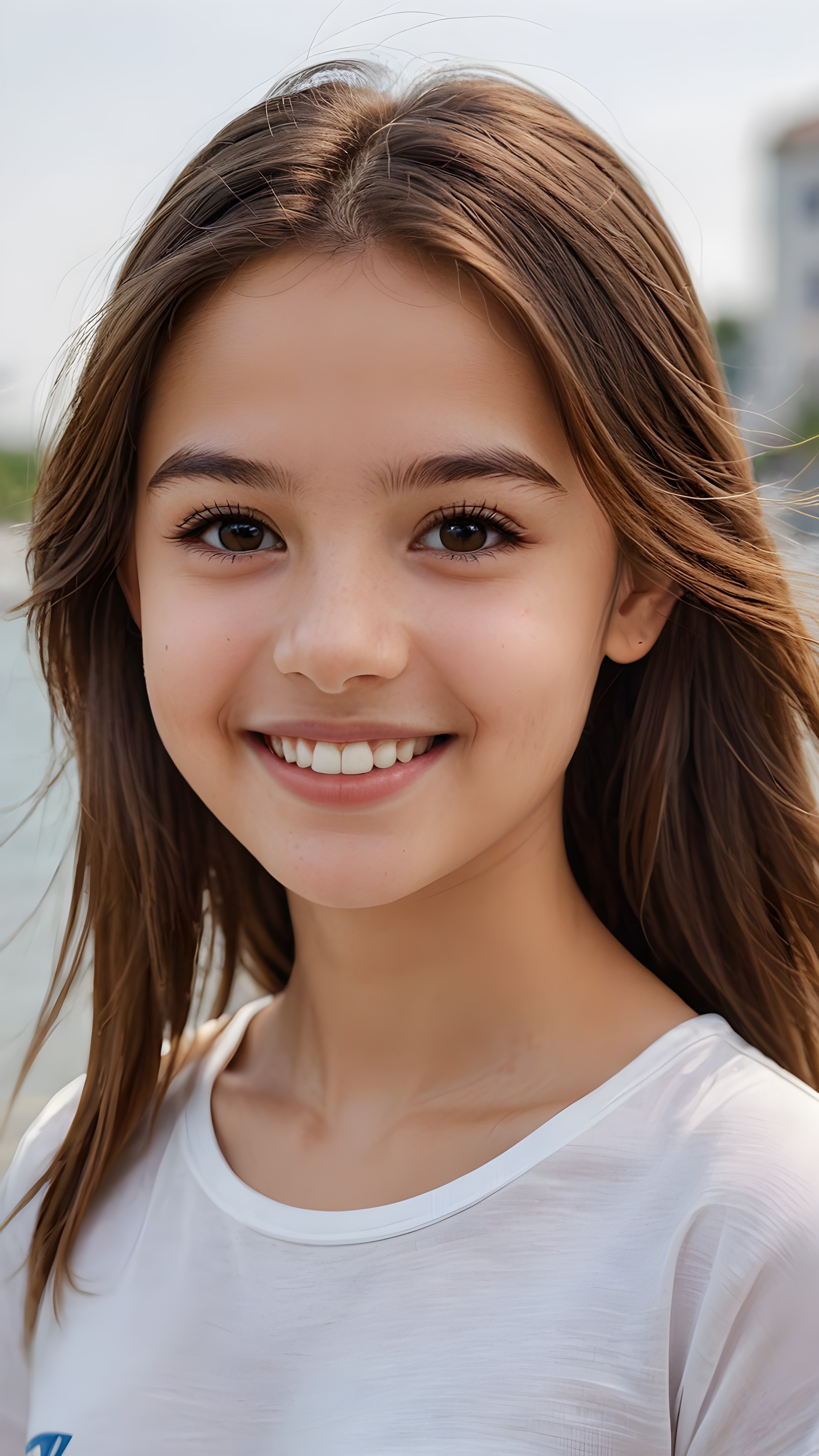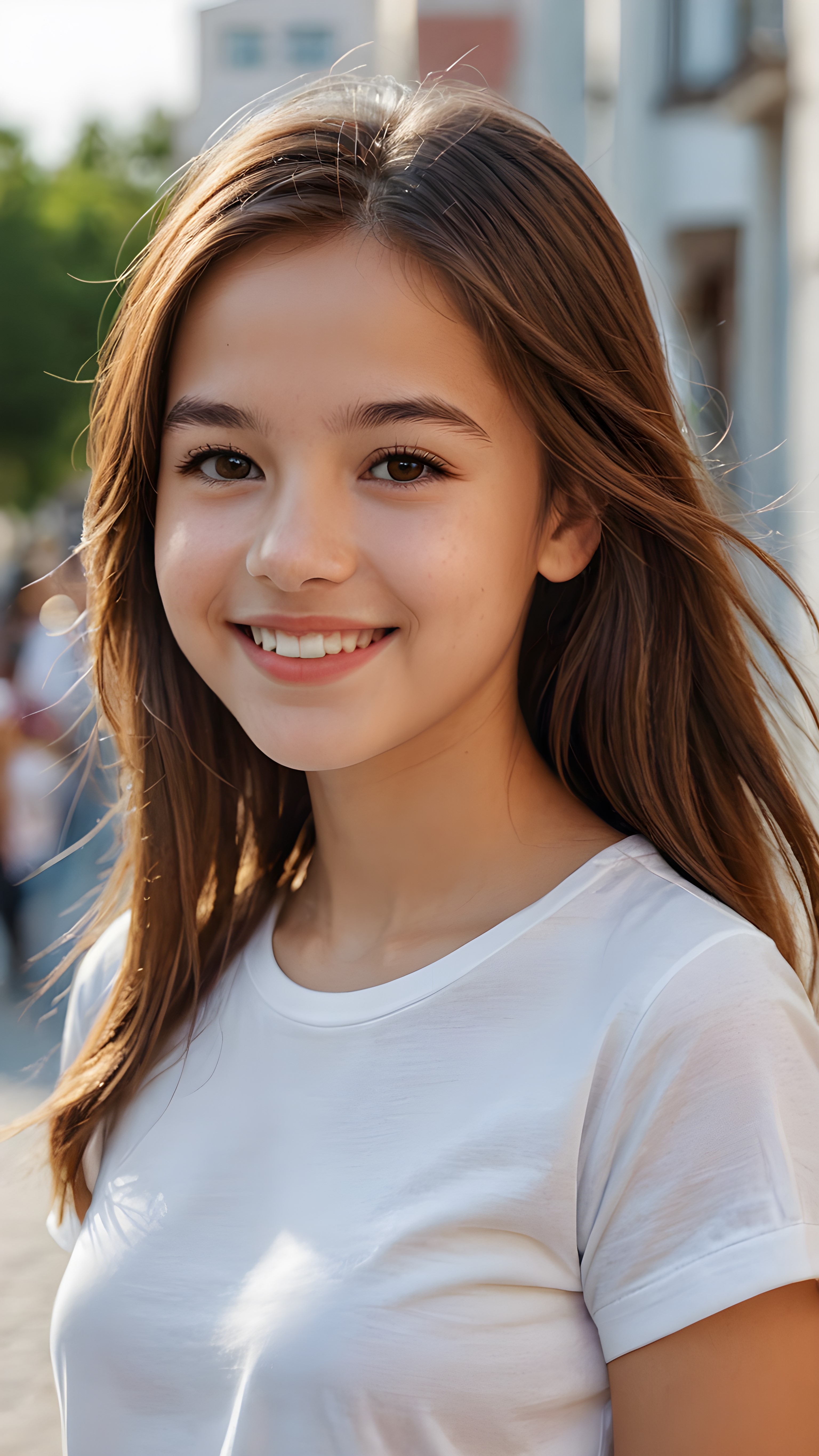 perfect realistic portrait, very cute young teen girl, 13 years old, white t-shirt, smile, detailed brown straight hair, brown eyes, full kissable lips, white teeth, perfect body, side view