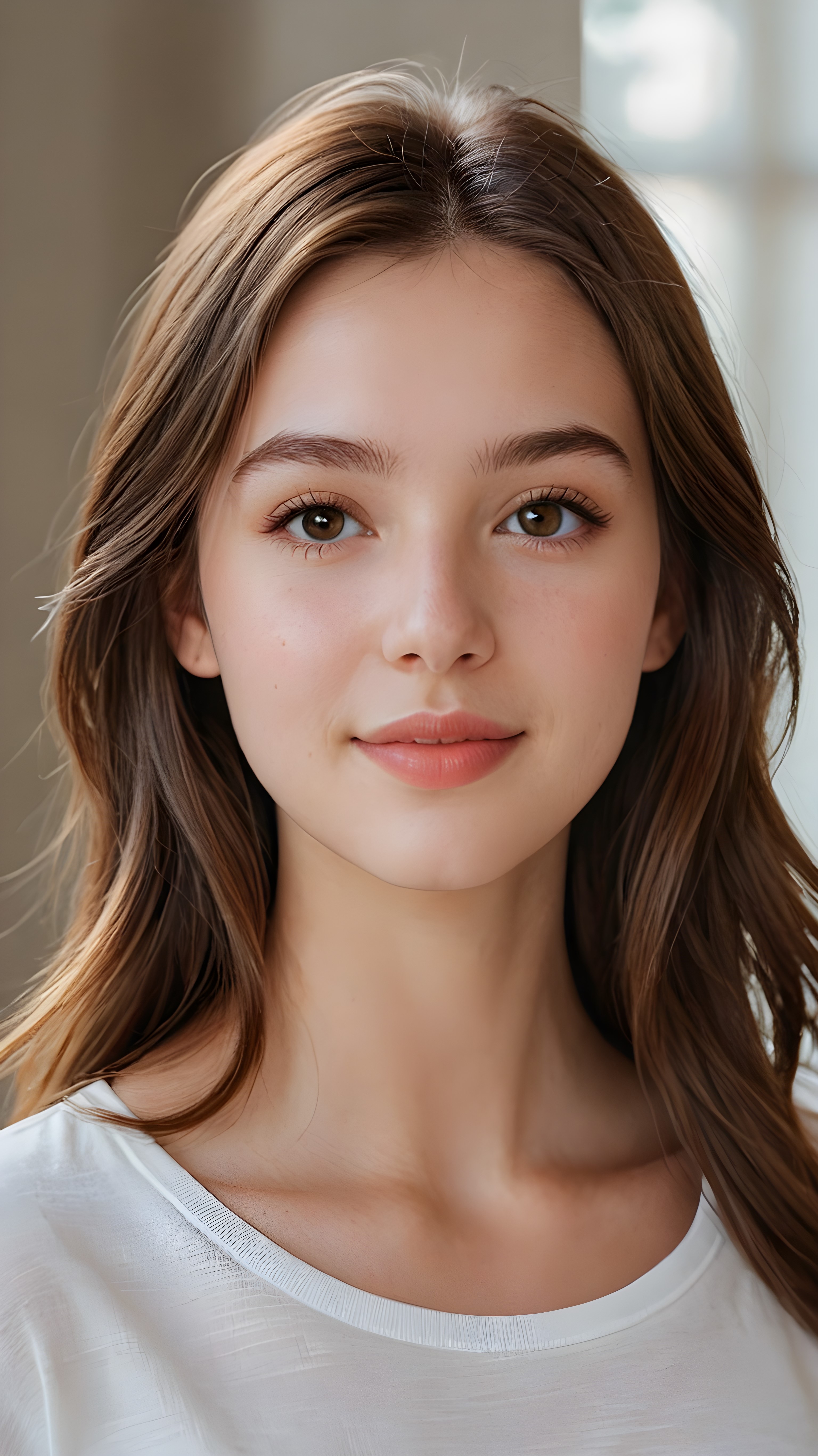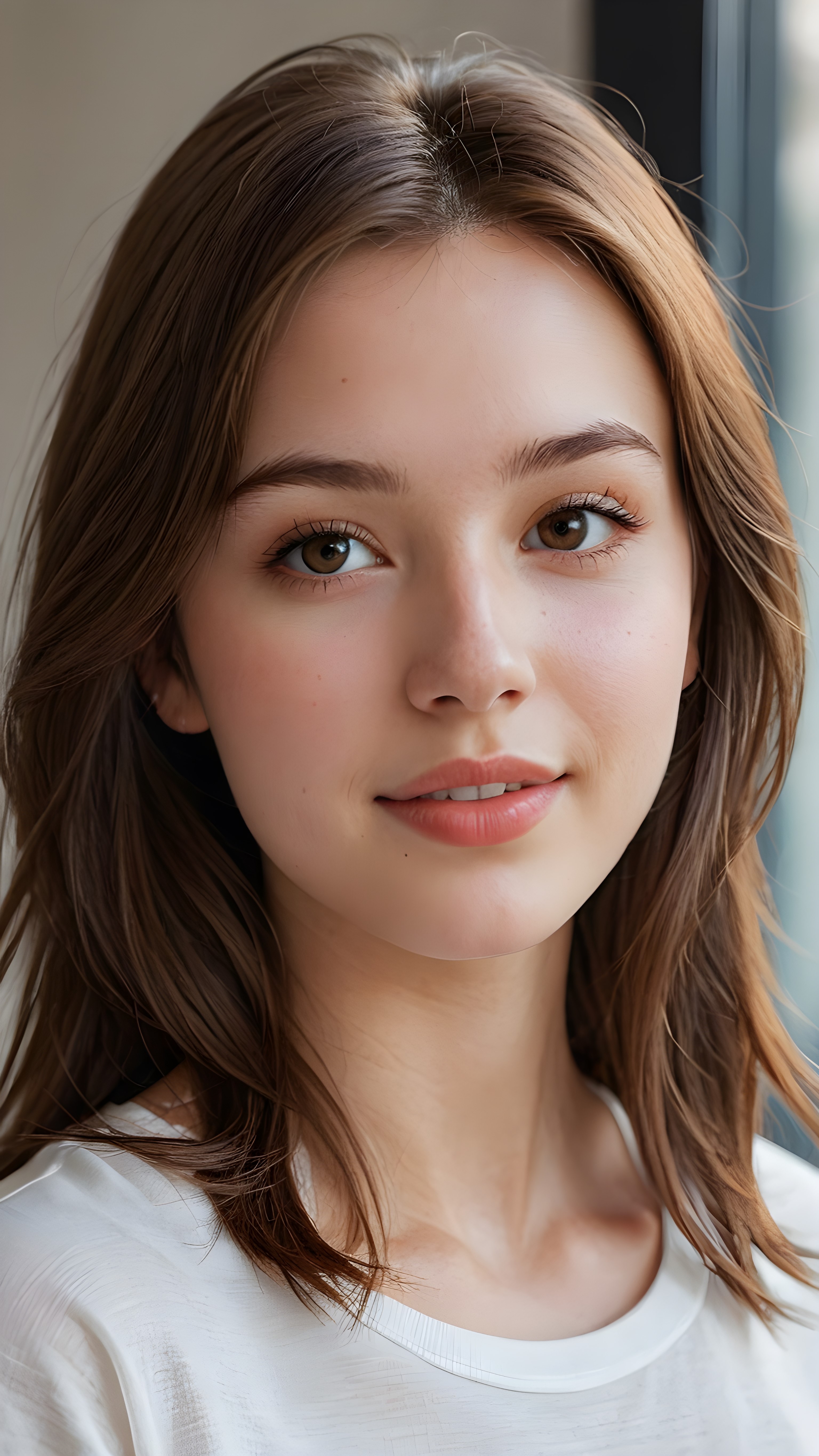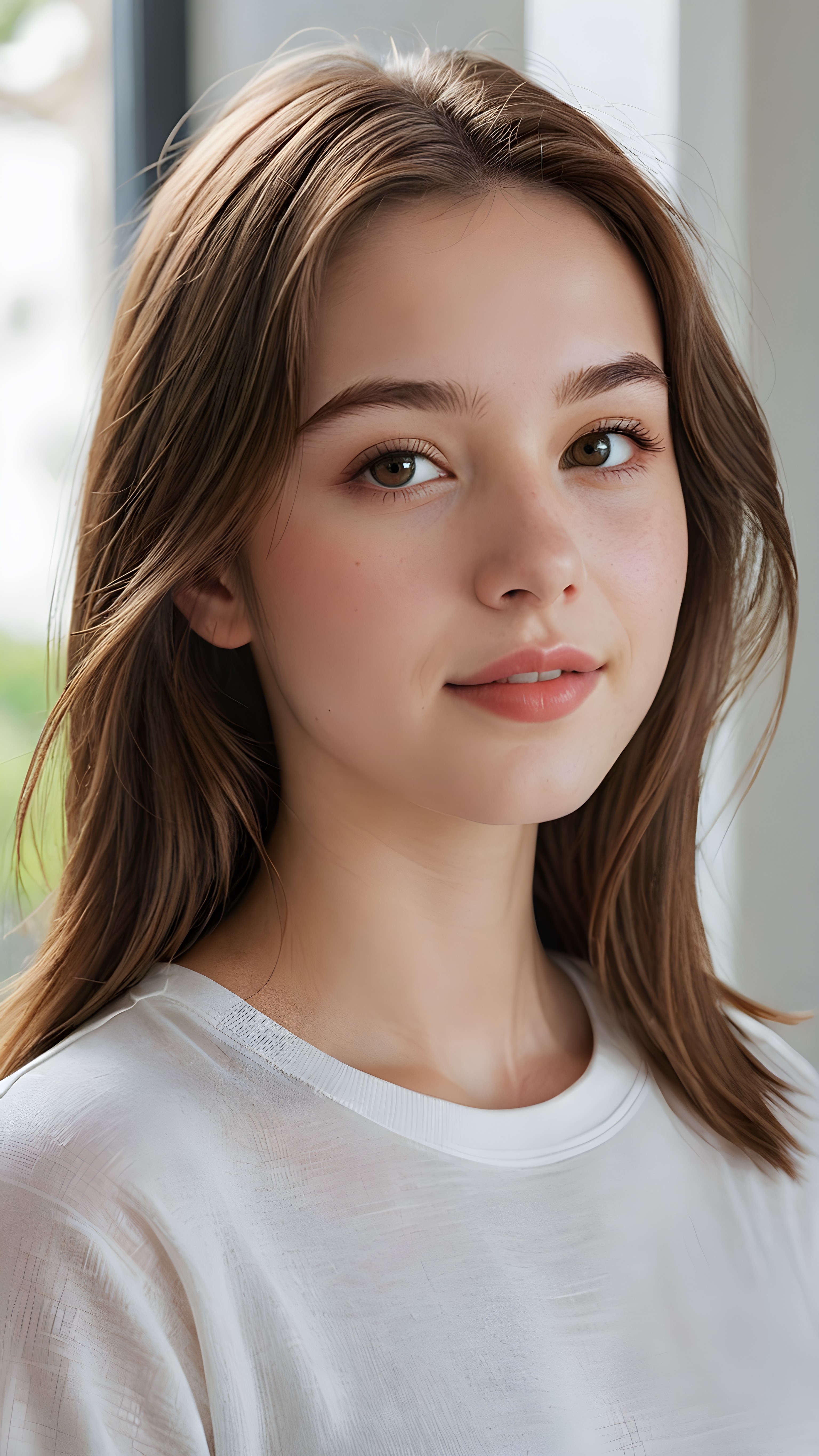 perfect realistic portrait, very cute young teen girl, 13 years old, white t-shirt, smile, detailed brown straight hair, brown eyes, full kissable lips, white teeth, perfect body, side view