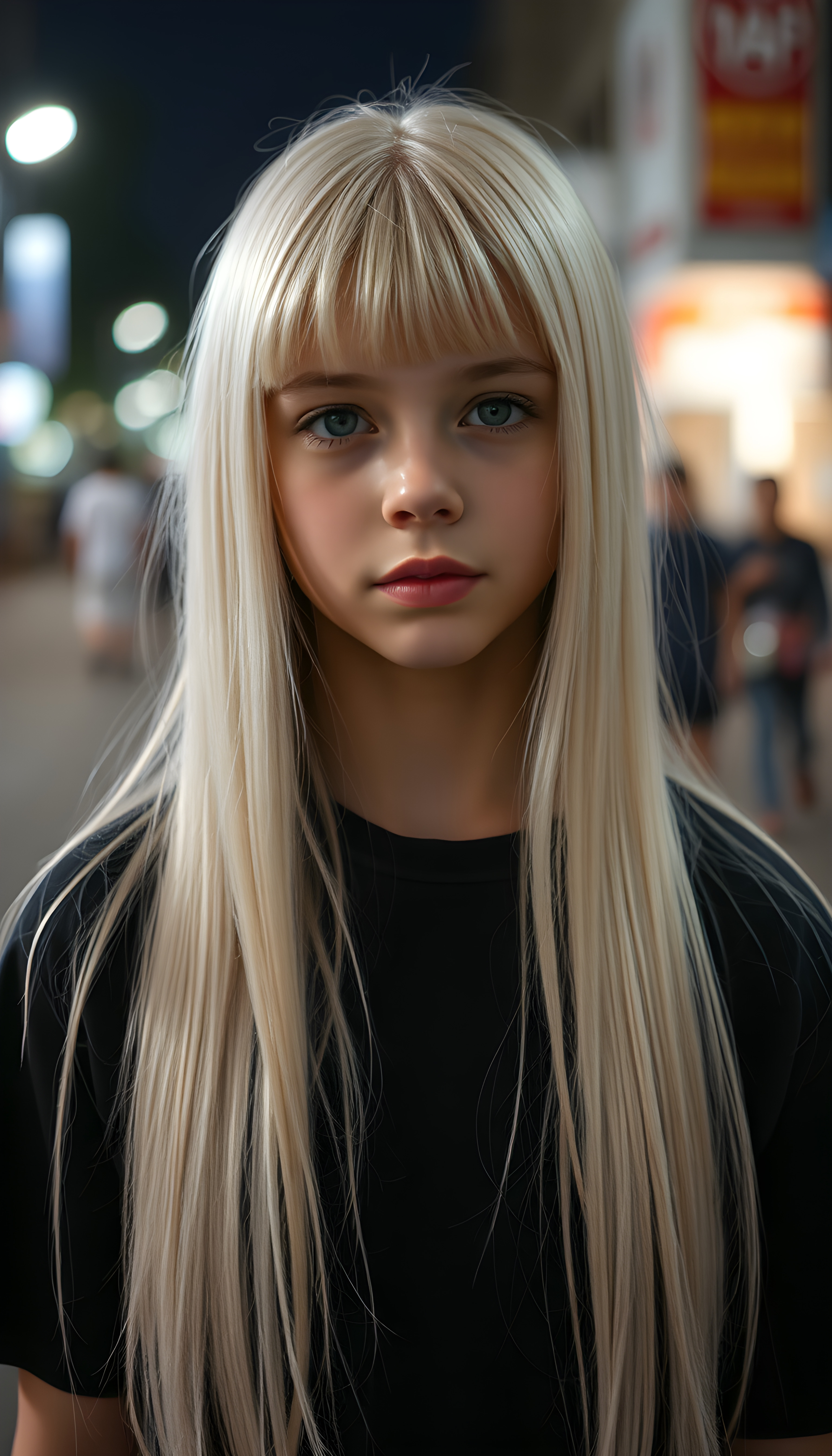 a young innocent Emo girl, very long straight platinum white soft hair falls over her body, bangs cut frame her face, same length, plain black dressed, night, alone in the street