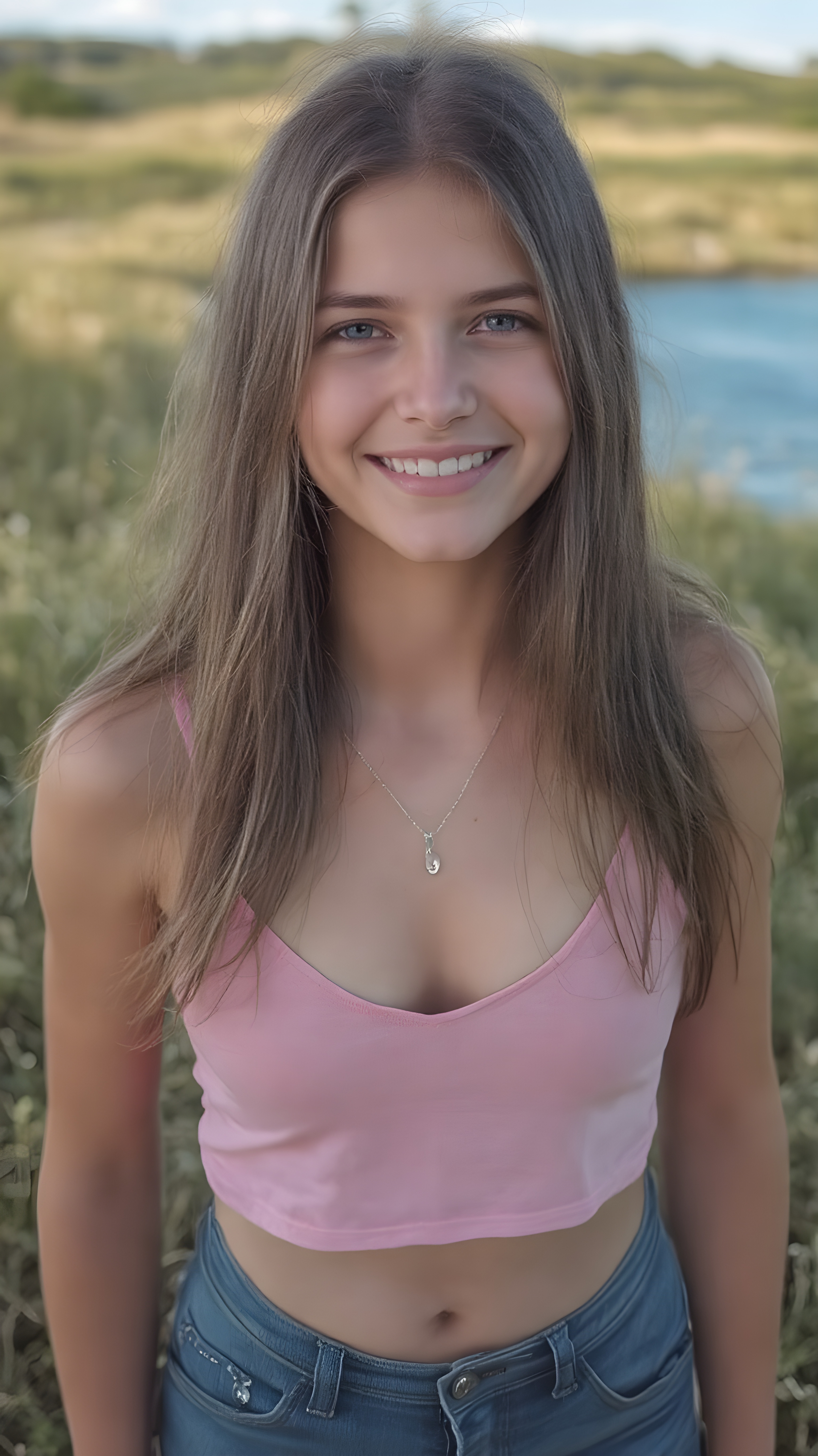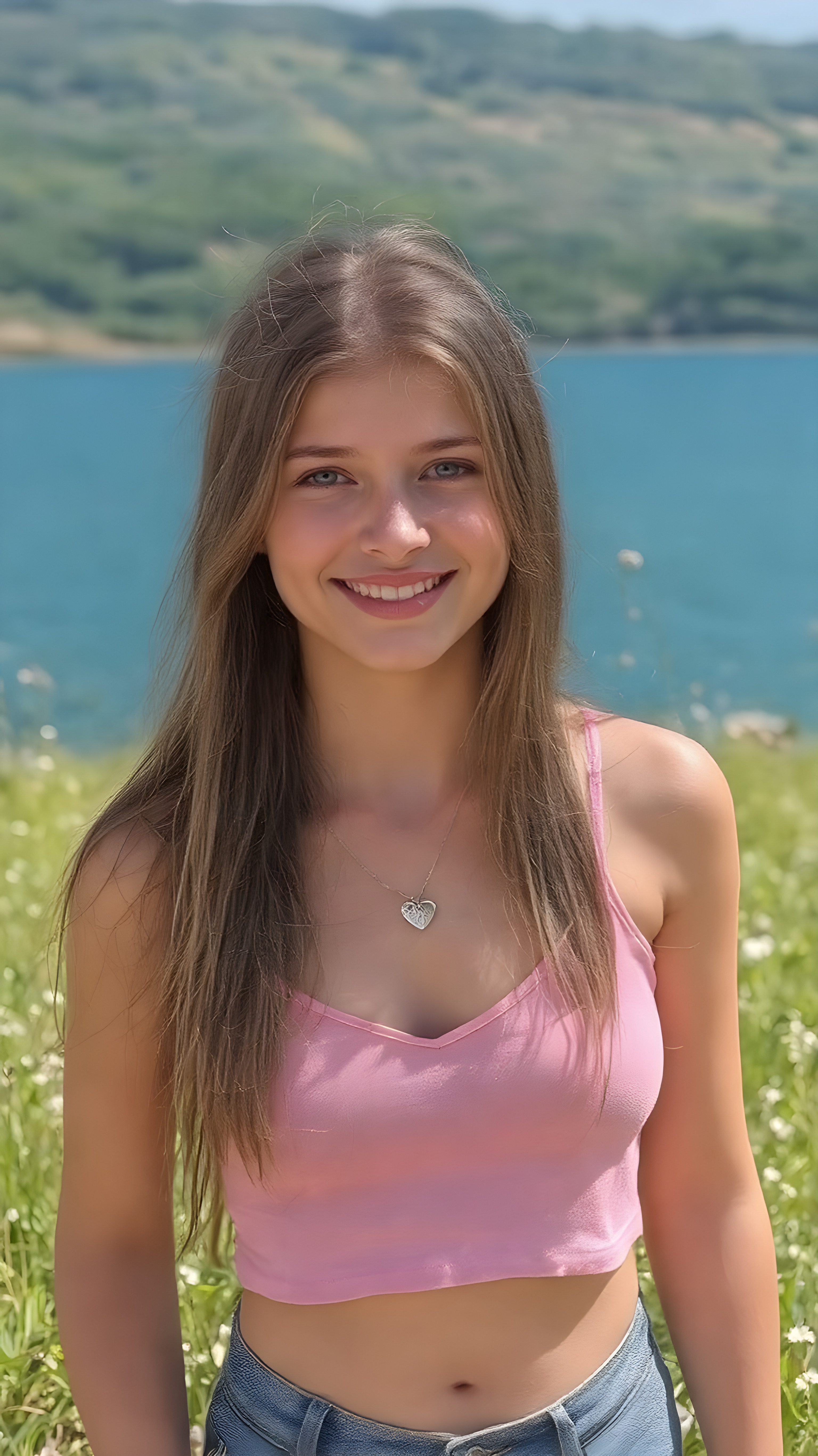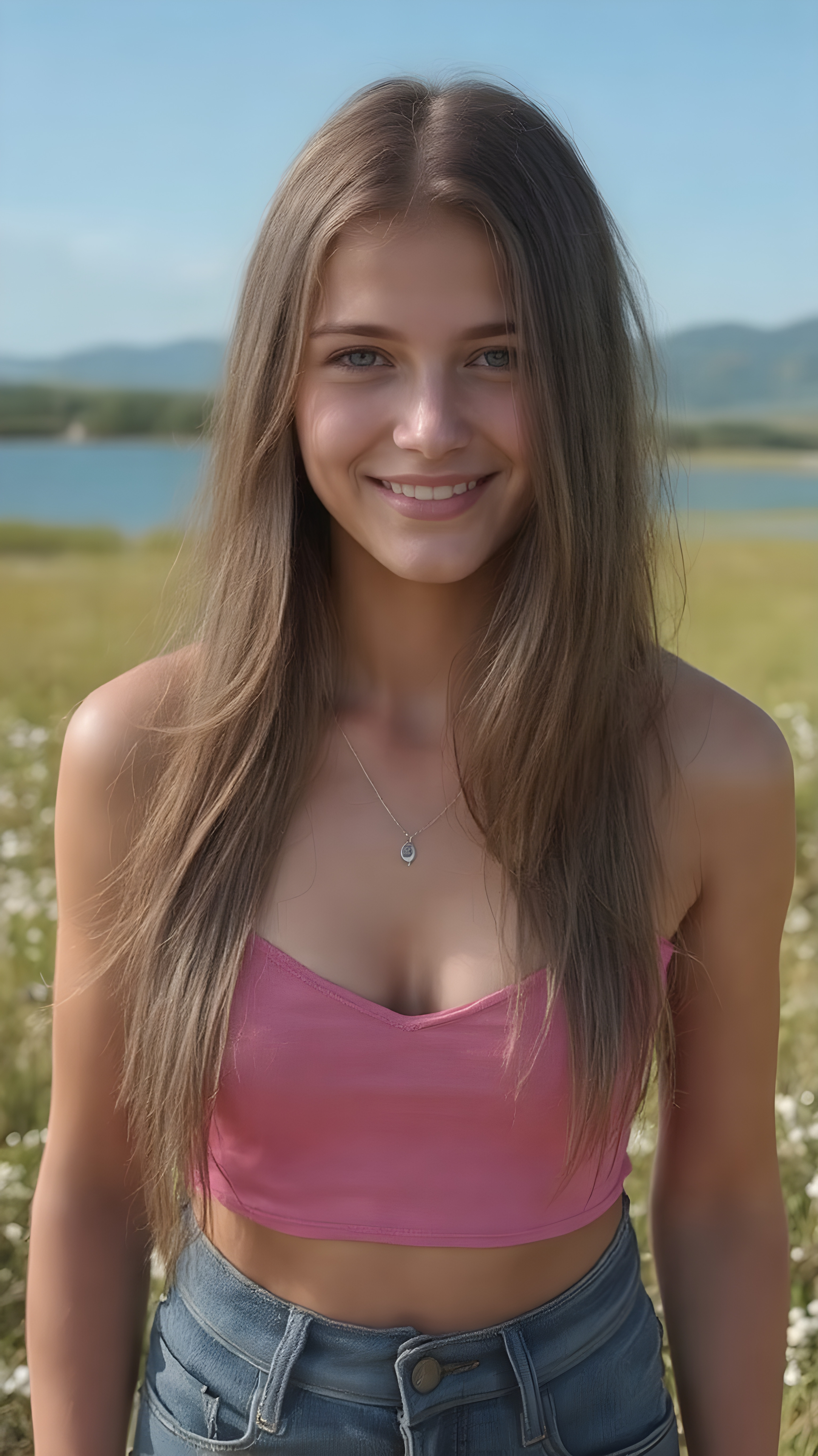 a fantastic young teen girl, she is my daughter, with long straight brown hair, standing in a sunny meadow. In the background is a deep blue lake, she is smiling, ((detailed and super realistic)), she wears a short cropped plain spaghetti pink tank top and deep v-neck, and short denim jeans pant, belly button, she is very happy, perfect body, silver necklace with a big heart
