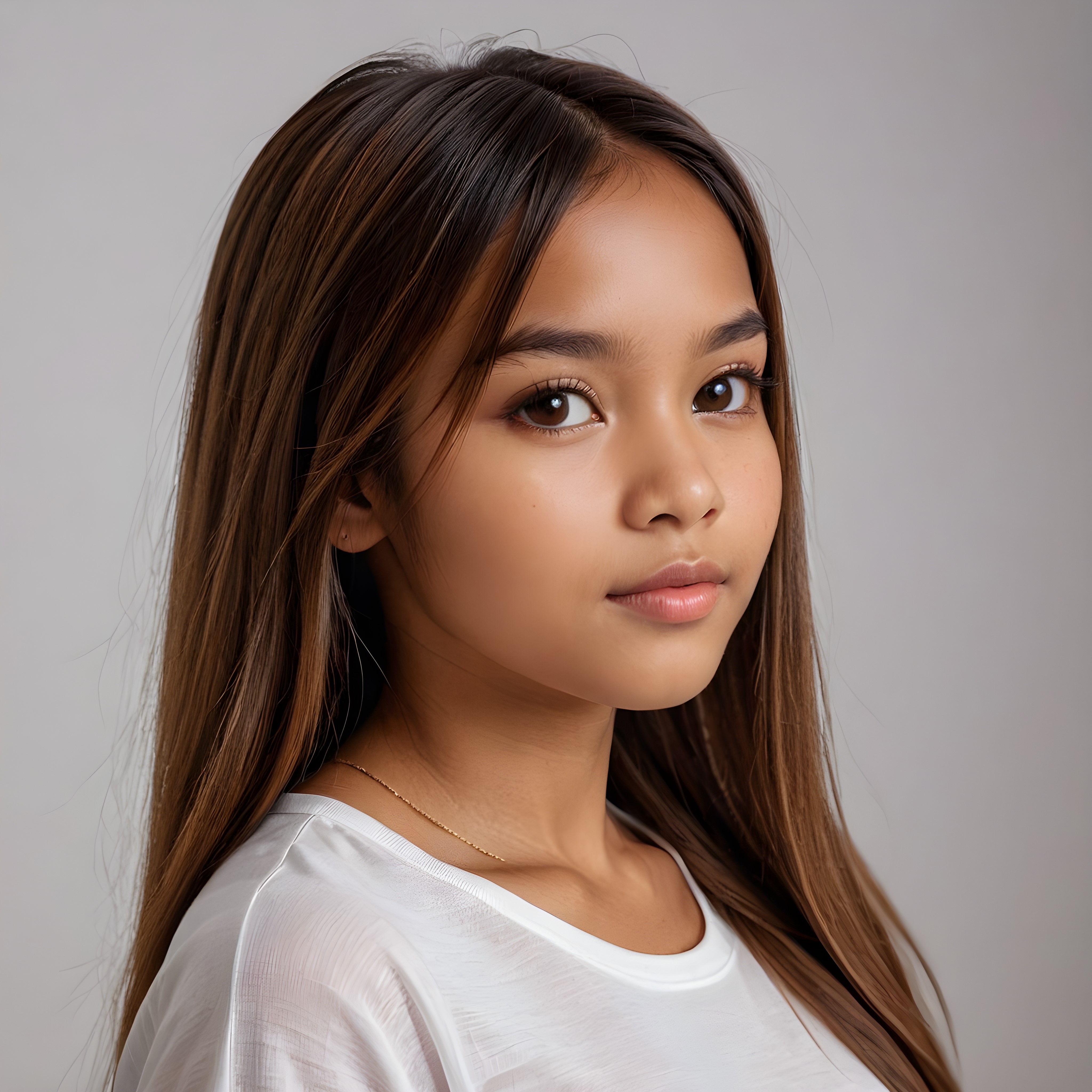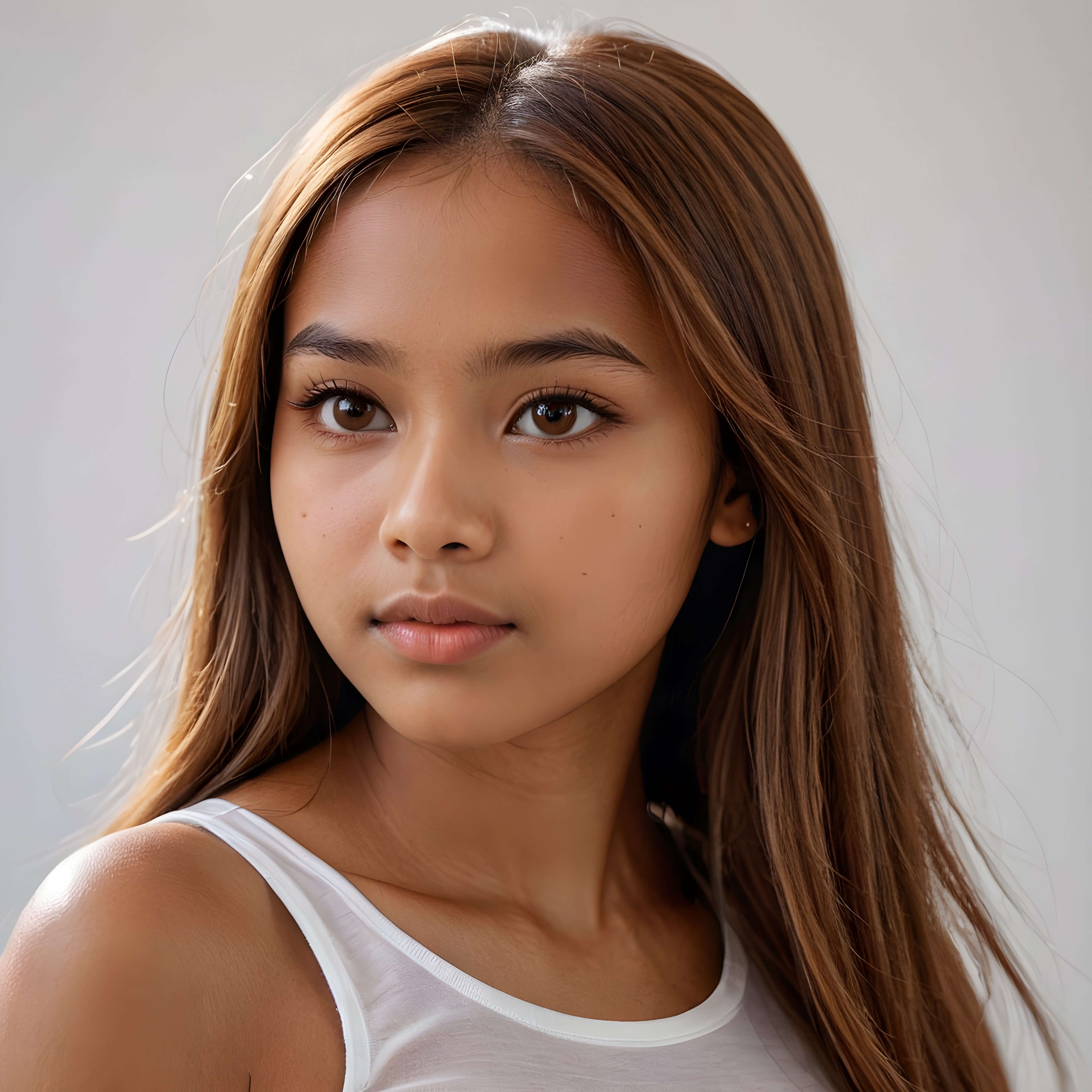 ((super realistic and detailed portrait, side view)) of (((cute))) (((elegant))) ((attractive)) (((long, straight hazelnut soft hair))) ((stunning)) a beautifully realistic, cinematic lights, ((15-year-old brown-skinned indigenous girl)), bangs cut, realistic detailed angelic round face, full lips, ((realistic detailed hazelnut eye)) looks sadly at the camera, portrait shot, perfect curved body, (wears a super short tight (white t-shirt) made on thin silk), perfect anatomy, white background, side perspective, ((no background))