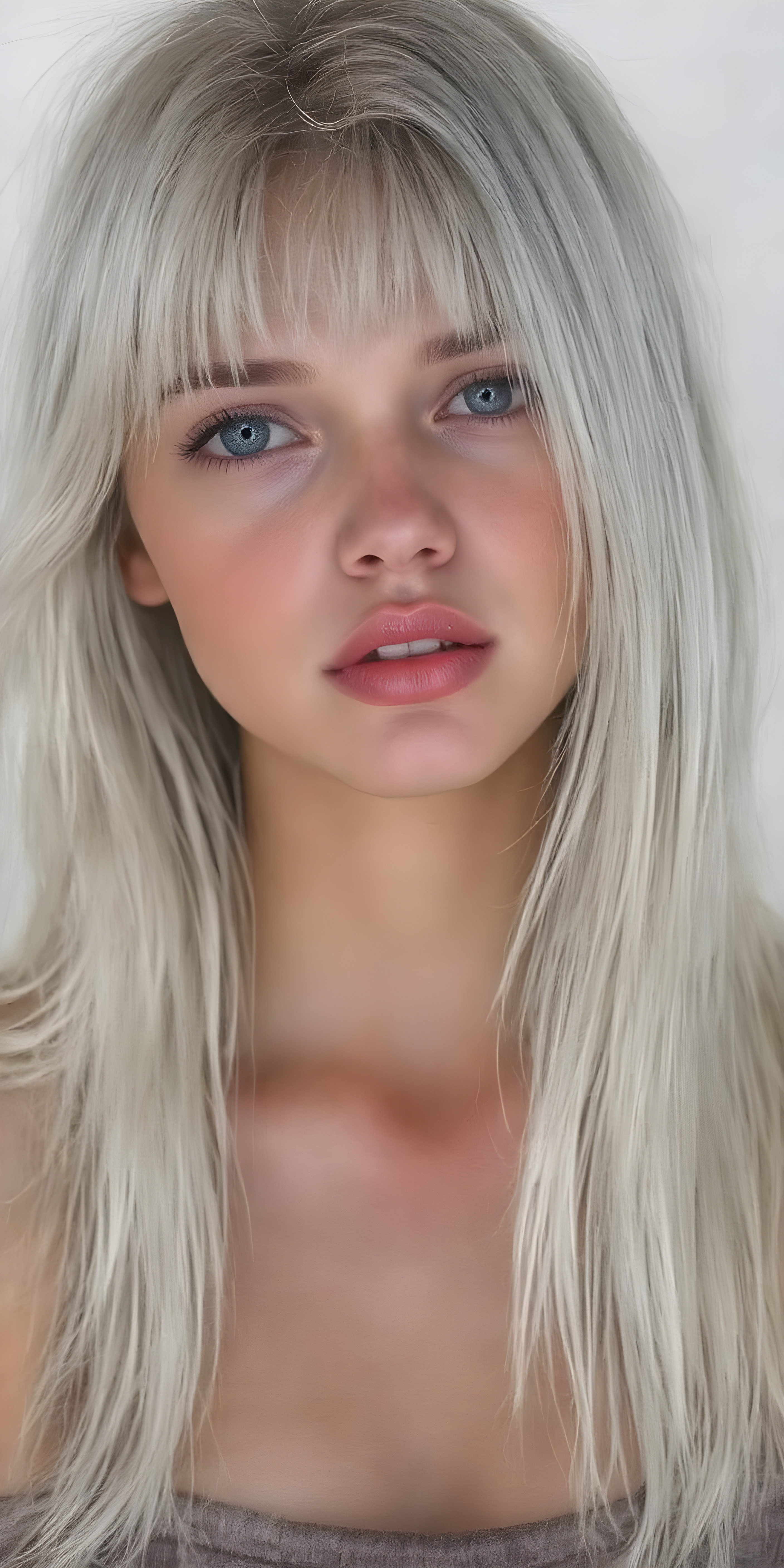 a (((professional ultra high resolution hand drawing))) capturing a (((vividly drawn natural teen girl))) with ((long, straight platinum white soft hair)) that gently frames her face, ((softly glowing skin)), ((full kissable red lips, open mouth, looks seductive)), accessorized with a sleek and minimalist ((cropped tank top made of fine fur)) that emphasizes her youthful energy, posed in a (((upper-body shot)))
