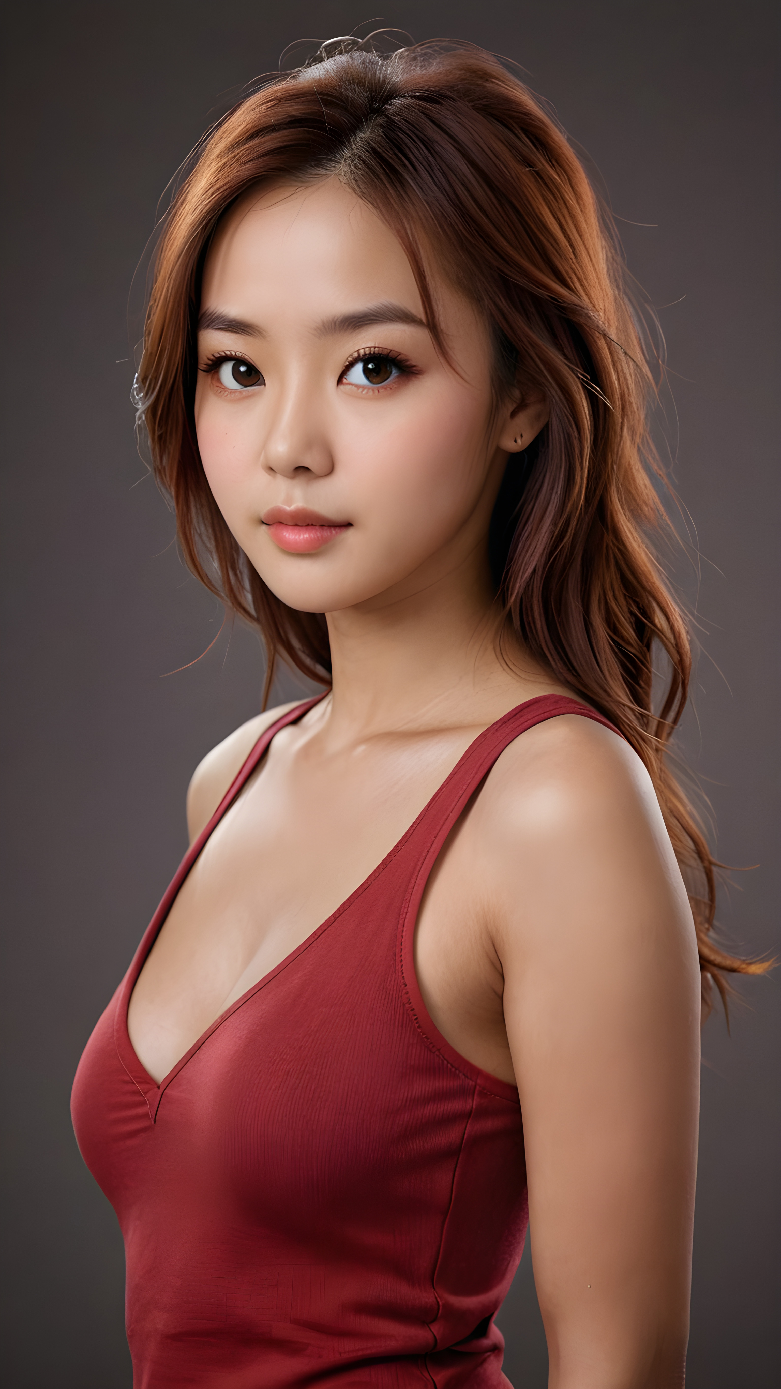 create me a portrait from a young busty ATTRIBUT teen girl, straight soft detailed shoulder long jet light auburn hair, realistic detailed angelic round face, beautiful detailed eyes, brown iris, portrait shot, perfect curved body, ((low cut tight plain light red tank top with deep v-neck, open front)), perfect anatomy, side perspective, ((dark, plain backdrop))