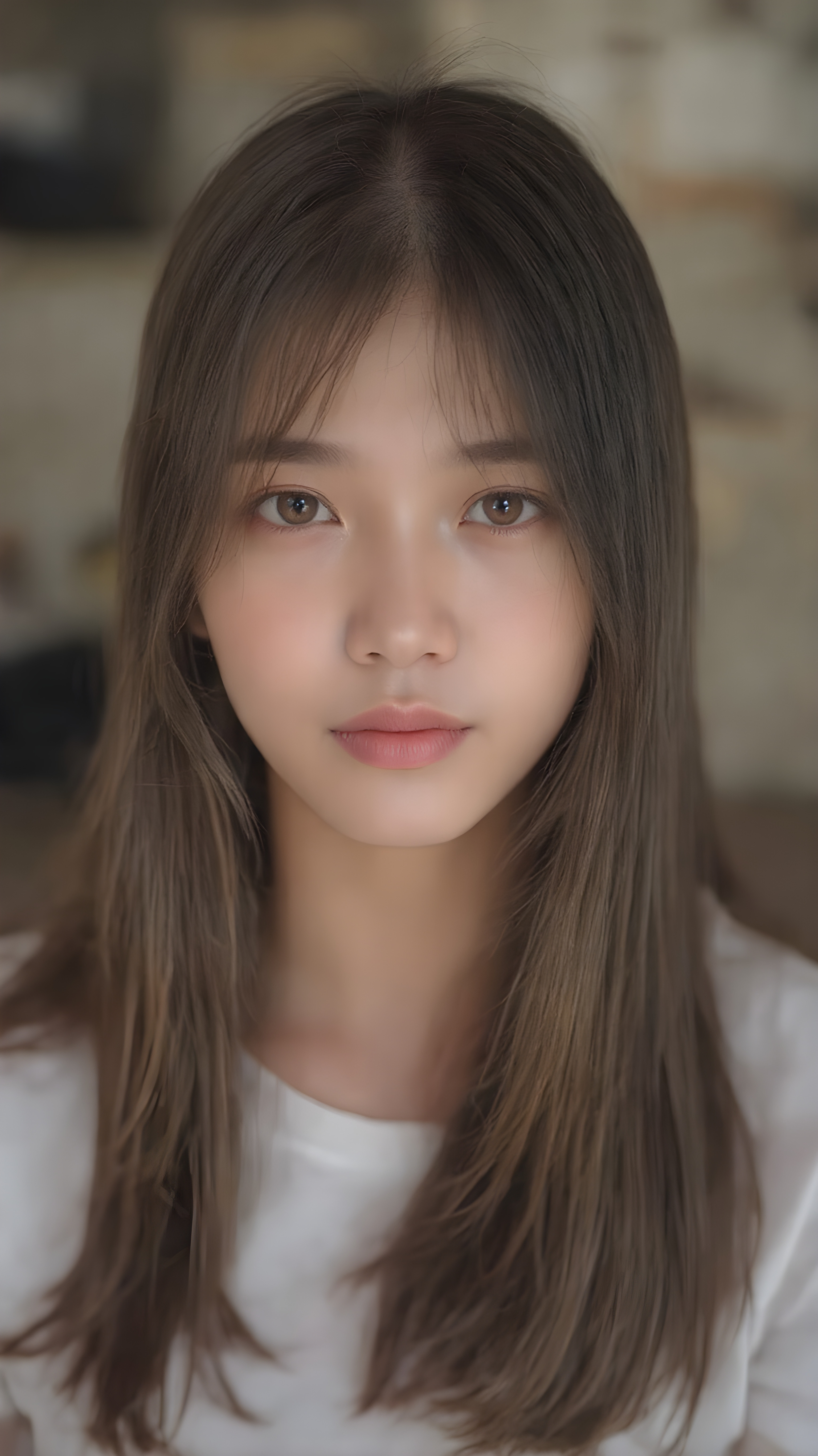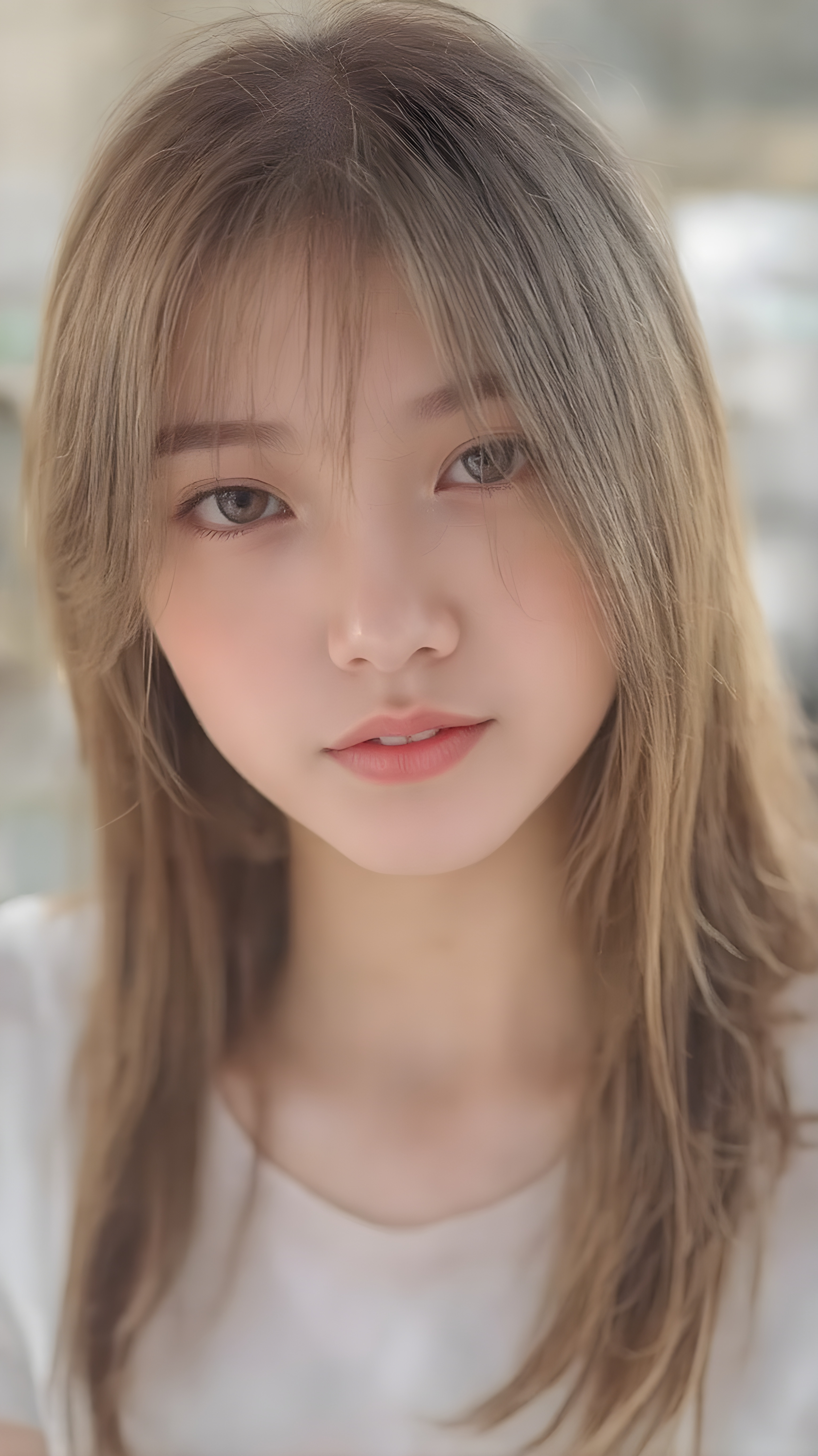 a beautiful, young Asian and Oriental teen girl, ((soft light brown jet straight hair)) ((detailed and realistic hair)), ((detailed, realistic photo)) ((perfect curved body)) ((gorgeous)) ((stunning)) ((cute)), she wears a white short t-shirt