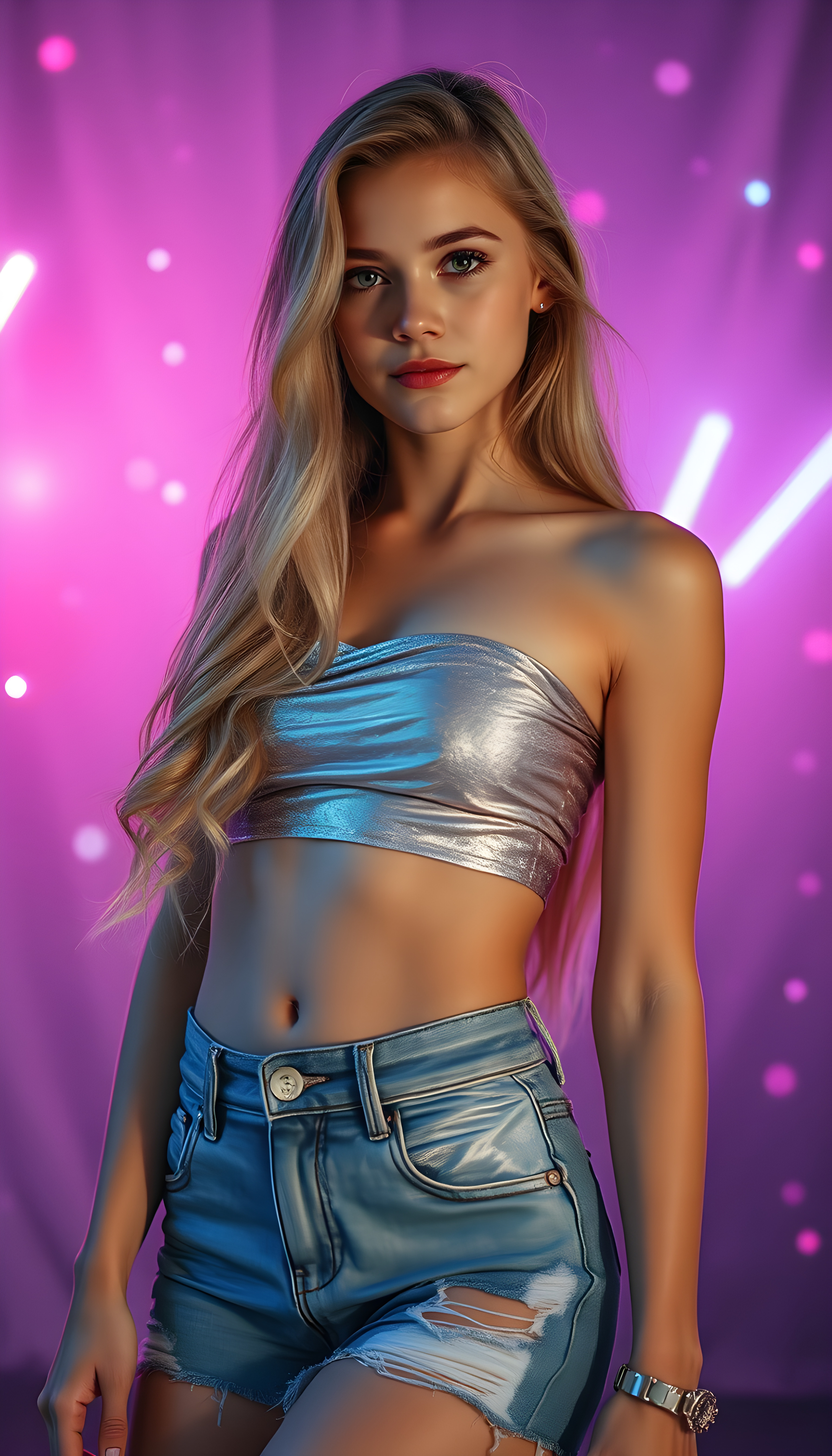 A stunning, confident well busty teenage girl with long, wavy blonde hair poses elegantly in a futuristic, shimmering silver tube top and matching shorts, exuding youthful energy. Her outfit is complemented by her distressed denim jeans, adding a touch of casual coolness. The scene is set against a vibrant, glowing purple backdrop with floating holographic particles, creating a dynamic and futuristic atmosphere. The lighting is bright and soft, highlighting her features and outfit, with a subtle gradient of pink and blue hues in the background, giving the image a lively and imaginative feel.