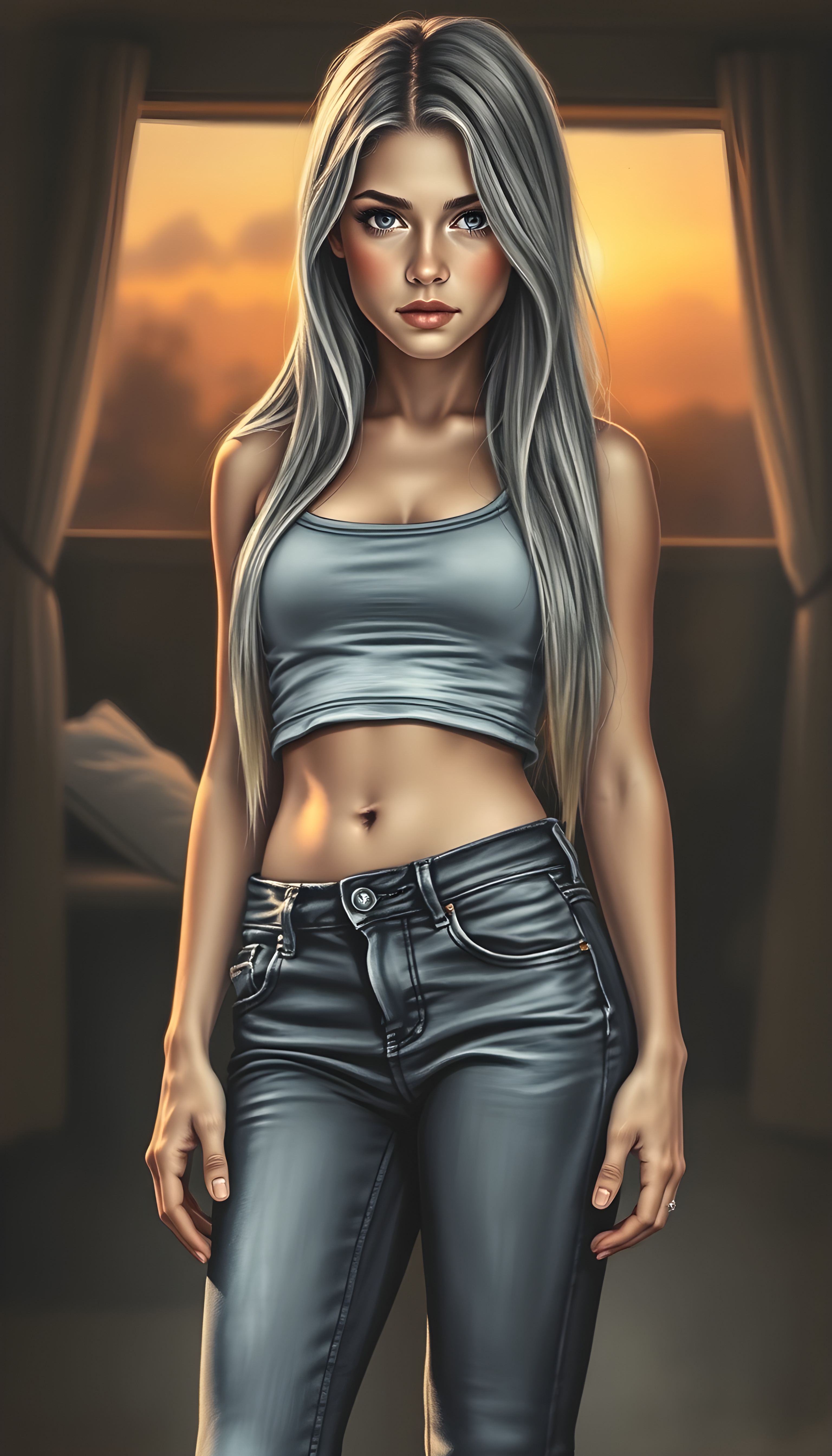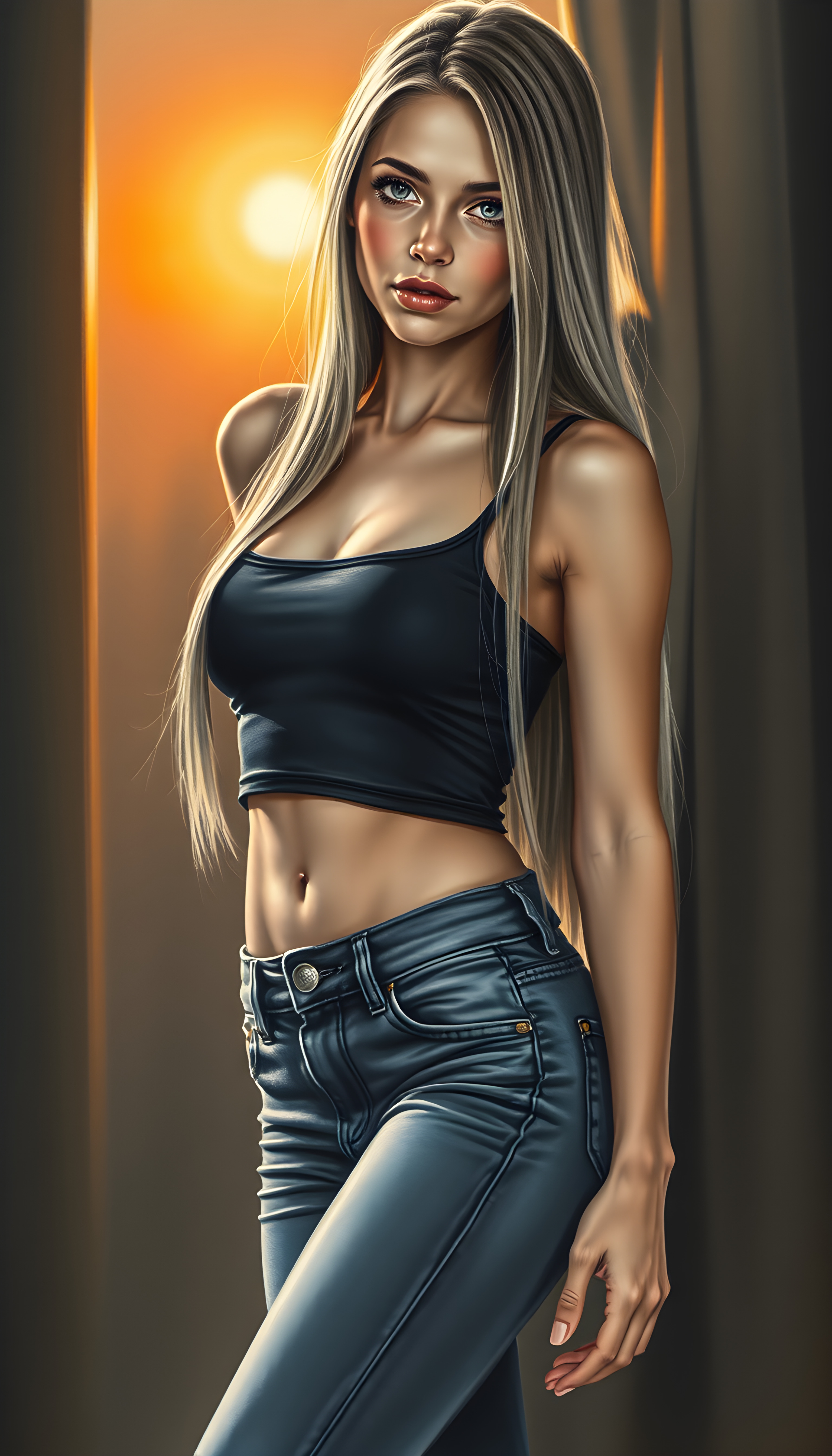 A stunning, full-body charcoal drawing of a young, beautiful girl with a seductive charm, wearing a cropped tank top and tight jeans pants, her long, straight blonde hair cascading down to her waist. Her body is perfectly curved, and her slender, beautifully proportioned belly button is visible. The scene is set in a softly lit, intimate setting, with a hint of a sunset in the background, casting a warm glow on her skin. The artwork is painterly, with intricate details highlighting her features and the texture of her hair.